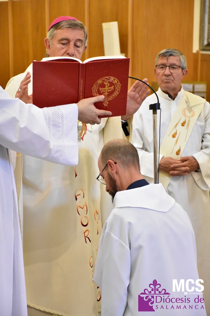 El momento más emotivo llegaría después con la imposición de manos del obispo y la vestición del nuevo diácono, que fue revestido con estola -cruzada- y dalmática por el diácono permanente Juan Bosco. La ceremonia continuó después con la entrega del libro de los Evangelios por parte del obispo Mons. José Luis Retana, su abrazo y el de sus compañeros diáconos que asistían la celebración: José Luis López Redondo y Francisco Sotillo Centeno, y el matrimonio de acólitos Francisco José Jaspe y Marisa Beltrán.