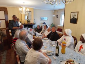 Un momento especial del día fue la comida compartida, que reunió a representantes de las cinco comunidades, junto con el párroco Mariano Montero y el vicario parroquial y obispo emérito de Riobamba, Mons. Julio Parrilla. En un clima de participación y alegría por el encuentro, se compartió mesa y sobremesa. En la conversación, quedó en evidencia la riqueza de la presencia de estos carismas en Santa Marta de Tormes, la labor social que desarrollan, su coordinación y colaboración con la parroquia, así como su sentir diocesano. El obispo expresó su agradecimiento por todo ello e hizo un llamamiento a seguir caminando juntos, siendo mensajeros de esperanza para la gente.