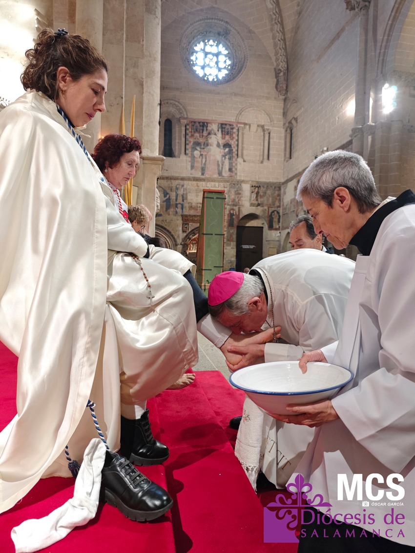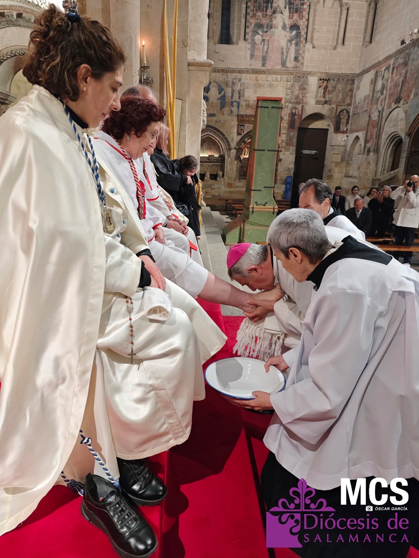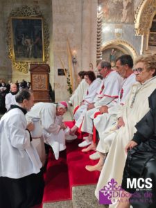 Acto seguido realizó el gesto simbólico del lavatorio de los pies a siete cofrades de cofradías y hermandades que tienen su sede en la Catedral: la del Cristo Yacente de la Misericordia y de la Agonía Redentora, la Dominicana, Jesús Amigo de los Niños y Nuestra Señora de la Soledad, quienes representaban a toda la comunidad diocesana.