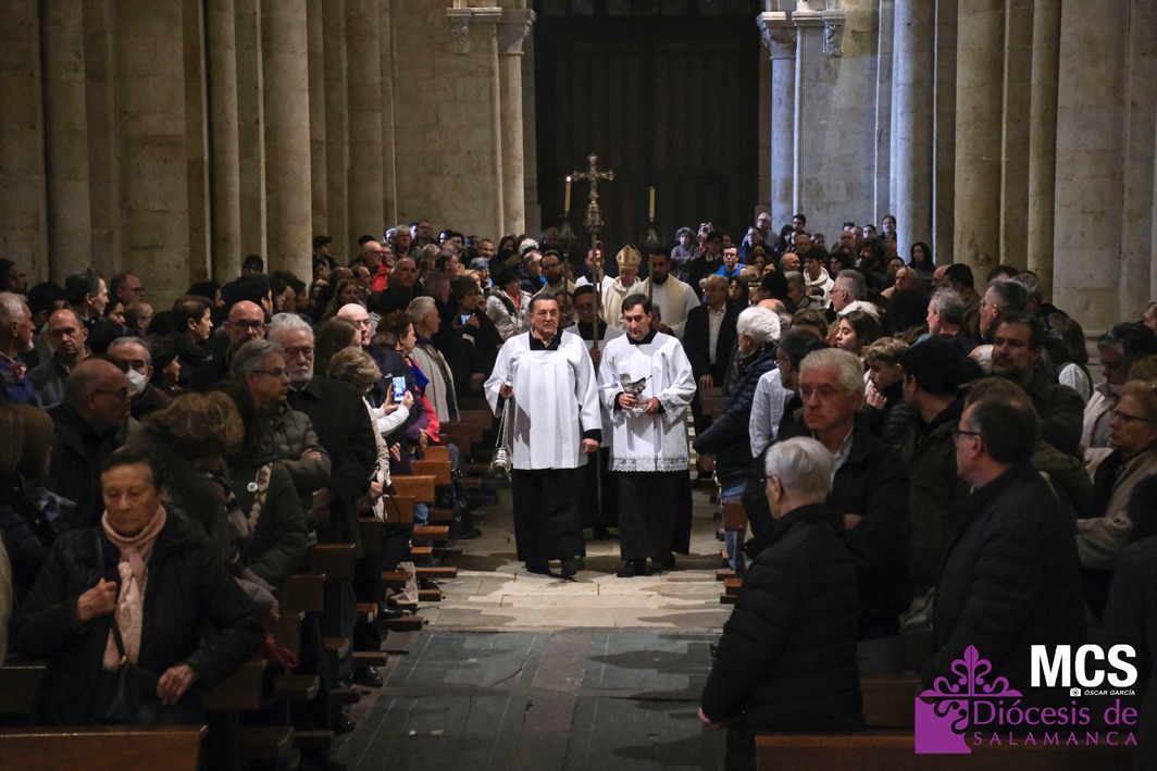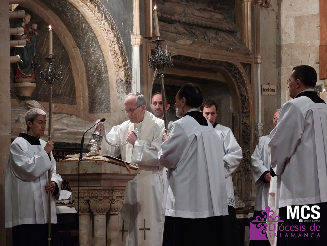 El repique de la campanilla de la sacristía de la Catedral Vieja marcó, a las 18:00 horas de este Jueves Santo, Día del Amor Fraterno, el inicio de la celebración de la Cena del Señor, que abre el Triduo Pascual en la seo salmantina. Un tiempo litúrgico que continúa con el recuerdo de la Pasión de Cristo el Viernes Santo y con la Vigilia pascual del Sábado Santo.