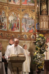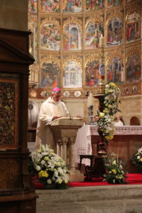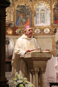 Su homilía estuvo centrada en la resurrección de Jesús. “Esta es la gran noticia que nos llena de alegría. Nos alegramos con Cristo, que ha mostrado la fuerza del amor de Dios, y nos alegramos por nosotros, porque Jesús nos ofrece la libertad del pecado”, afirmaba el prelado al iniciar su prédica. Subrayando que “Jesús es alguien viviente. Una Presencia con quien podemos encontrarnos, transformando desde dentro nuestra vida“. Su resurrección “es el culmen de la Historia de la Salvación: Jesús ha vencido al pecado y a la muerte” y es también “el principio de nuestra justificación y de nuestra futura resurrección”. Por eso, en la noche del Sábado Santo se celebra “la fiesta de las fiestas”, destacaba Mons. Retana.