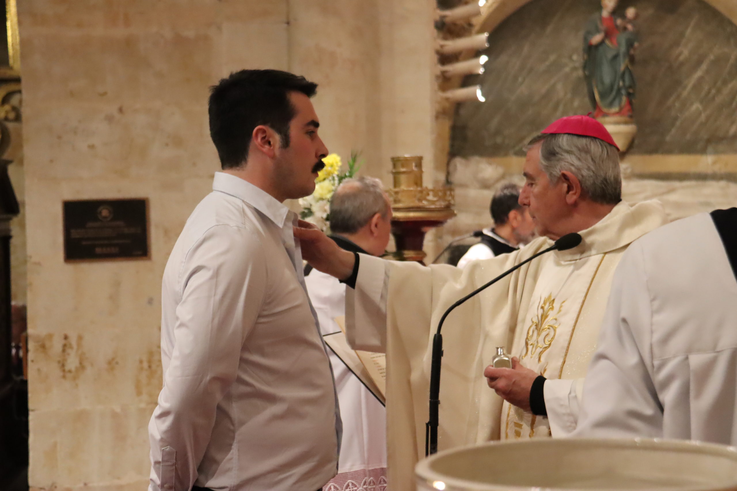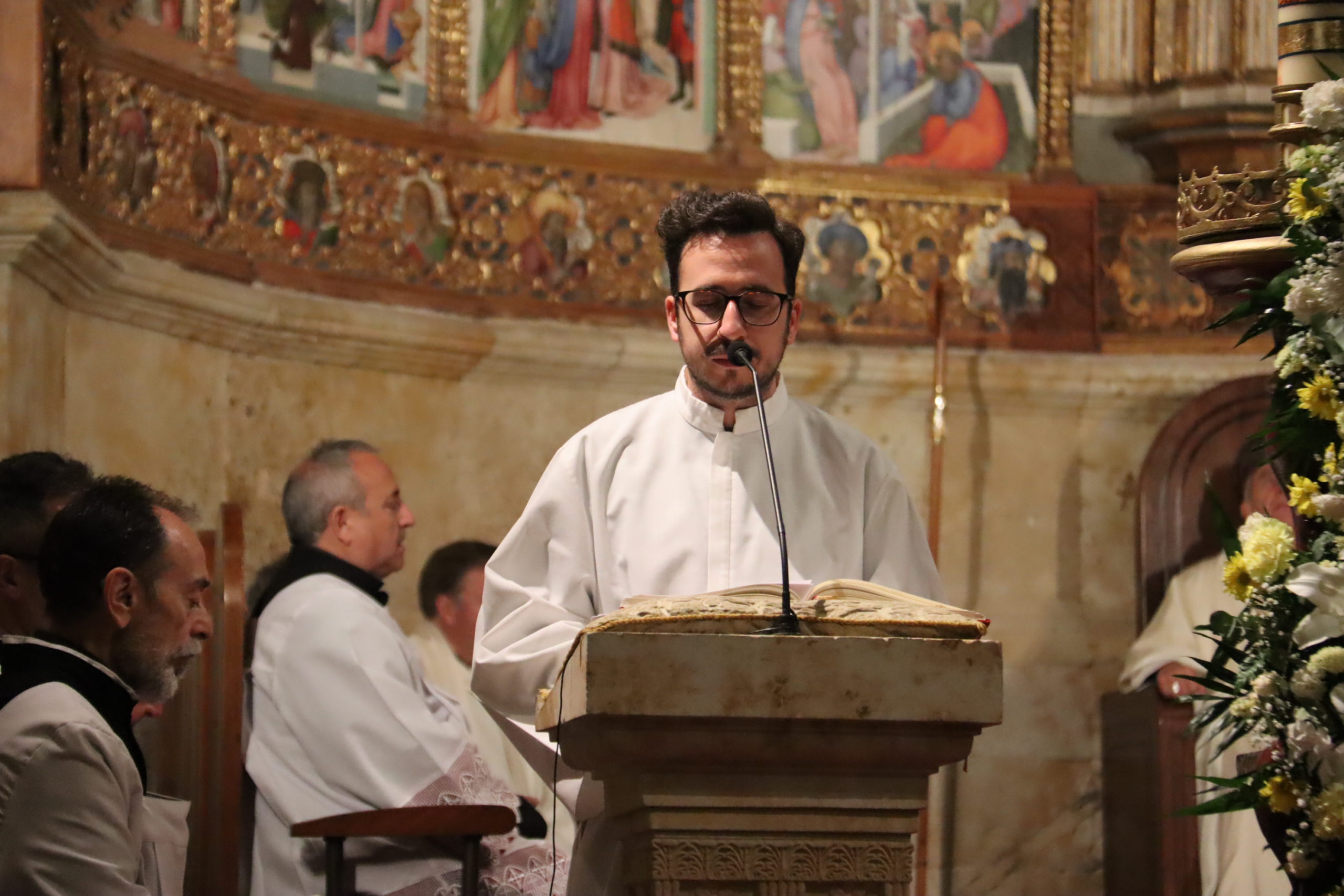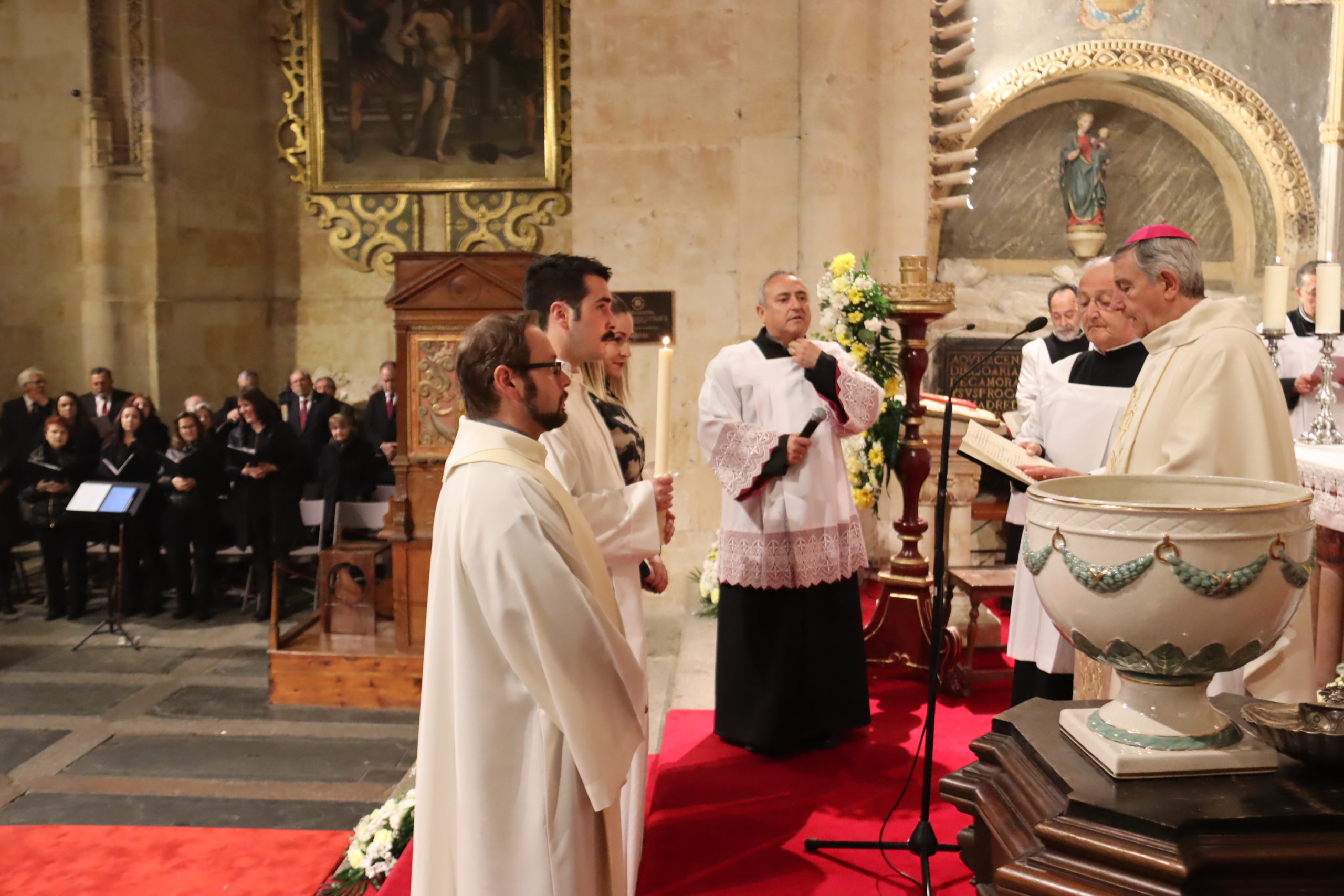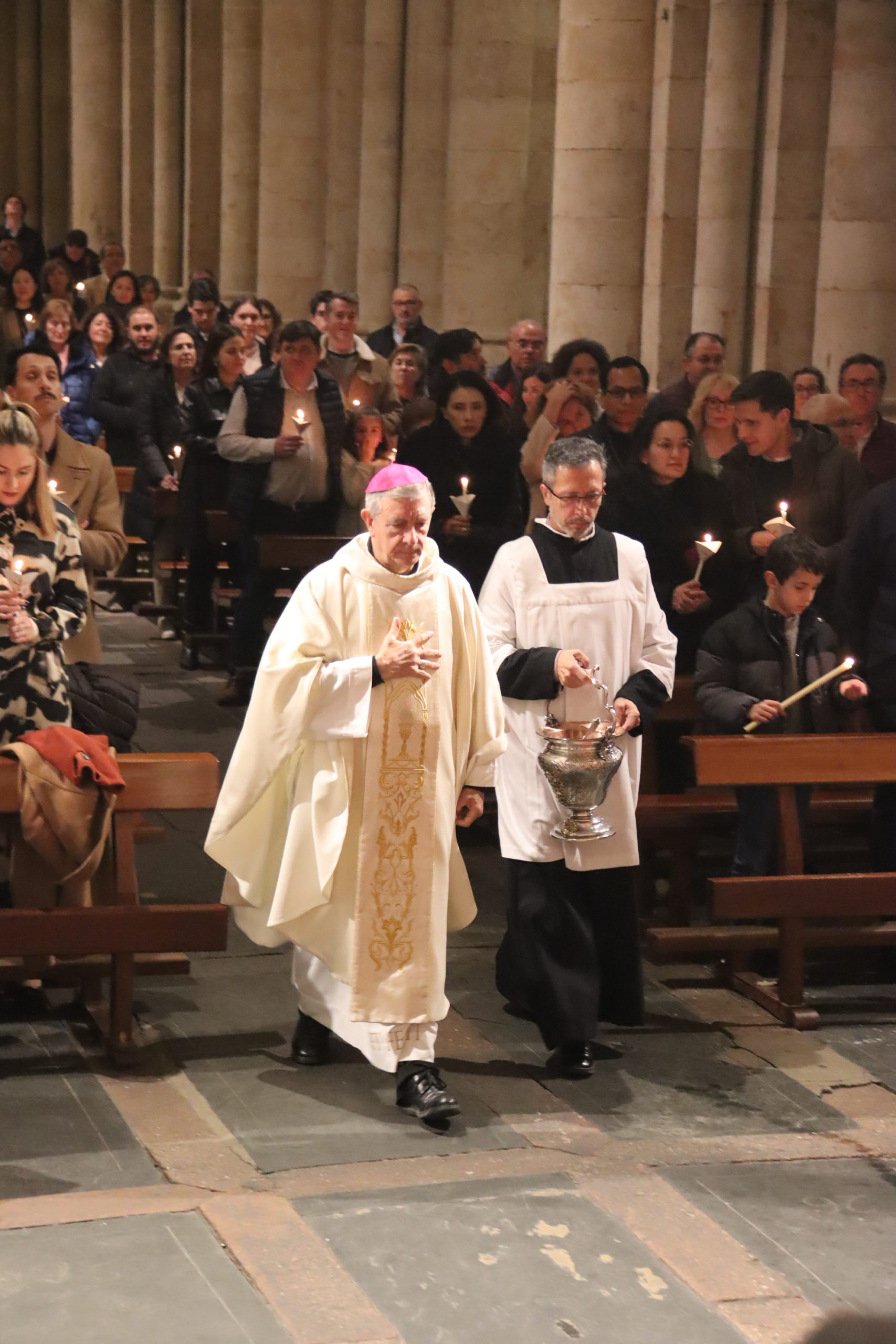Tras bendecir el cirio y entonar la antífona “Luz de Cristo, demos gracias a Dios”, el pastor de la Diócesis de Salamanca ha accedido al interior de la Catedral, solo iluminada con la luz del cirio pascual y de las velas de los sacerdotes concelebrantes, el catecúmeno José Alberto Díaz acompañado de sus padres y padrinos y que durante la vigilia iba a recibir los sacramentos de la iniciación cristiana, así como el pueblo de Dios allí congregado.