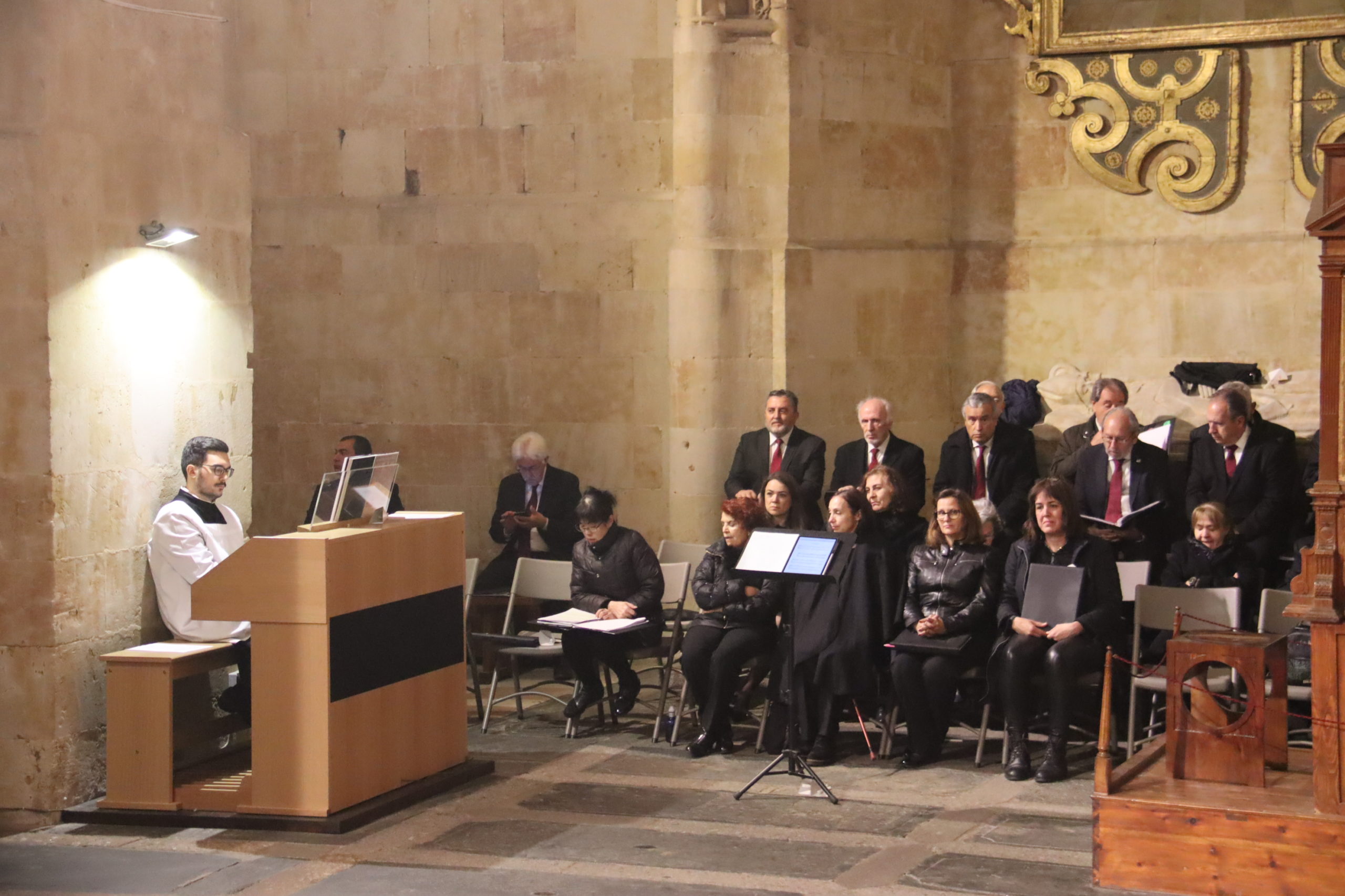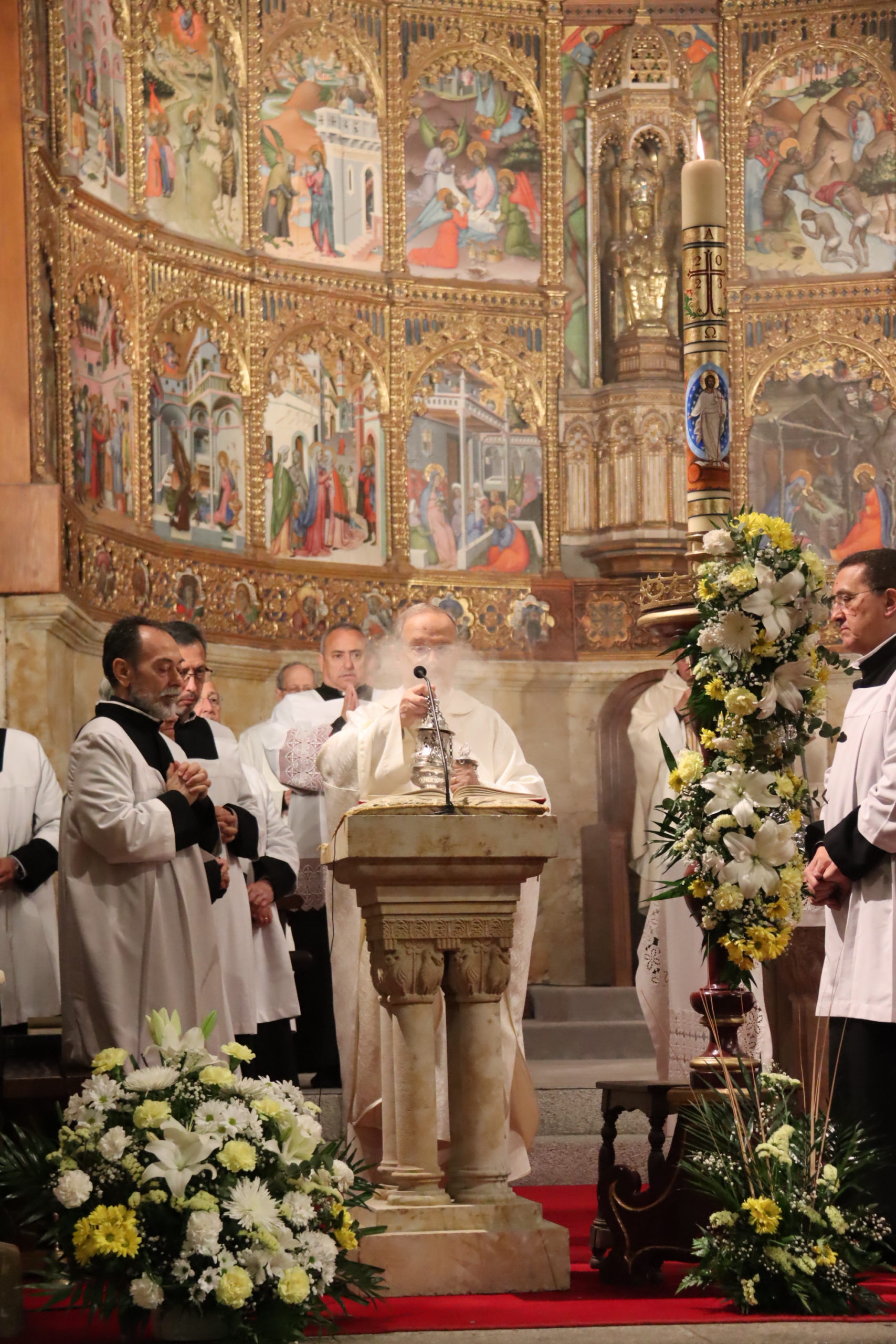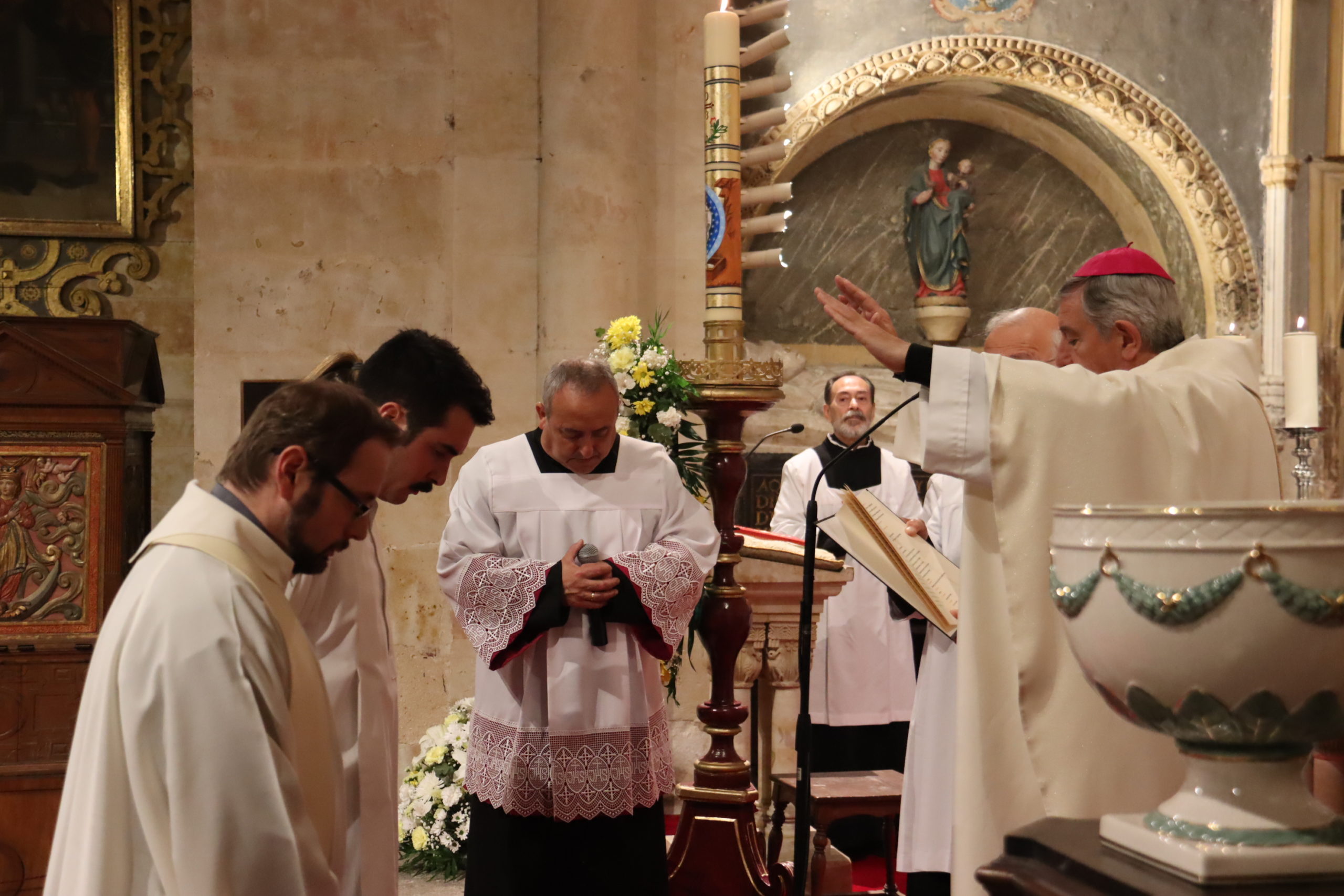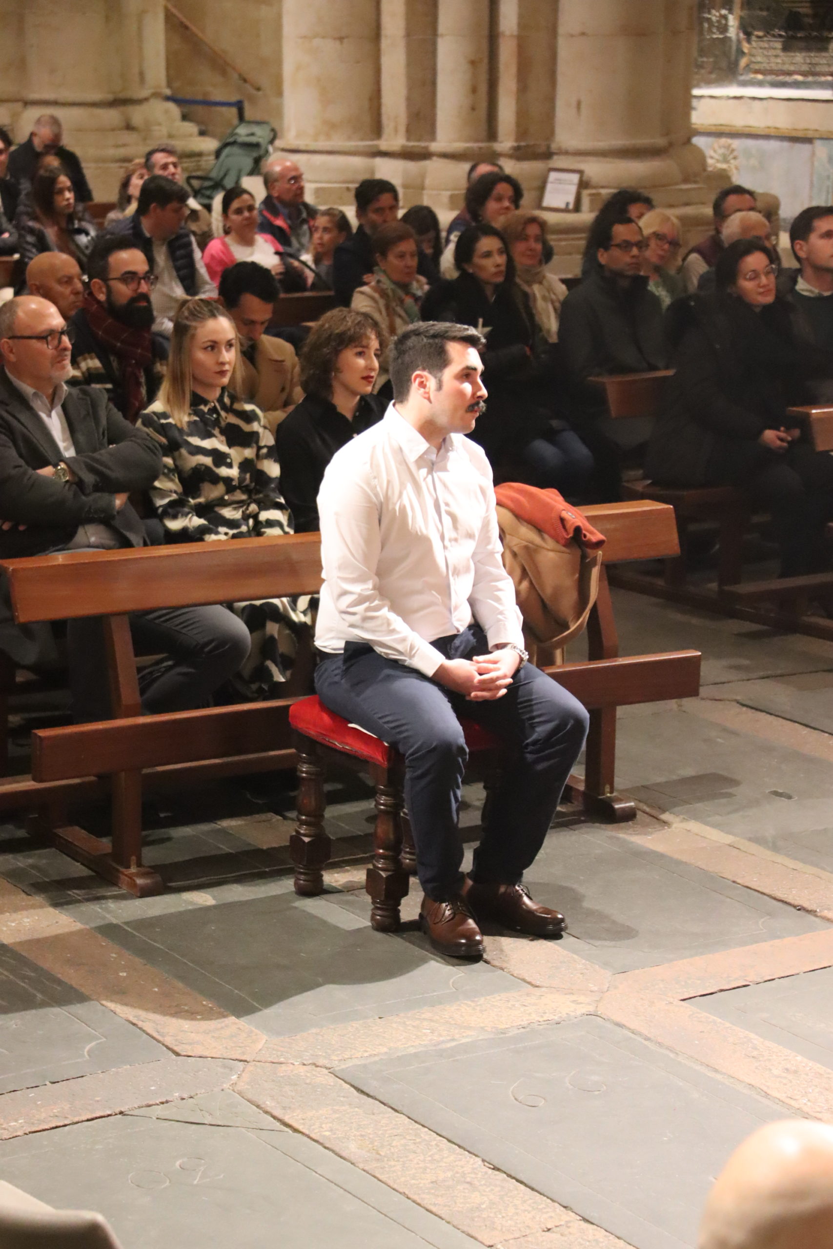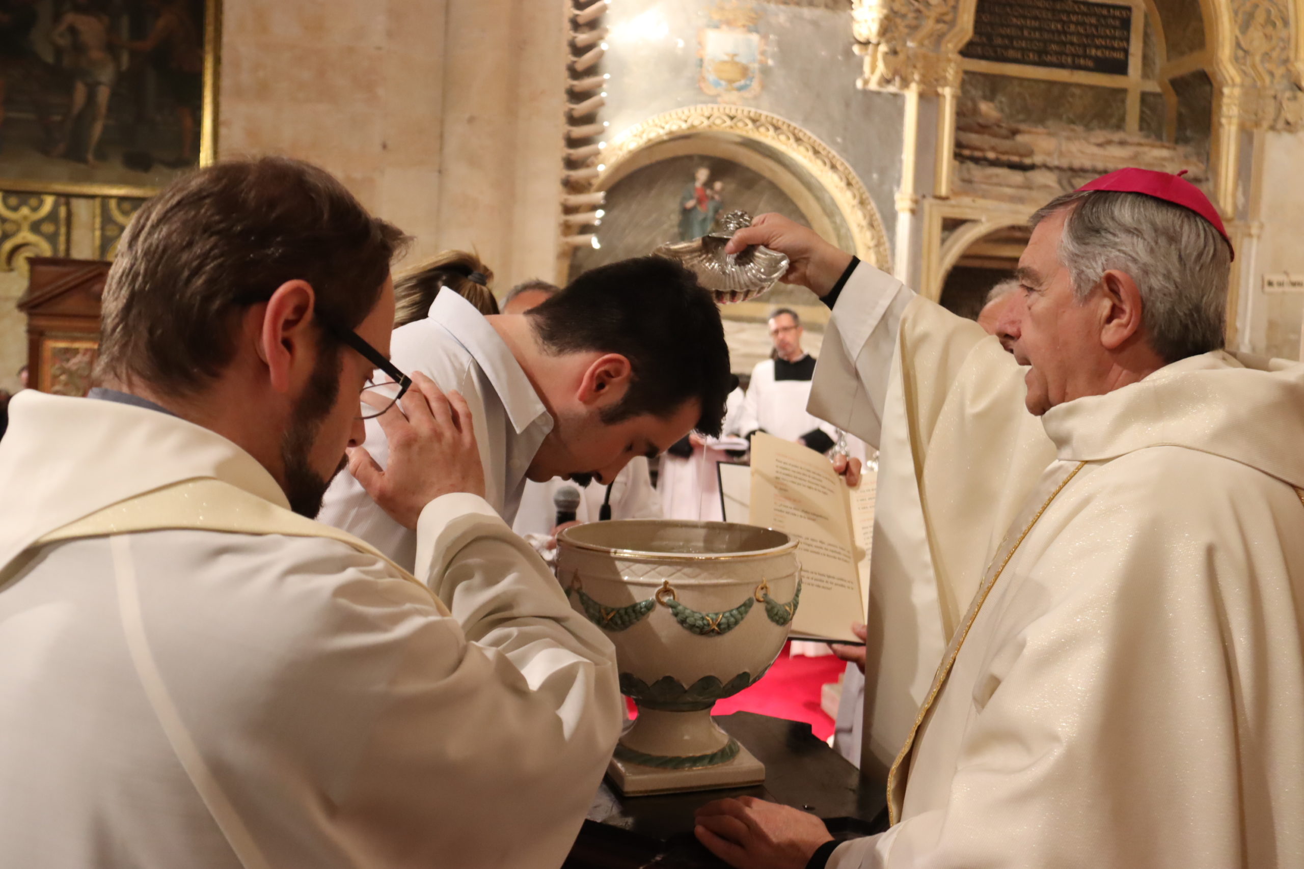 Tras bendecir el cirio y entonar la antífona “Luz de Cristo, demos gracias a Dios”, el pastor de la Diócesis de Salamanca ha accedido al interior de la Catedral, solo iluminada con la luz del cirio pascual y de las velas de los sacerdotes concelebrantes, el catecúmeno José Alberto Díaz acompañado de sus padres y padrinos y que durante la vigilia iba a recibir los sacramentos de la iniciación cristiana, así como el pueblo de Dios allí congregado.