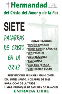 La Hermandad del Cristo del Amor y de la Paz celebra este Lunes Santo, 3 de abril, a las 20:00 horas, la meditación colectiva sobre las últimas Siete Palabras de Cristo en la Cruz, en la iglesia de San Juan de Sahagún, y que en esta ocasión, contará con la participación del obispo de Salamanca, Mons. José Luis Retana.