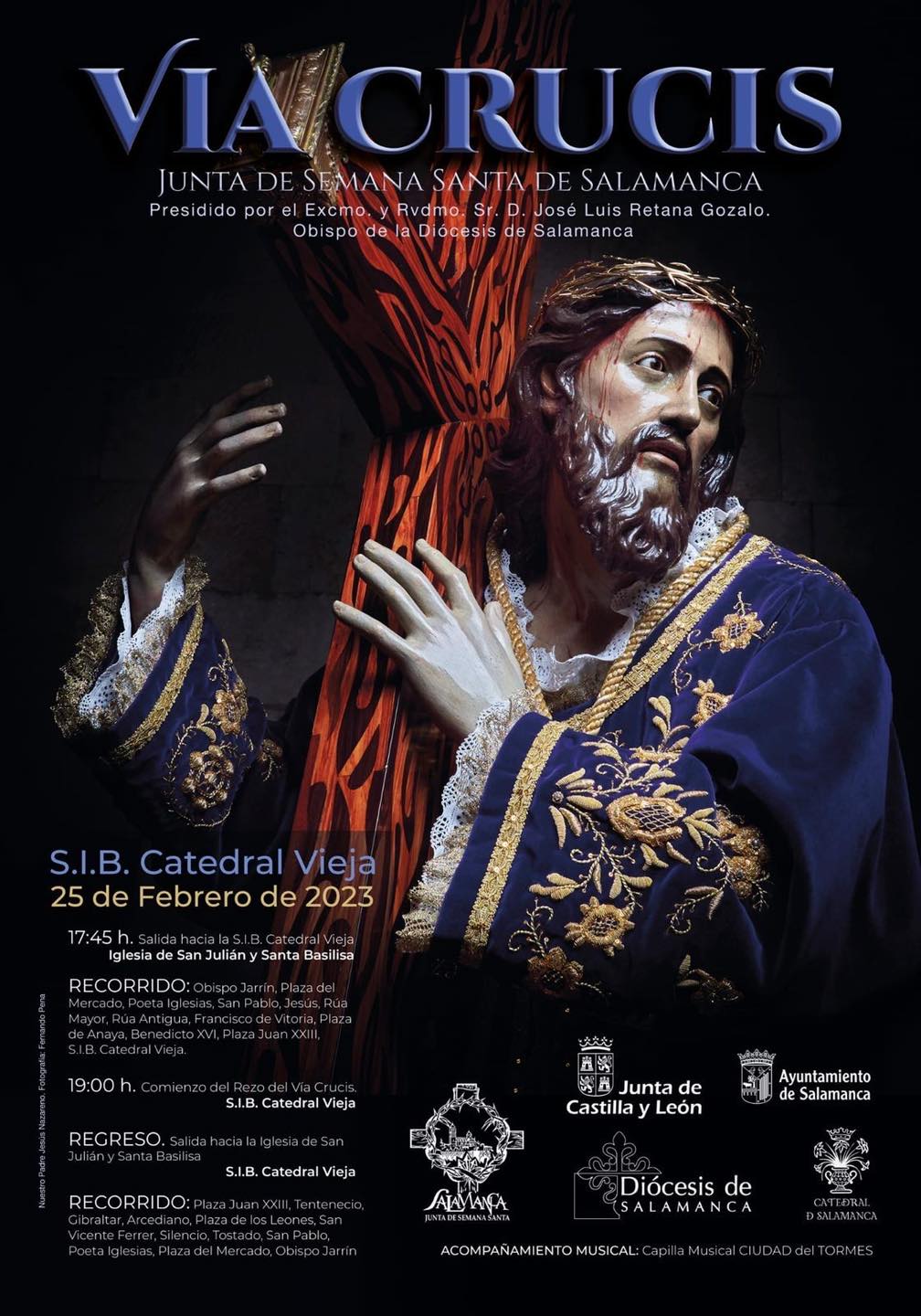El rezo del vía crucis iniciará a las 19:00 horas, presidido por el obispo de la Diócesis de Salamanca, Mons. José Luis Retana, y una vez finalice, comenzará el regreso de Nuestro Padre Jesús Nazareno a su templo. En concreto, recorrerán la plaza Juan XXIII, Tentenecio, Gibraltar, Acerdiano, plaza de los Leones, San Vicente Ferrer, Silencio, Tostado, San Pablo, Poeta Iglesias, plaza del Mercado y Obispo Jarrín.