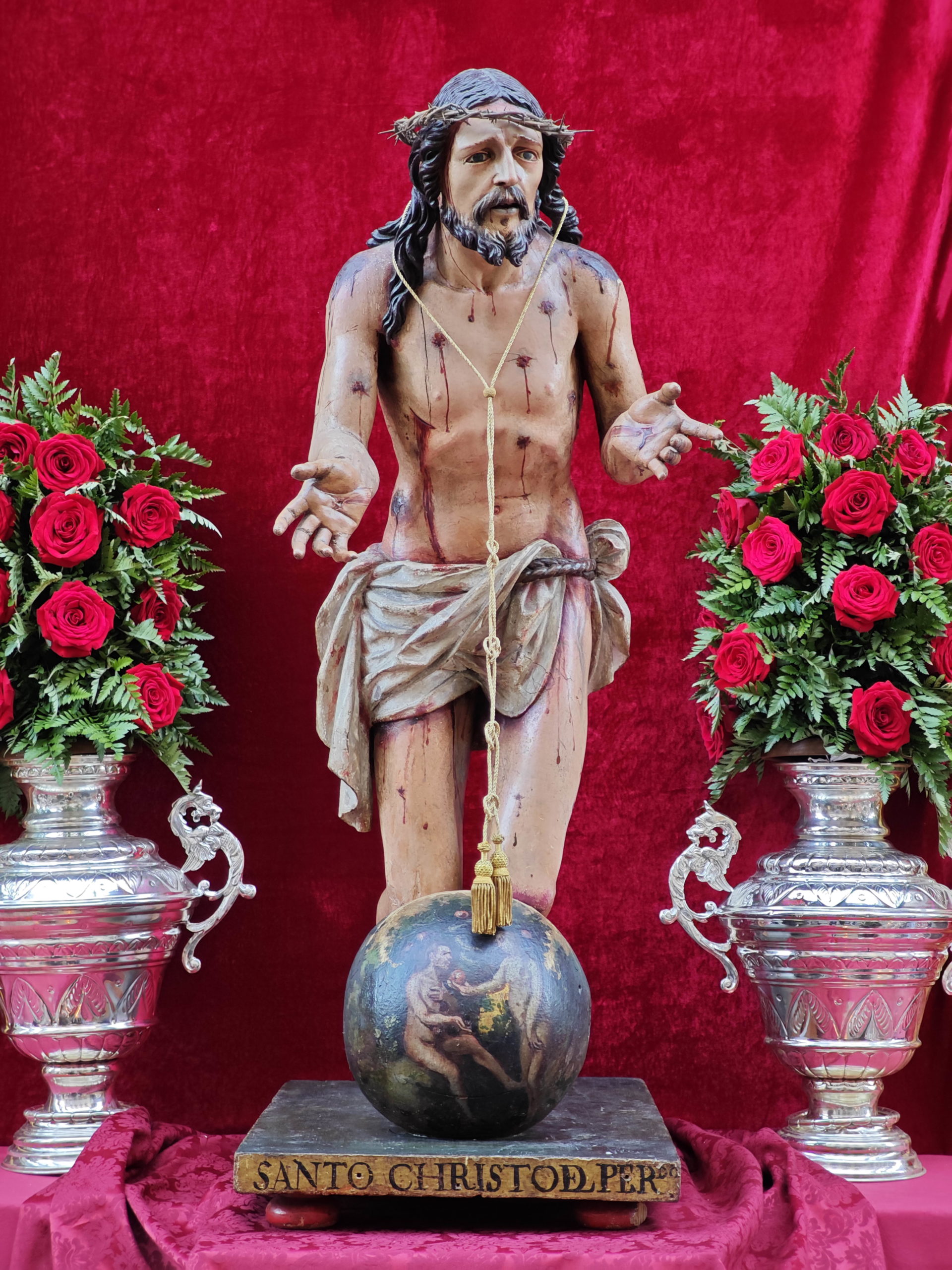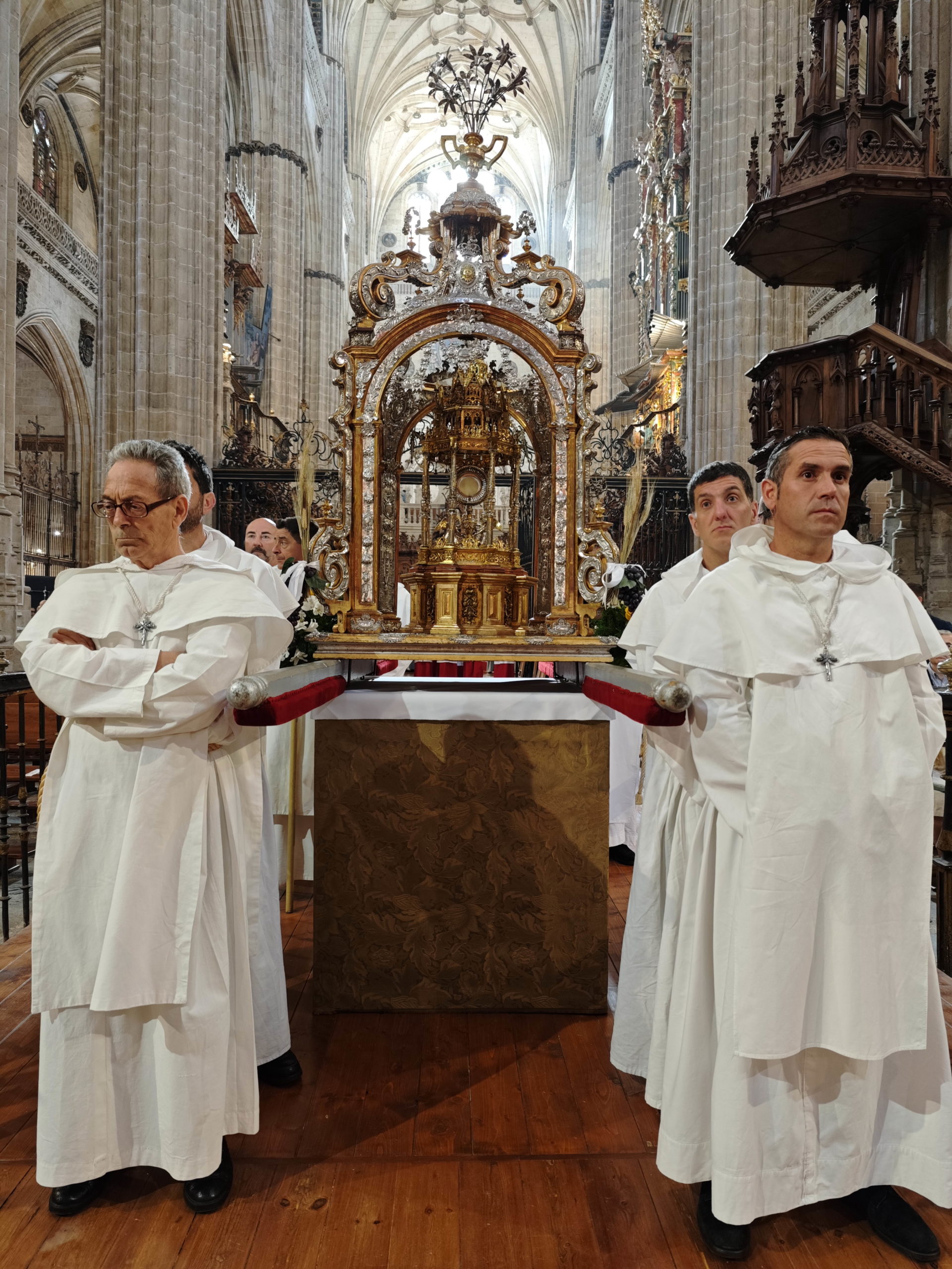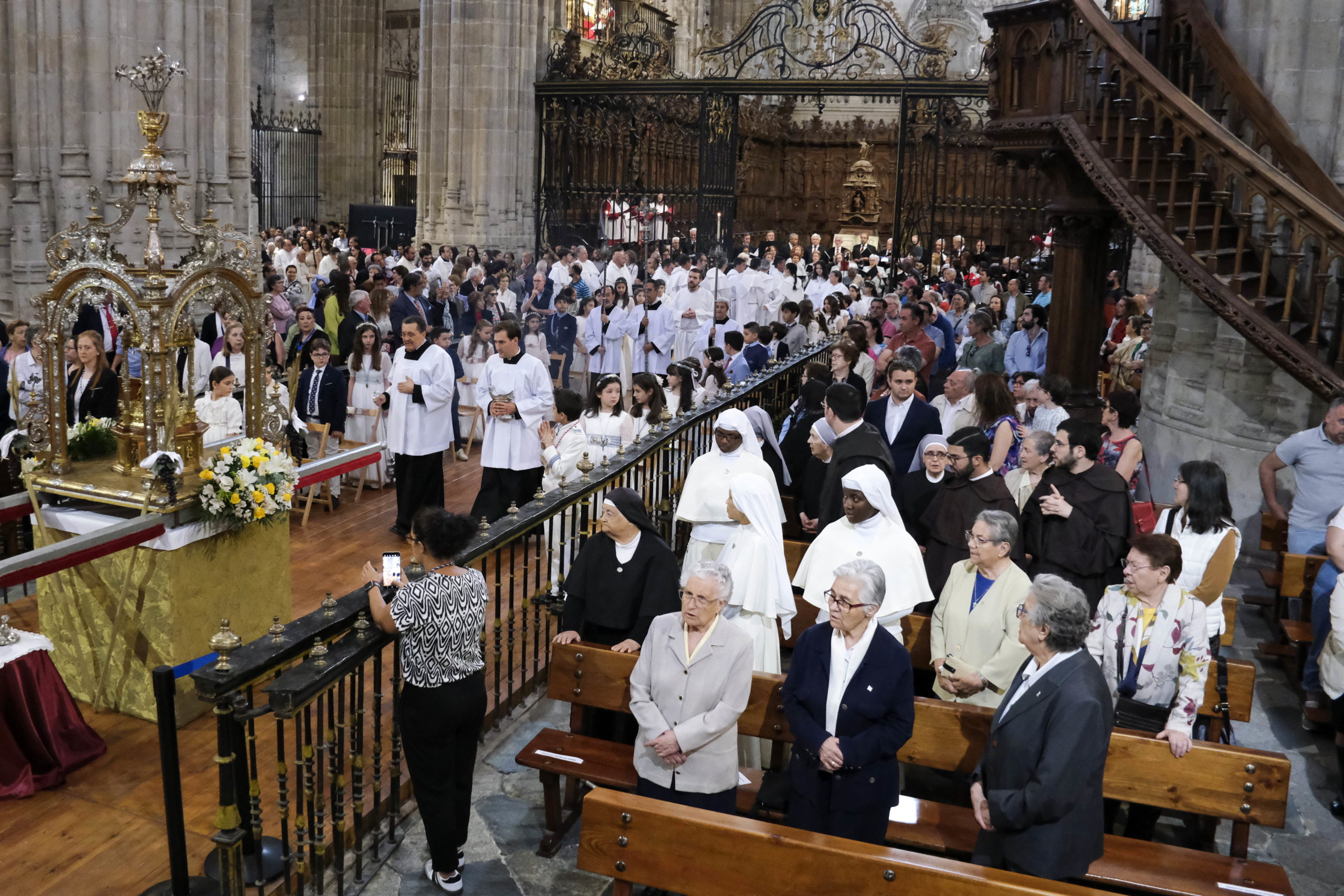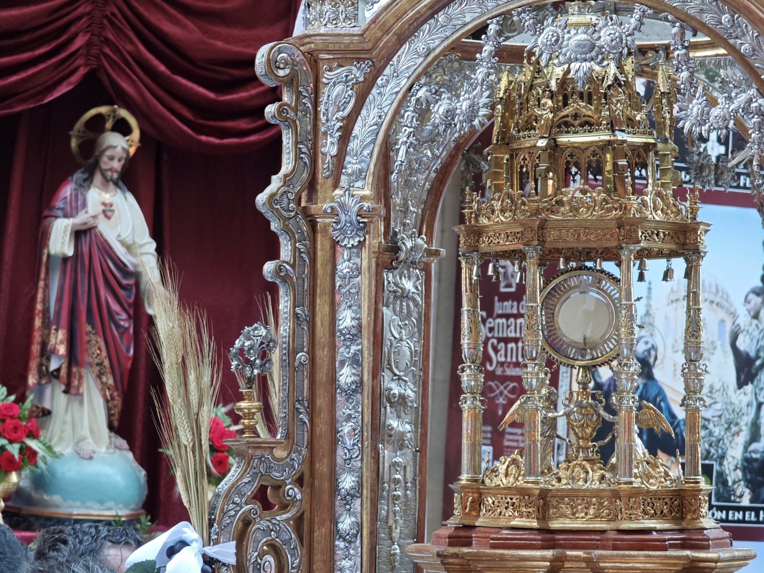 Y el último altar estaba ubicado junto a la puerta de la iglesia de San Benito, de la Hermandad de Nuestro Padre Jesús Despojado, donde un grupo de niños tocaron unas campanillas a la llegada de la custodia. Este altar tenía la bandera sacramental, que lleva bordado un cordero y la inscripción: “Señor mío y Dios mío”. Además, se colocó la custodia de la parroquia de San Sebastián y dos reliquias, un de Santa Teresa de Jesús, y otra, de Santa Bonifacia Rodríguez de Castro. Tampoco faltó la decoración propia del Corpus Christi de uvas y trigo.