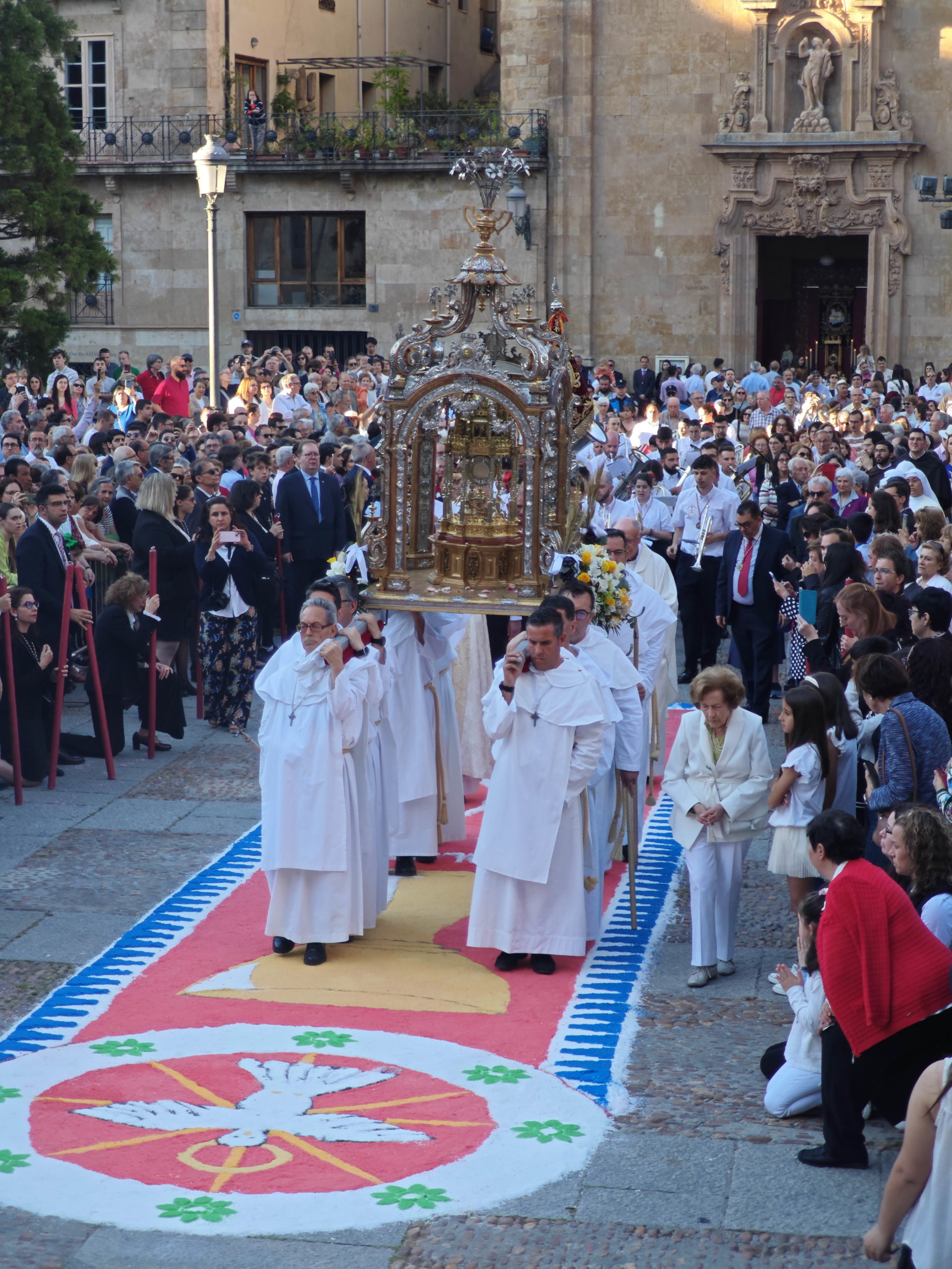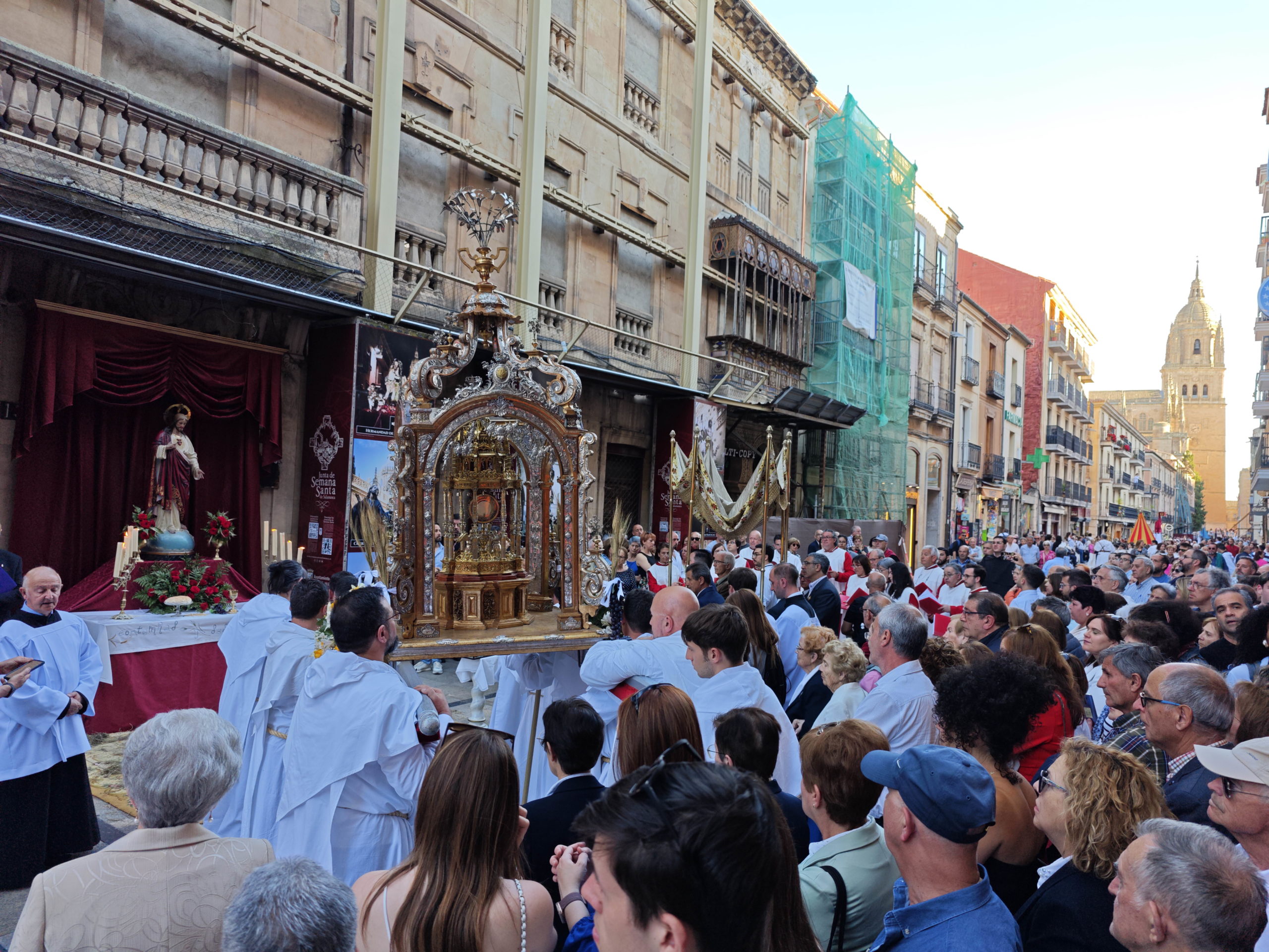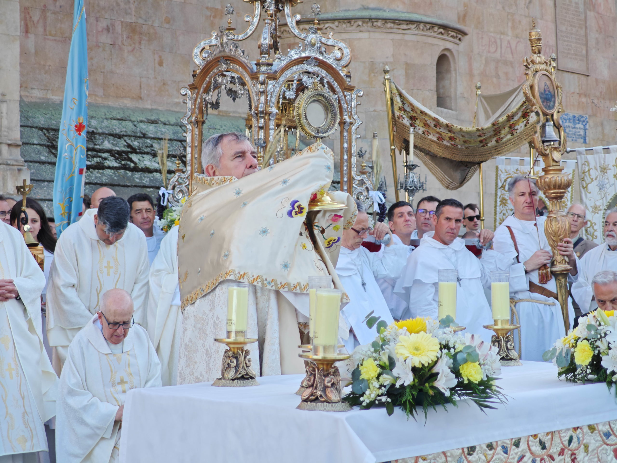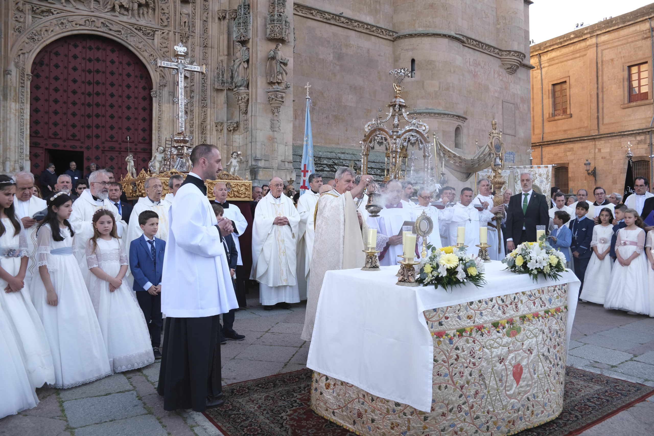 La fiesta del Cuerpo y la Sangre de Cristo se celebró este domingo en Salamanca con una eucaristía, en la Catedral Nueva, y la procesión por las calles del centro de la ciudad. Cientos de fieles se sumaron a ambas celebraciones, que tienen lugar 60 días después del Domingo de Resurrección. En la solemnidad del Corpus Christi, los católicos recuerdan la institución de la eucaristía, llevada a cabo el Jueves Santo, durante la Última Cena, al convertir Jesús el pan y vino en su Cuerpo y en su Sangre.