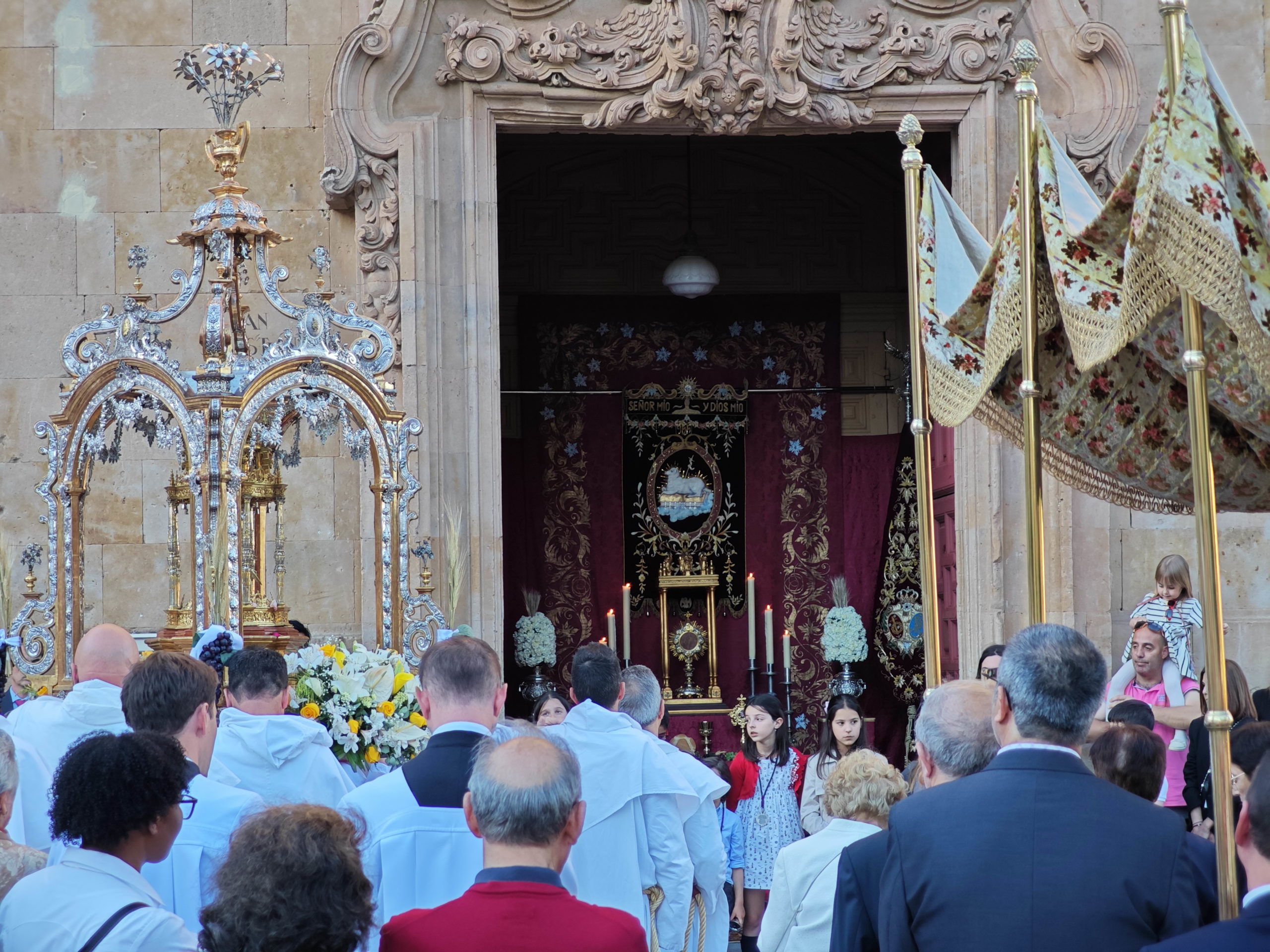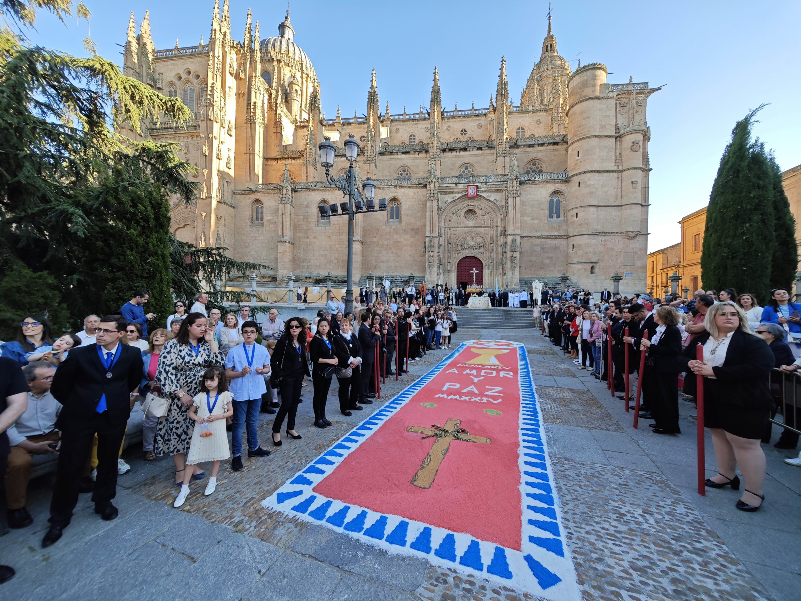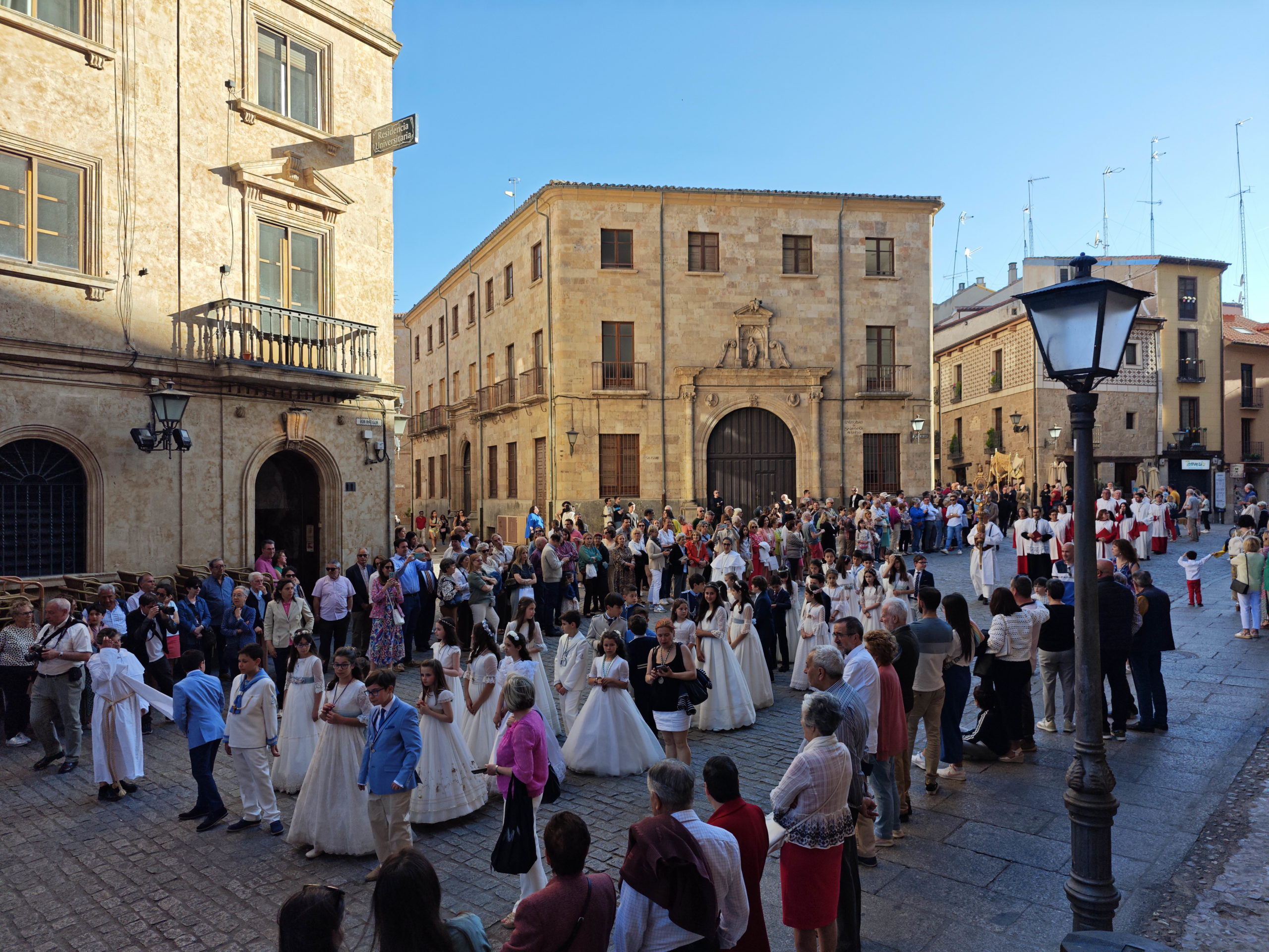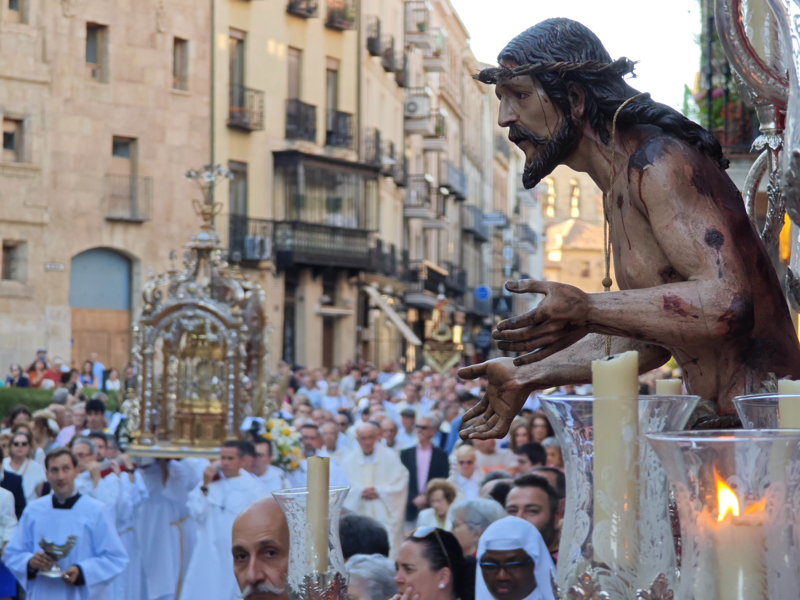 La fiesta del Cuerpo y la Sangre de Cristo se celebró este domingo en Salamanca con una eucaristía, en la Catedral Nueva, y la procesión por las calles del centro de la ciudad. Cientos de fieles se sumaron a ambas celebraciones, que tienen lugar 60 días después del Domingo de Resurrección. En la solemnidad del Corpus Christi, los católicos recuerdan la institución de la eucaristía, llevada a cabo el Jueves Santo, durante la Última Cena, al convertir Jesús el pan y vino en su Cuerpo y en su Sangre.