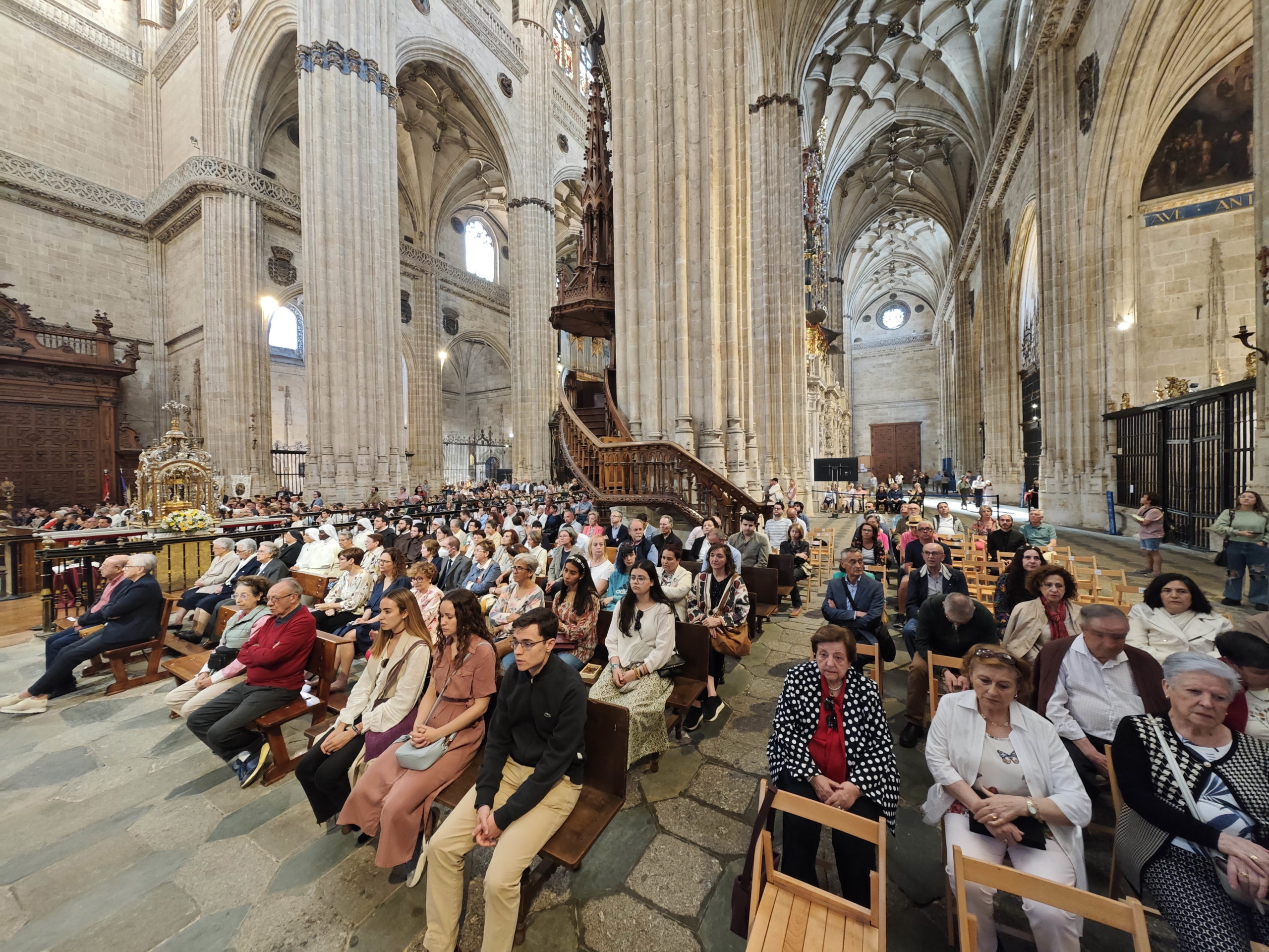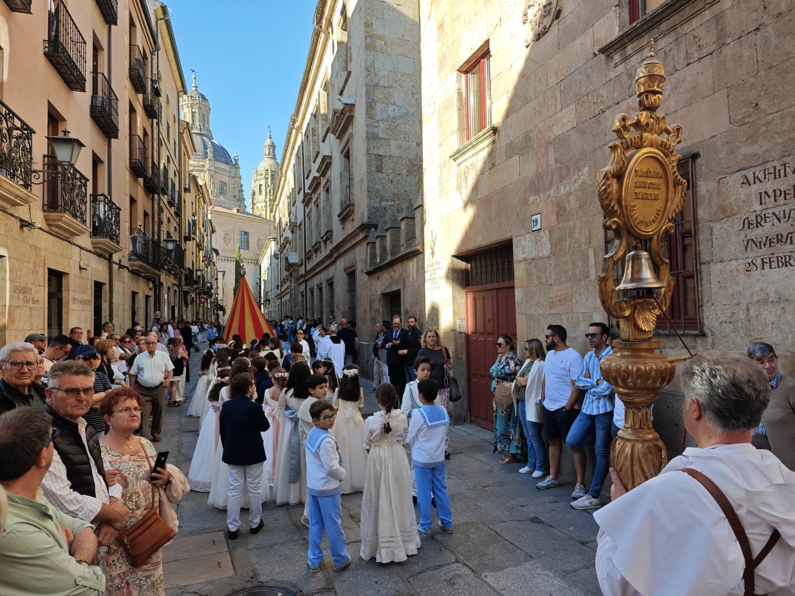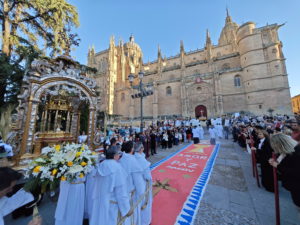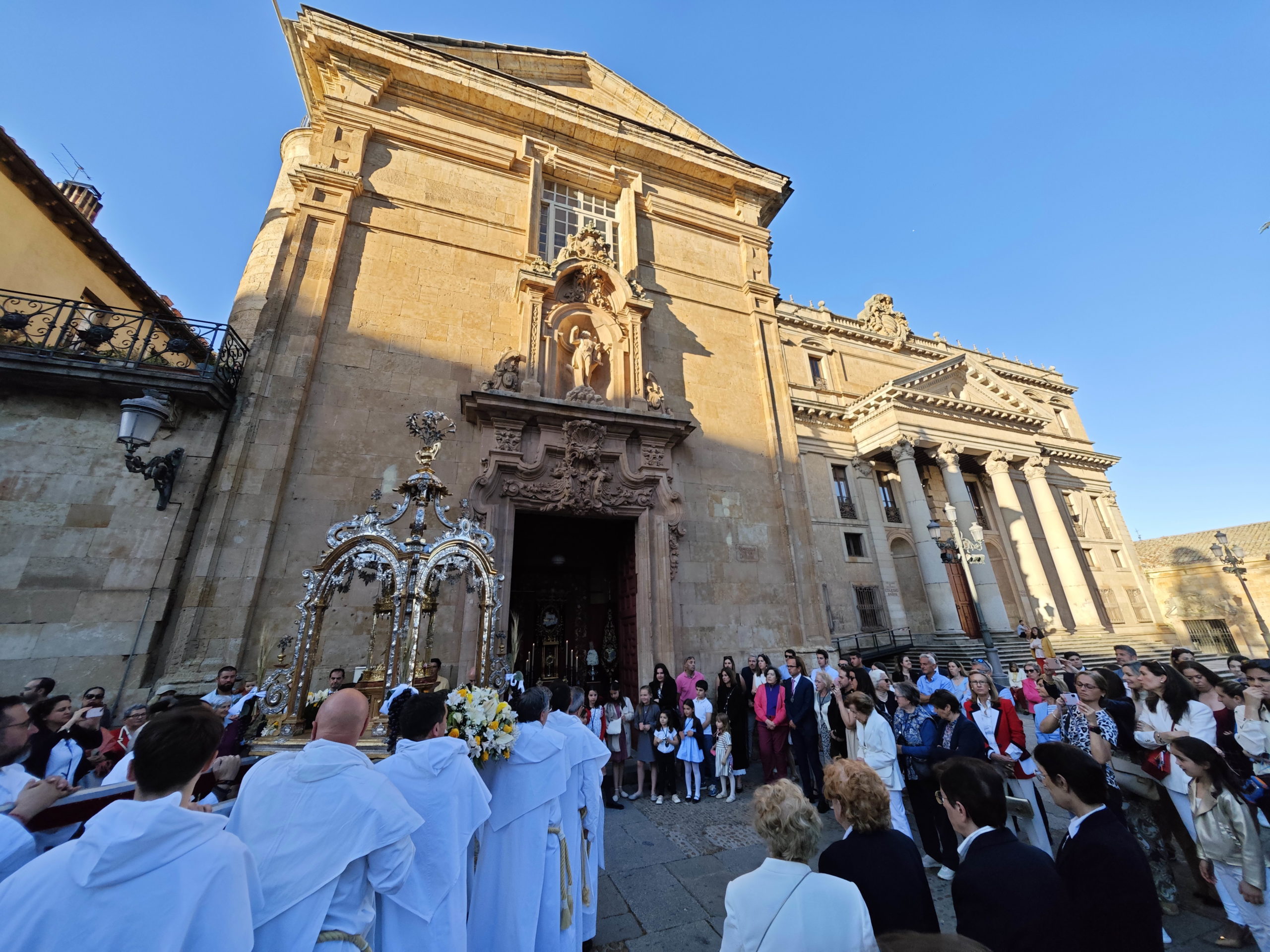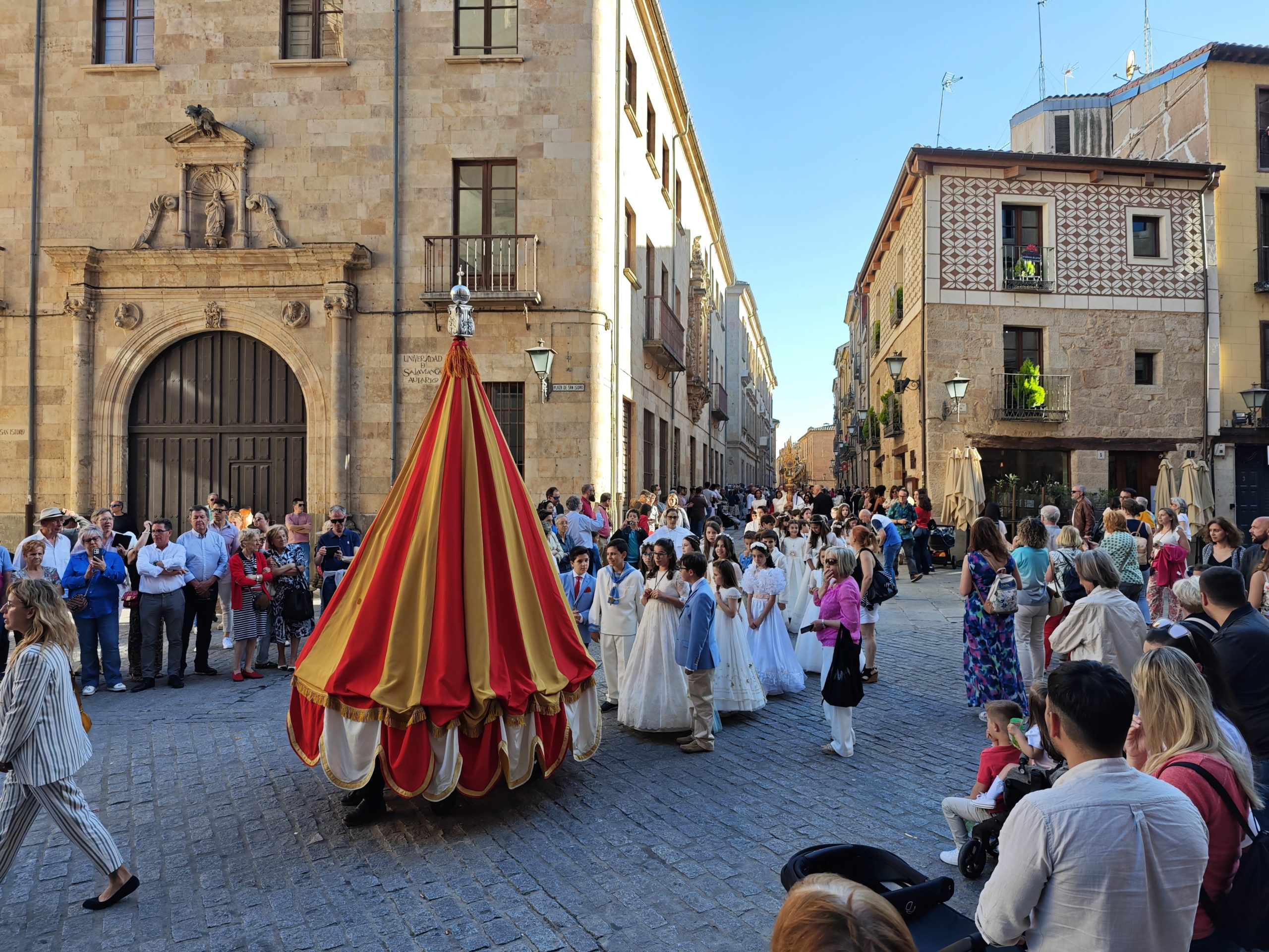 La fiesta del Cuerpo y la Sangre de Cristo se celebró este domingo en Salamanca con una eucaristía, en la Catedral Nueva, y la procesión por las calles del centro de la ciudad. Cientos de fieles se sumaron a ambas celebraciones, que tienen lugar 60 días después del Domingo de Resurrección. En la solemnidad del Corpus Christi, los católicos recuerdan la institución de la eucaristía, llevada a cabo el Jueves Santo, durante la Última Cena, al convertir Jesús el pan y vino en su Cuerpo y en su Sangre.