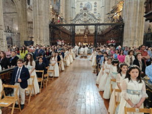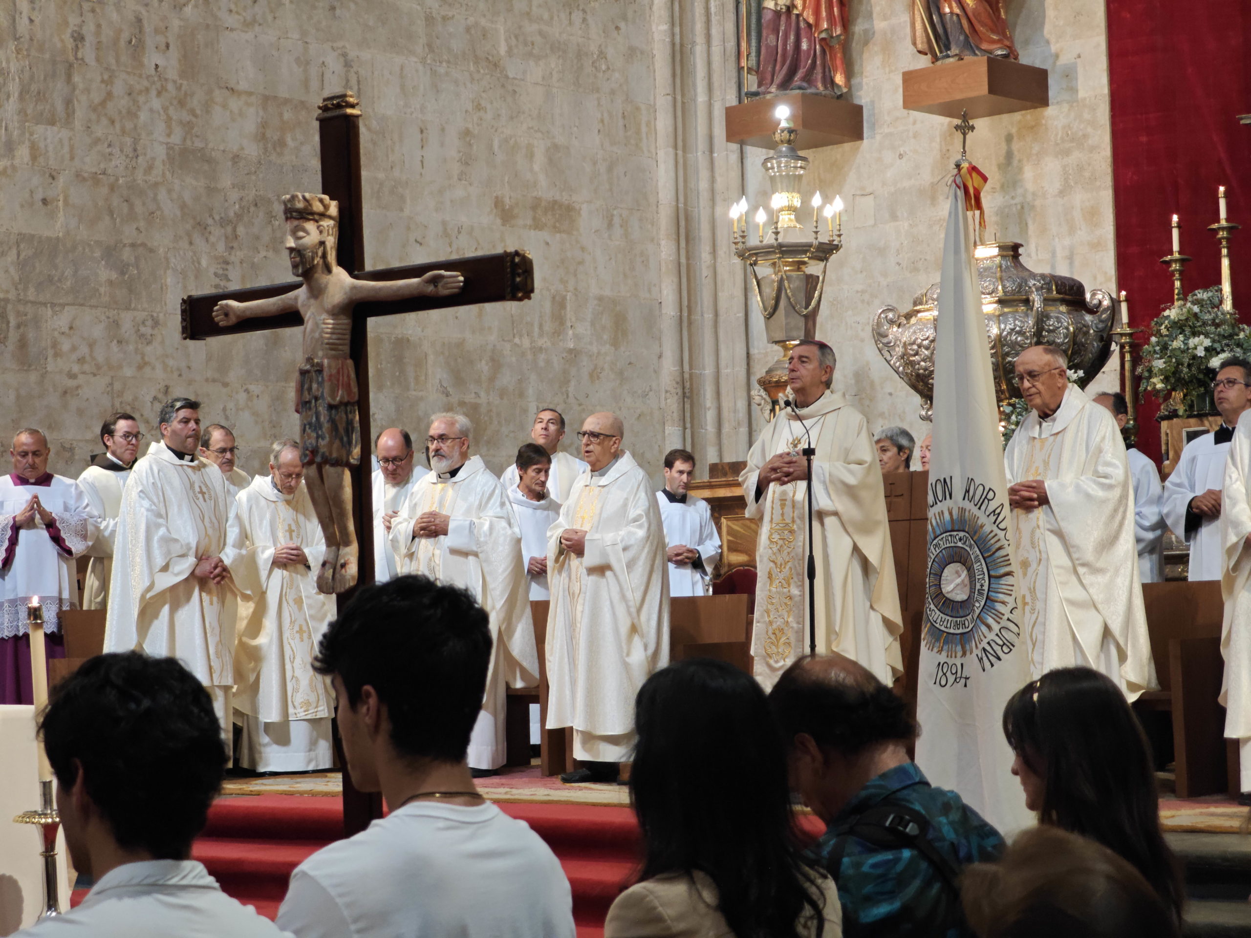 Este año, en el atrio de la Catedral, junto a la Puerta de Ramos, se colocó desde primera hora de la mañana el Lignum Crucis, de la Cofradía de la Vera Cruz, por el 300 aniversario de la entrega de esta reliquia. La eucaristía comenzó a las seis de la tarde, presidida por el obispo, Mons. José Luis Retana, junto a otros sacerdotes diocesanos. En su homilía, primero saludó a los niños de primera comunión que estaban presentes en la vía sacra. “Tenéis un protagonismo especial en esta celebración, porque sois los amigos predilectos de Jesús”.