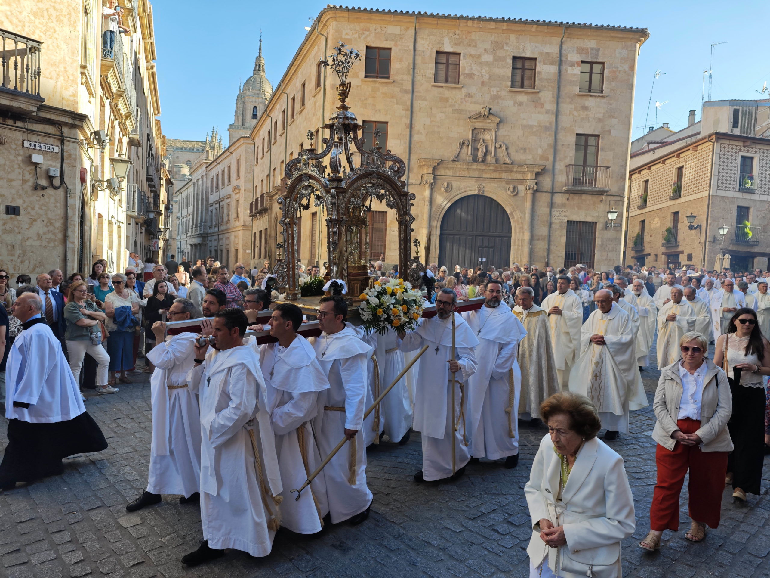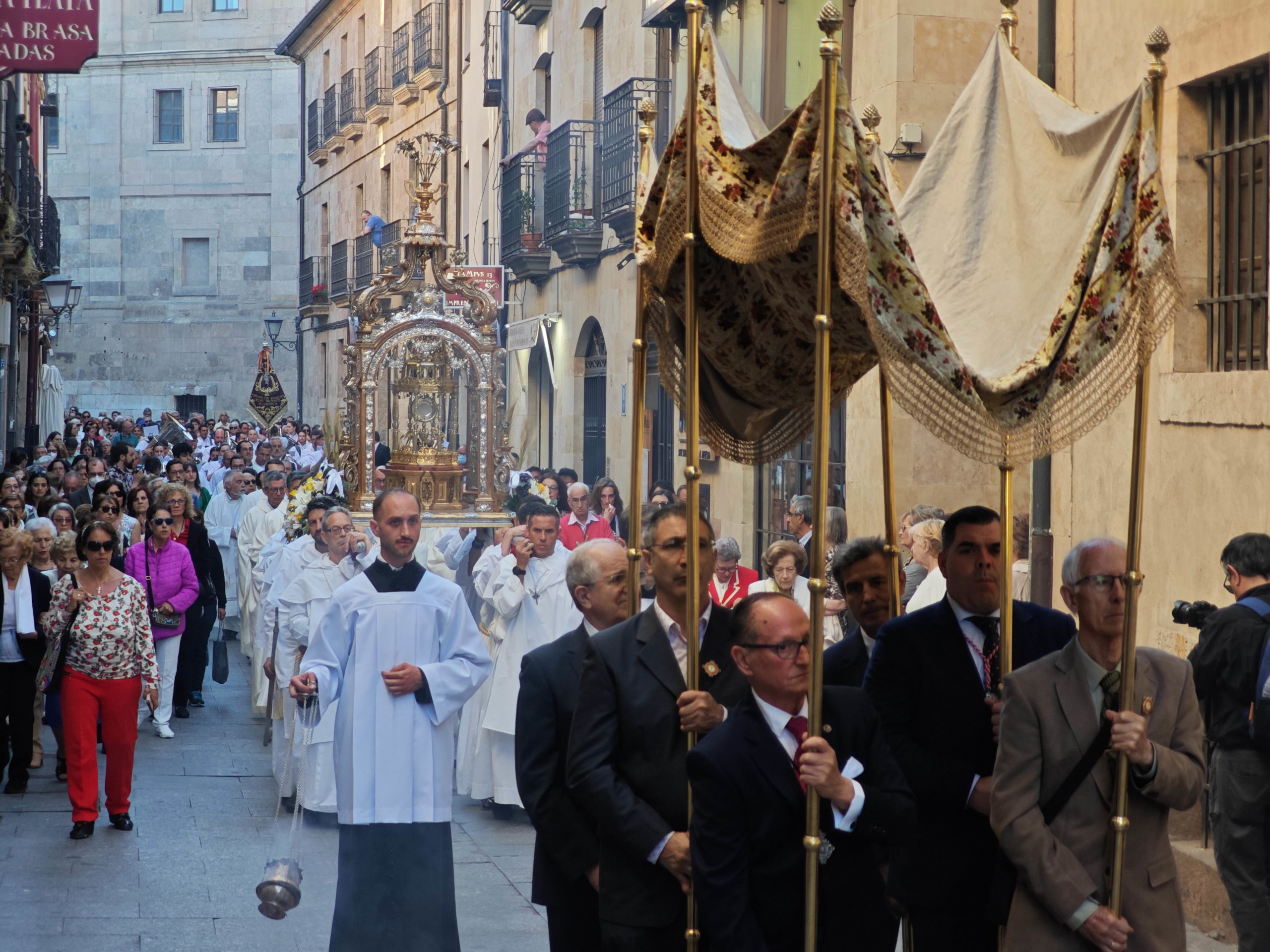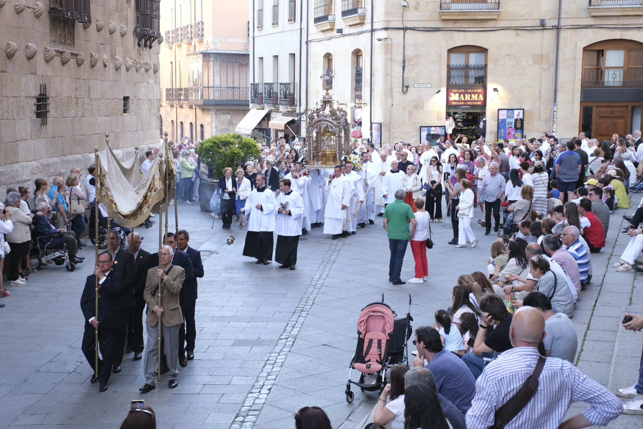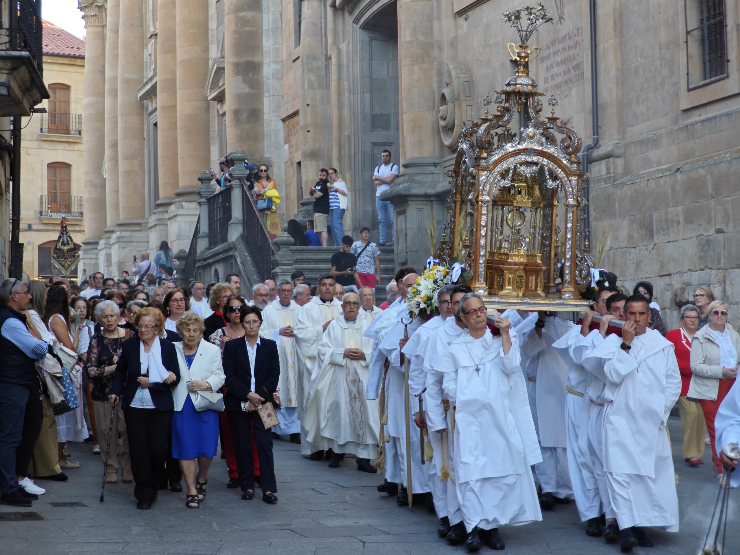 Una vez finalizada la eucaristía comenzó la procesión con la custodia de asiento de la Catedral, que portaba el Santísimo Sacramento, junto al bajo palio. En el cortejo participaban movimientos y cofradías de la Diócesis de Salamanca, junto al obispo y los sacerdotes, que cerraban la procesión. El acompañamiento musical corrió a cargo del coro de la Catedral y de la Agrupación Musical del Cristo Yacente.