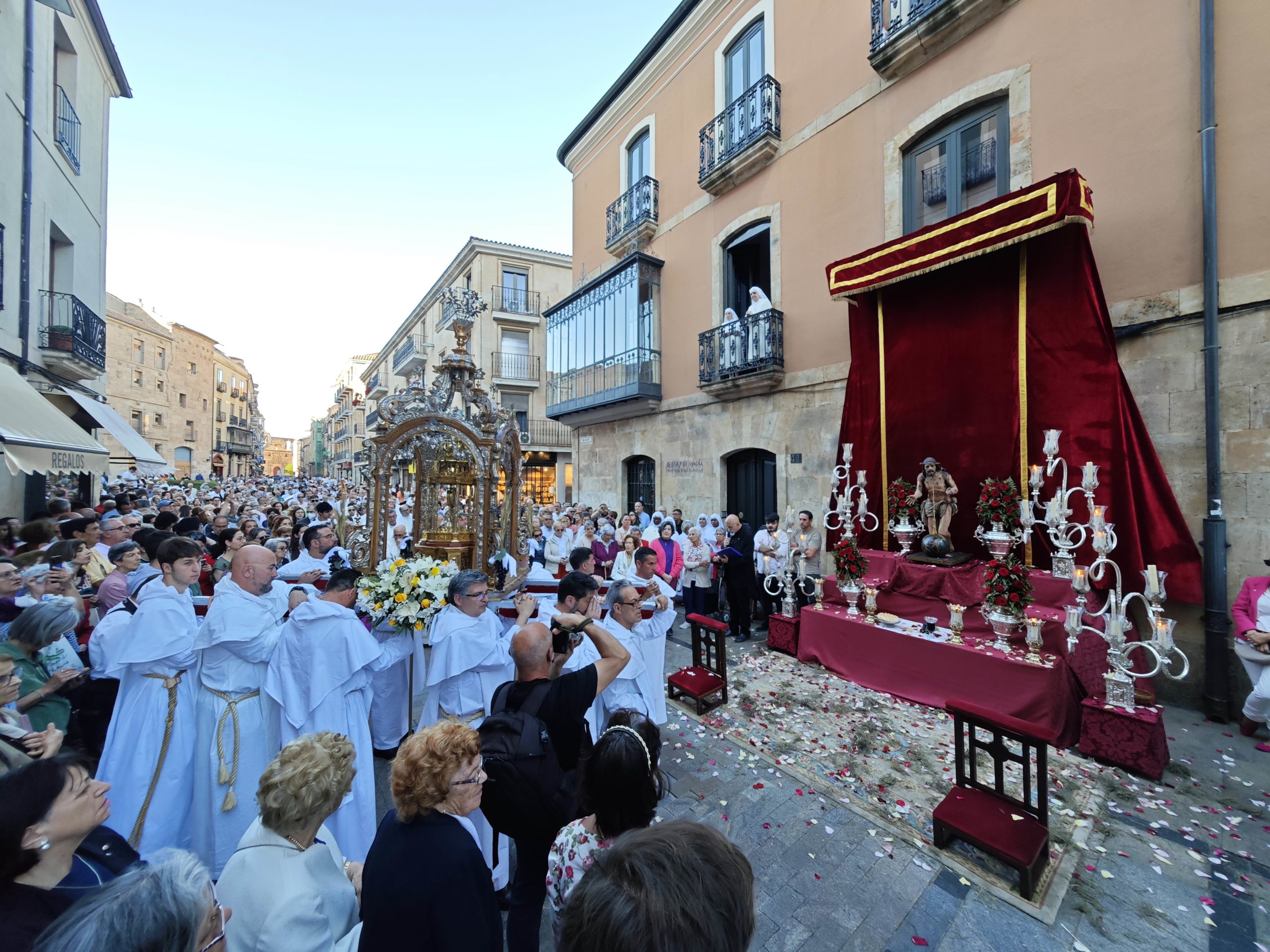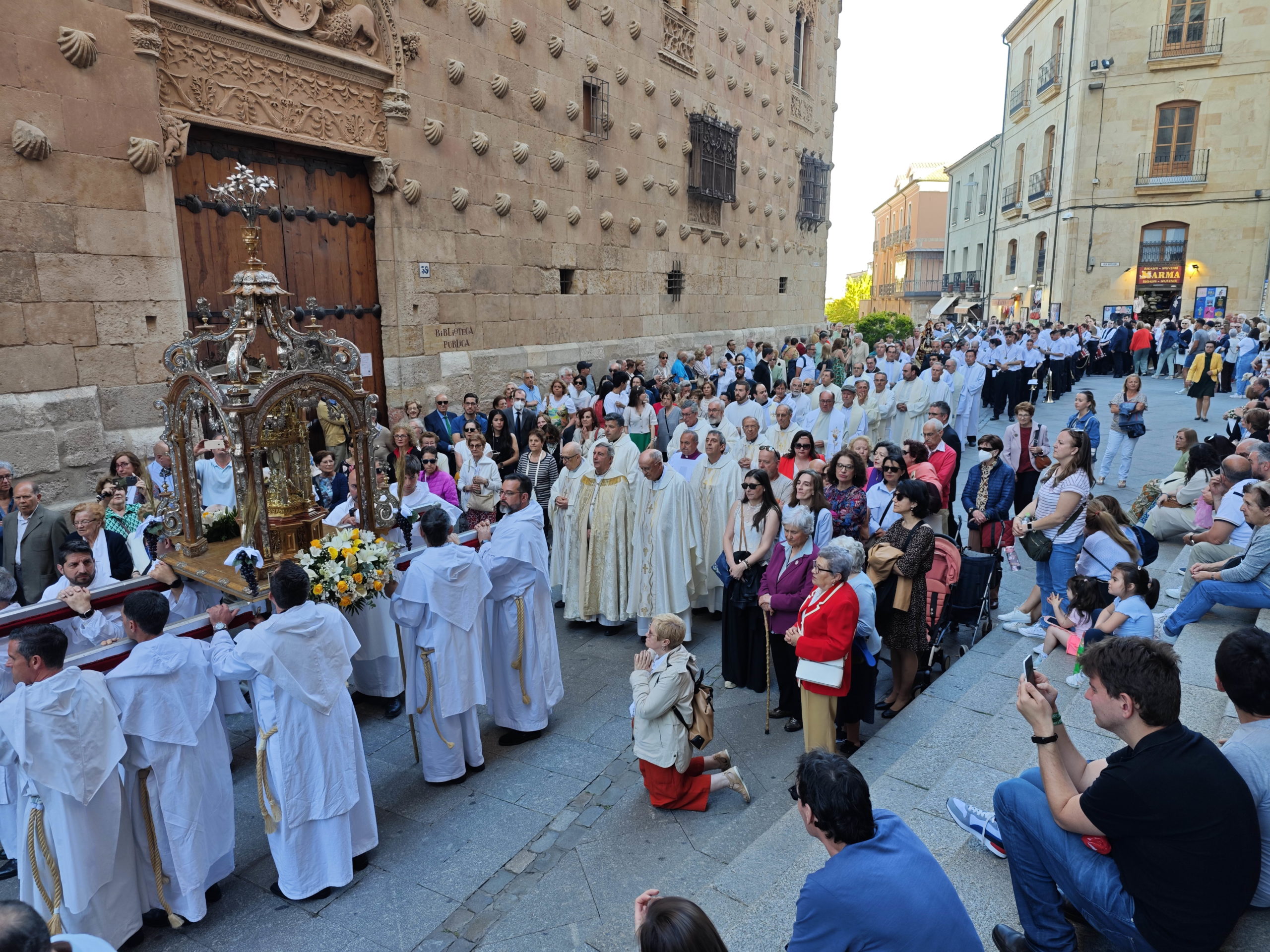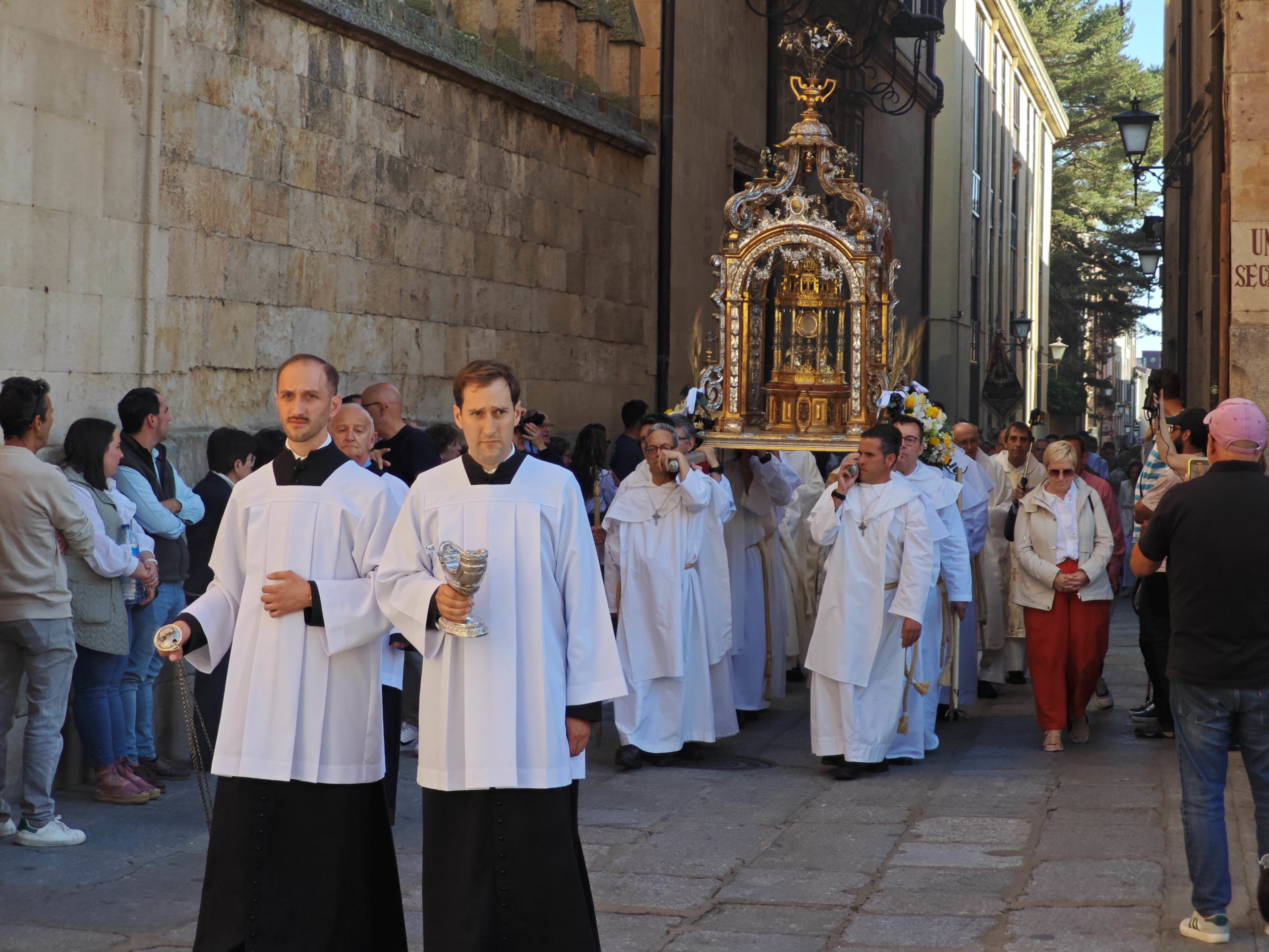 Una vez finalizada la eucaristía comenzó la procesión con la custodia de asiento de la Catedral, que portaba el Santísimo Sacramento, junto al bajo palio. En el cortejo participaban movimientos y cofradías de la Diócesis de Salamanca, junto al obispo y los sacerdotes, que cerraban la procesión. El acompañamiento musical corrió a cargo del coro de la Catedral y de la Agrupación Musical del Cristo Yacente.