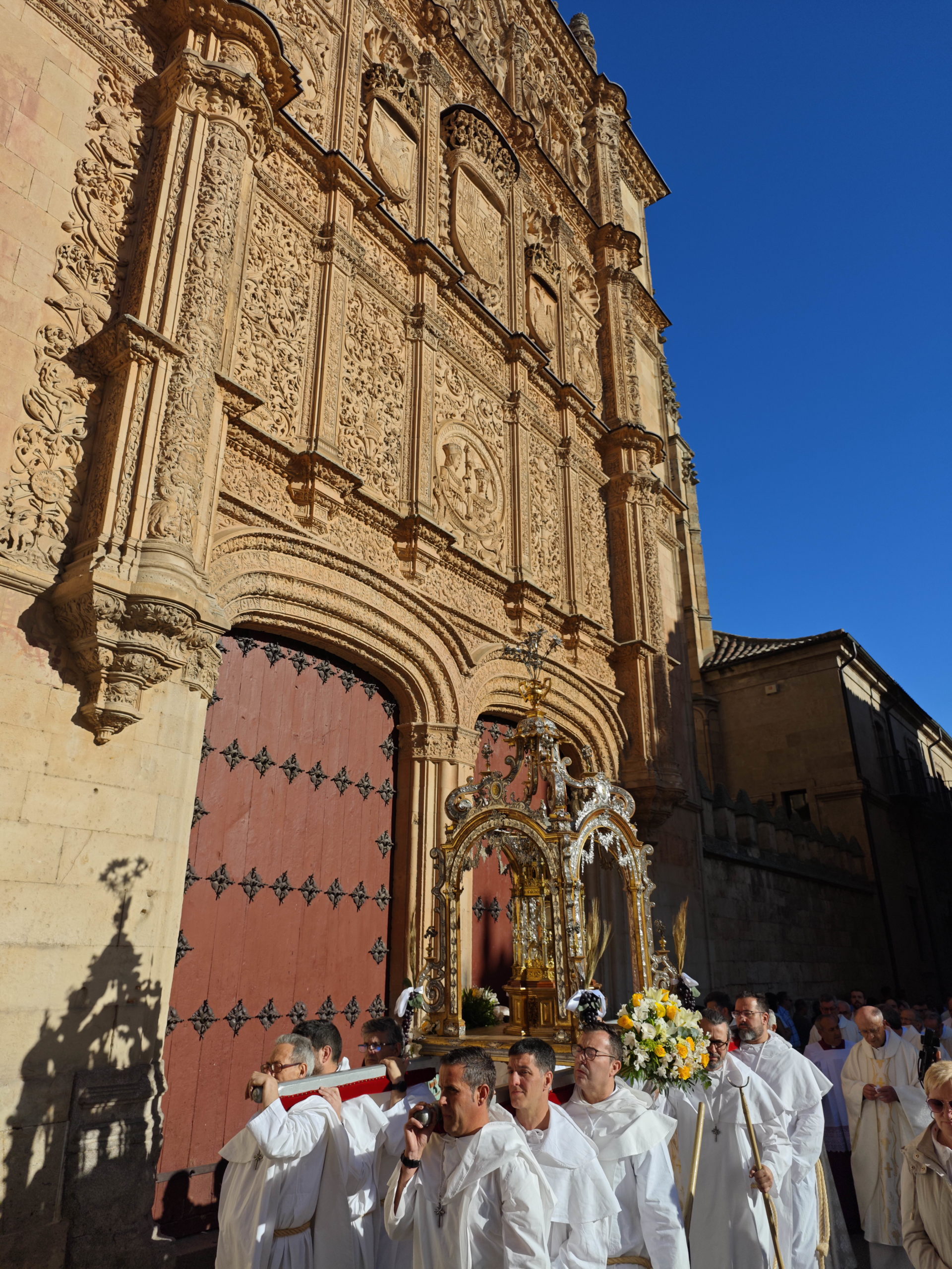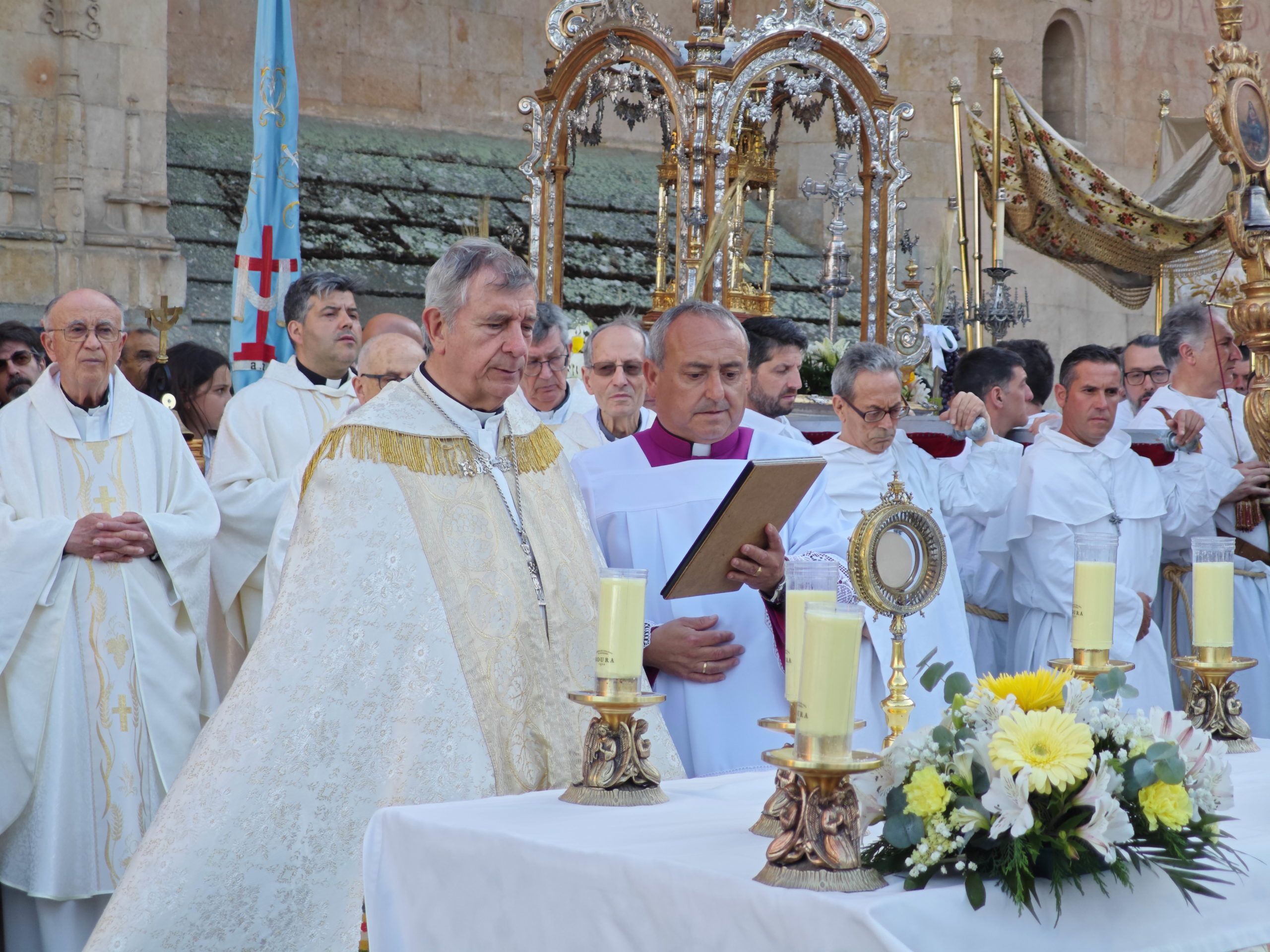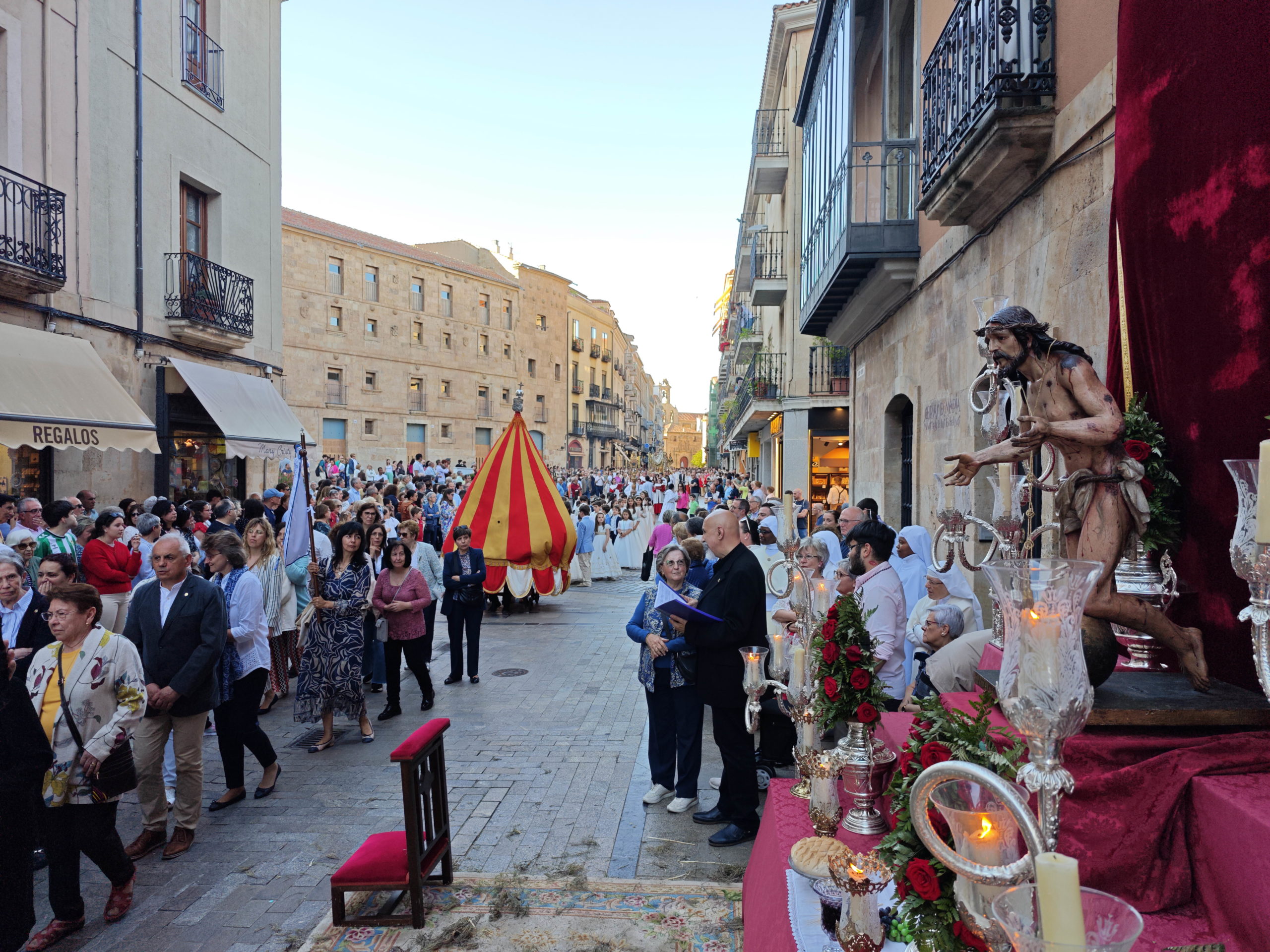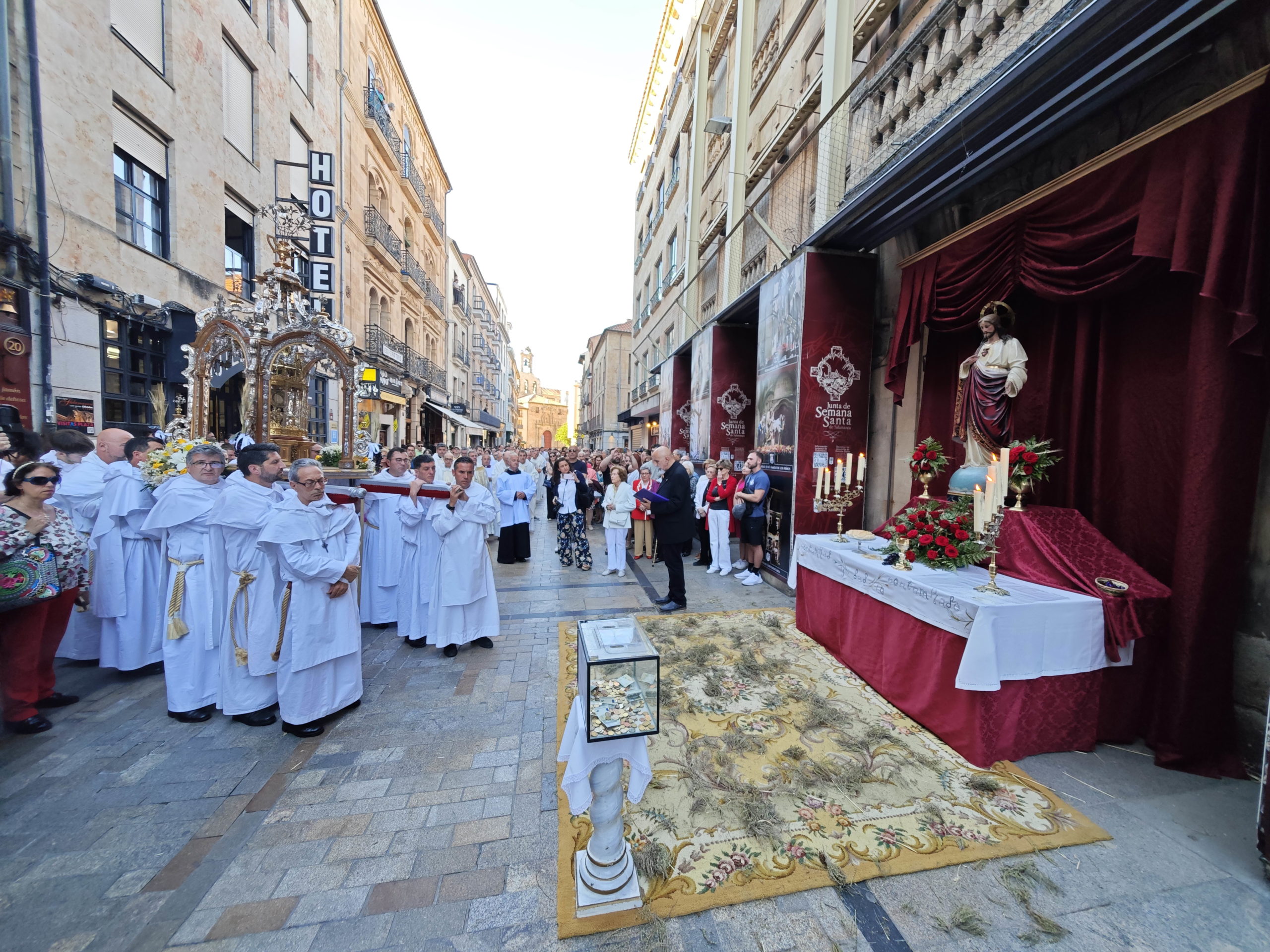Una vez finalizada la eucaristía comenzó la procesión con la custodia de asiento de la Catedral, que portaba el Santísimo Sacramento, junto al bajo palio. En el cortejo participaban movimientos y cofradías de la Diócesis de Salamanca, junto al obispo y los sacerdotes, que cerraban la procesión. El acompañamiento musical corrió a cargo del coro de la Catedral y de la Agrupación Musical del Cristo Yacente.