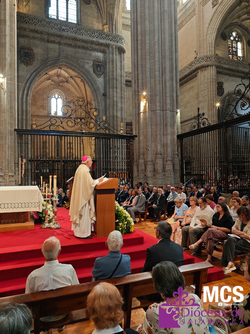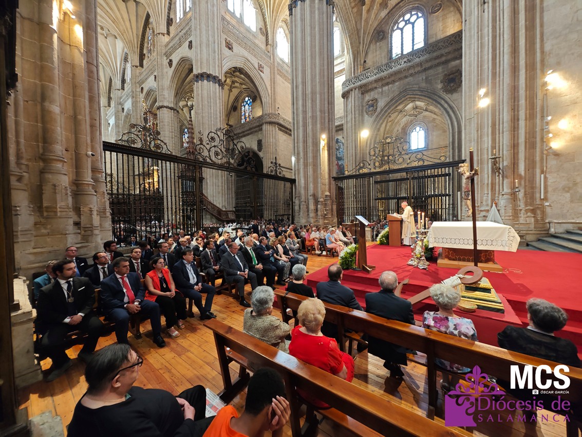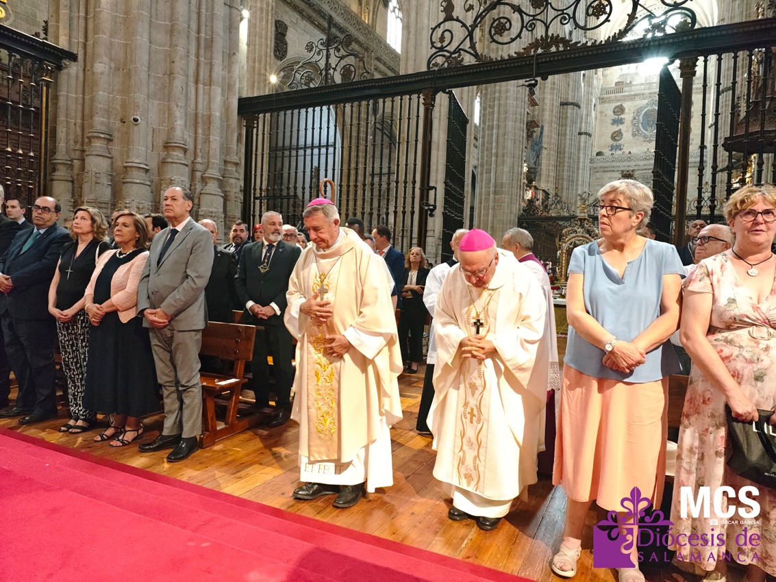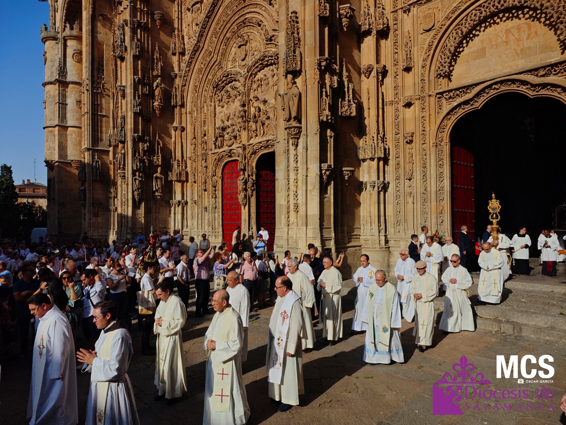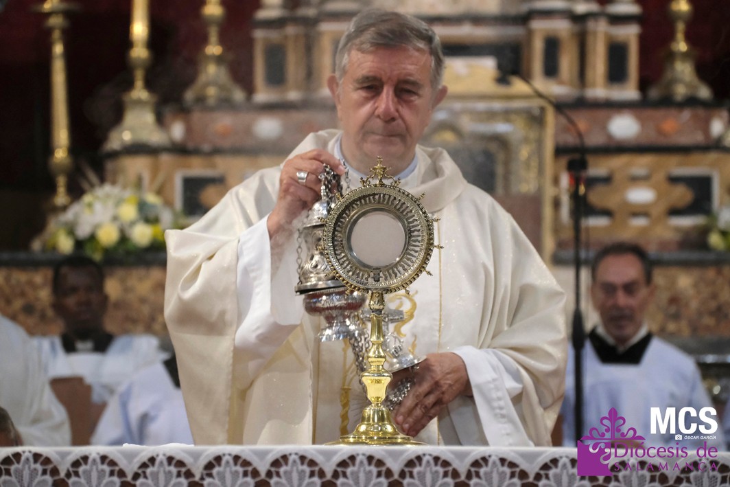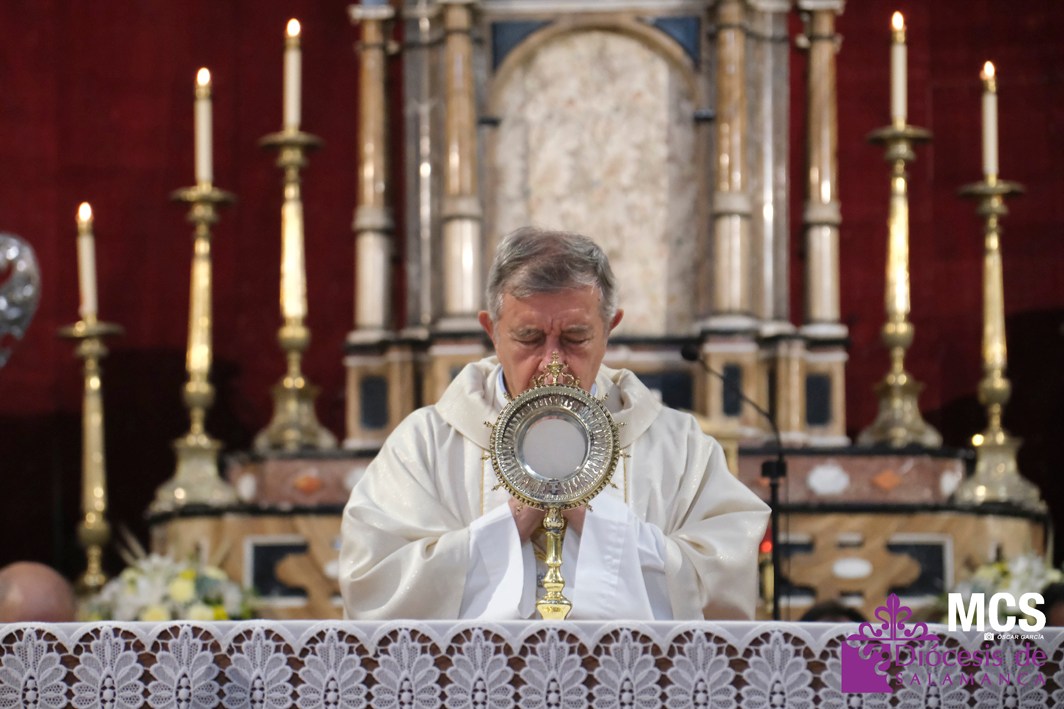 La Eucaristía fue el centro de la solemnidad del Corpus Christi que se celebró este domingo en la Catedral Nueva, presidida por el obispo de Salamanca, Mons. José Luis Retana, y concelebrada por el obispo emérito de Riobamba, Mons. Julio Parrilla, así como sacerdotes y religiosos diocesanos. En esta jornada también se conmemoraba el Día de la Caridad, con la presencia destacada de Cáritas diocesana de Salamanca. Una celebración que, como expresó el obispo de la diócesis, nos sitúa en el centro de la vida cristiana y nos hace testigos de la compasión de Dios, llamados a ser “la caricia de Dios para el prójimo herido”.