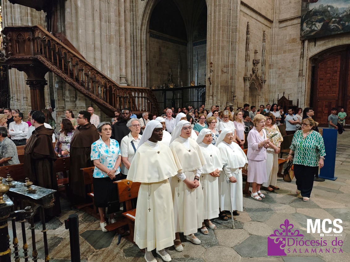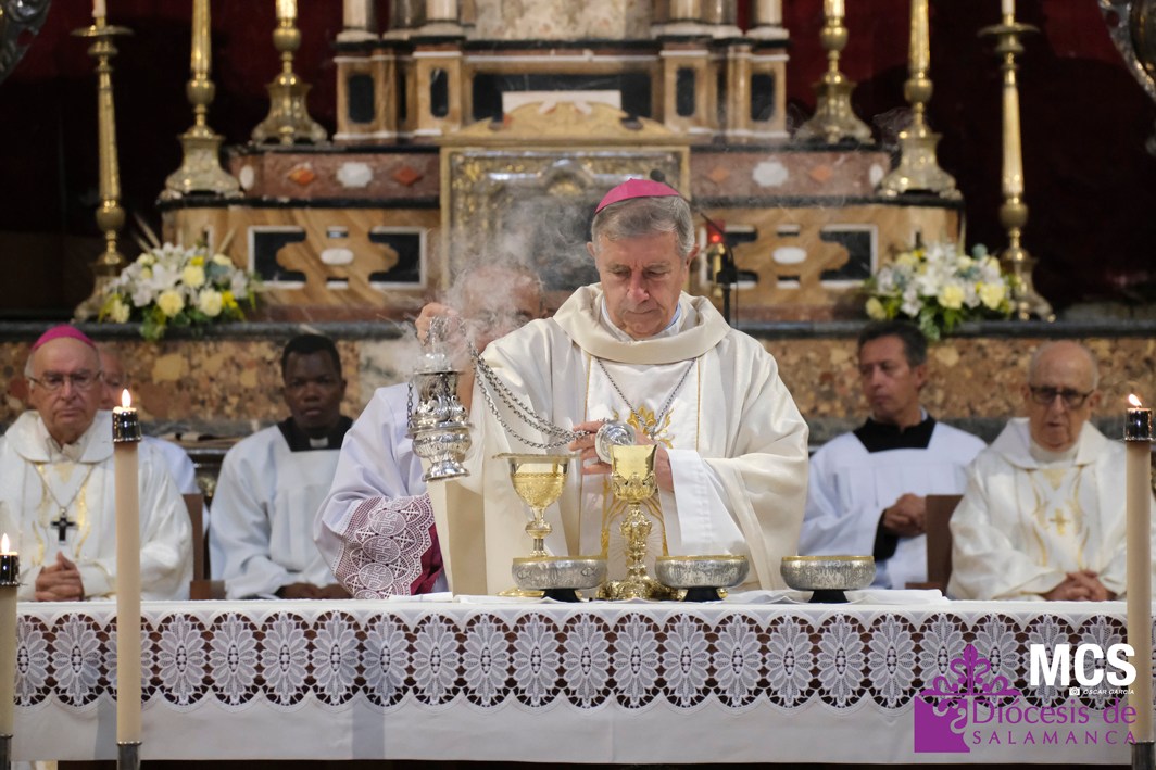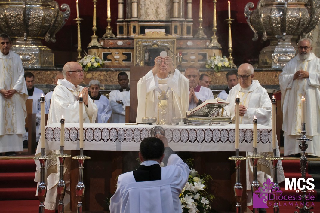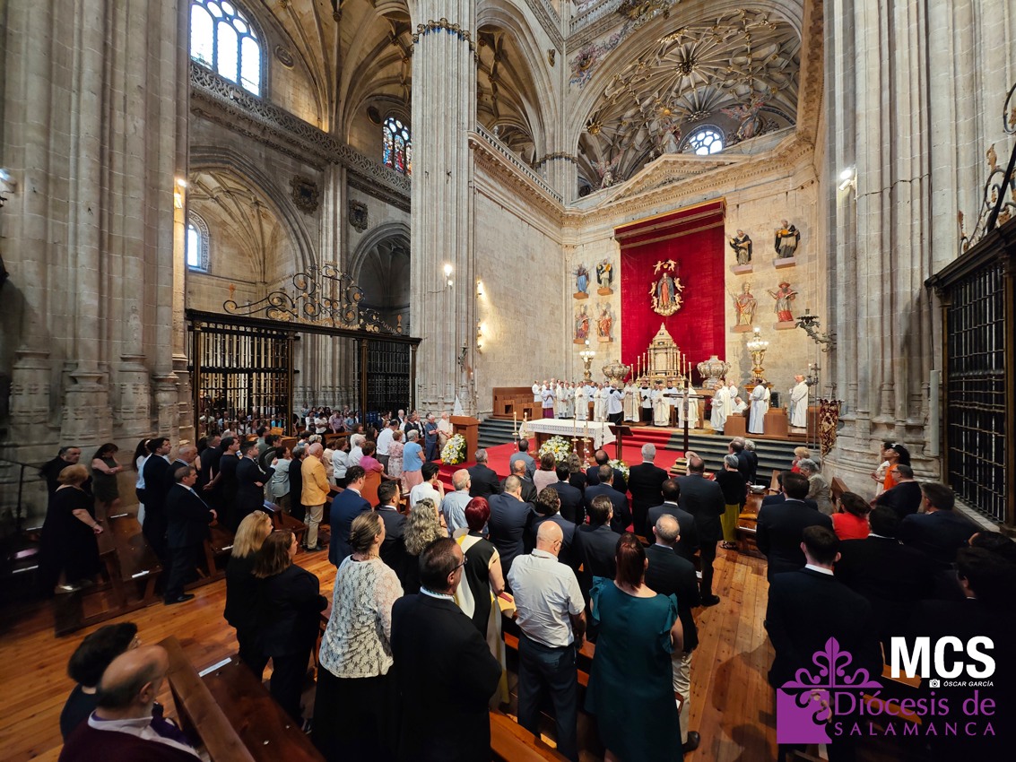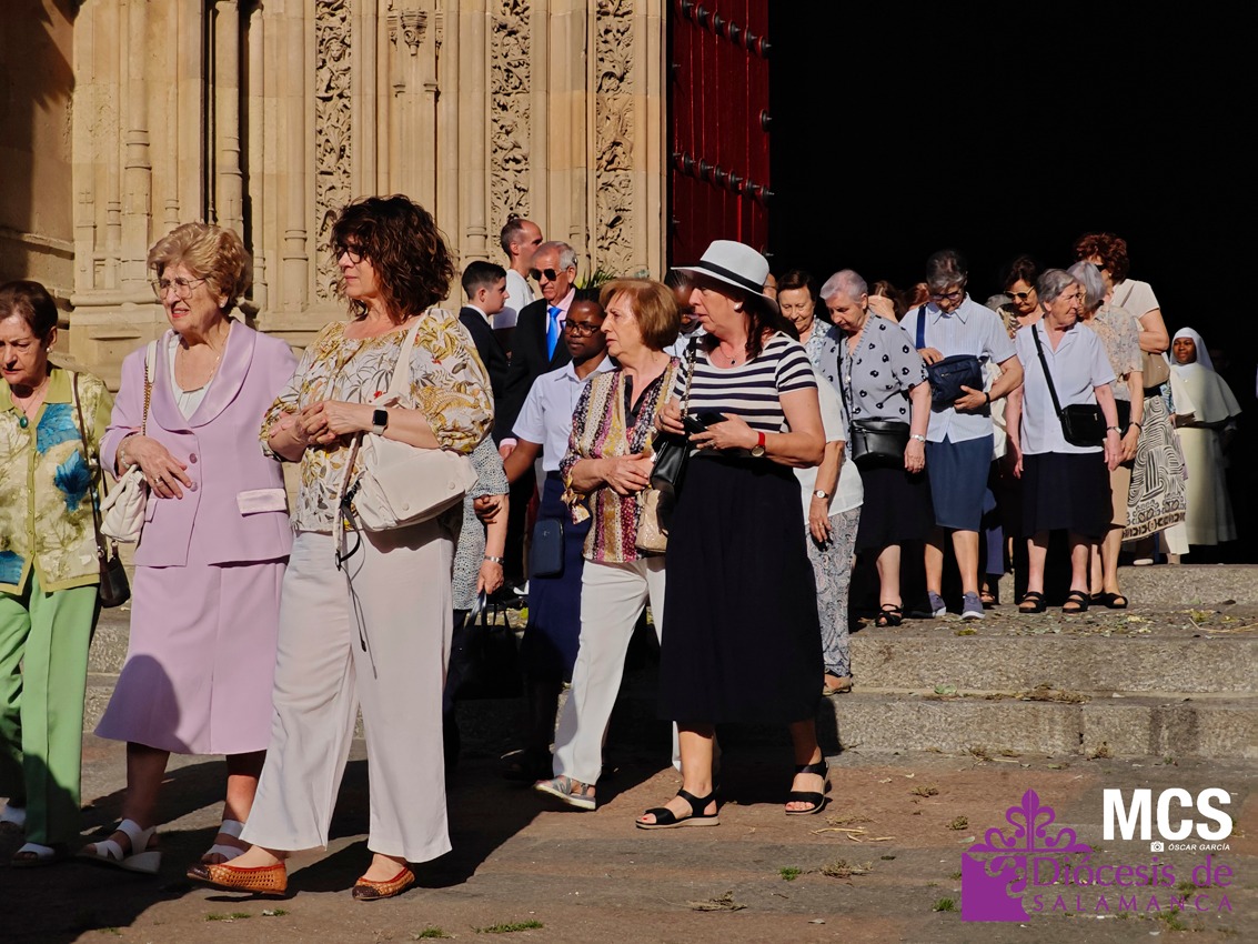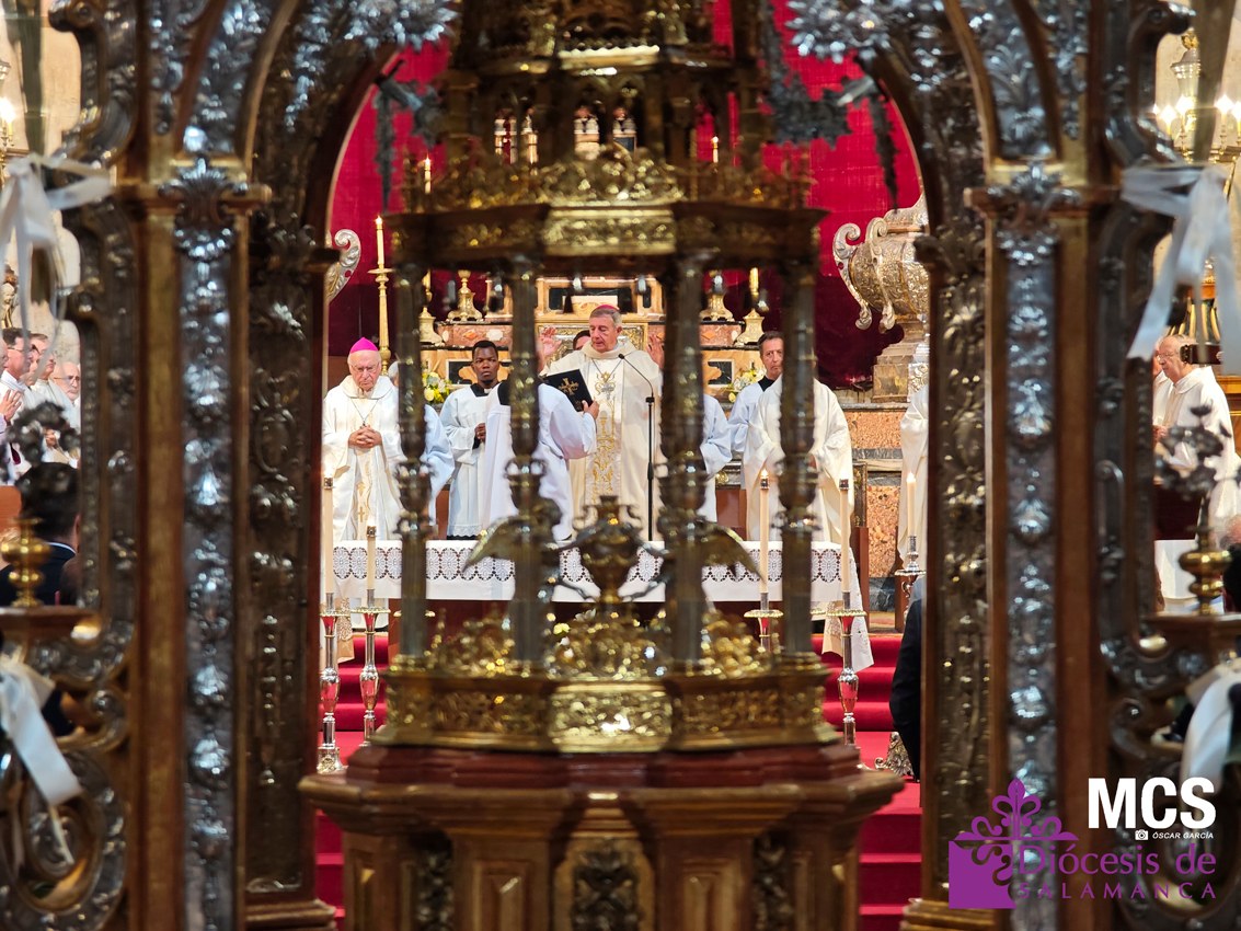 La Eucaristía fue el centro de la solemnidad del Corpus Christi que se celebró este domingo en la Catedral Nueva, presidida por el obispo de Salamanca, Mons. José Luis Retana, y concelebrada por el obispo emérito de Riobamba, Mons. Julio Parrilla, así como sacerdotes y religiosos diocesanos. En esta jornada también se conmemoraba el Día de la Caridad, con la presencia destacada de Cáritas diocesana de Salamanca. Una celebración que, como expresó el obispo de la diócesis, nos sitúa en el centro de la vida cristiana y nos hace testigos de la compasión de Dios, llamados a ser “la caricia de Dios para el prójimo herido”.