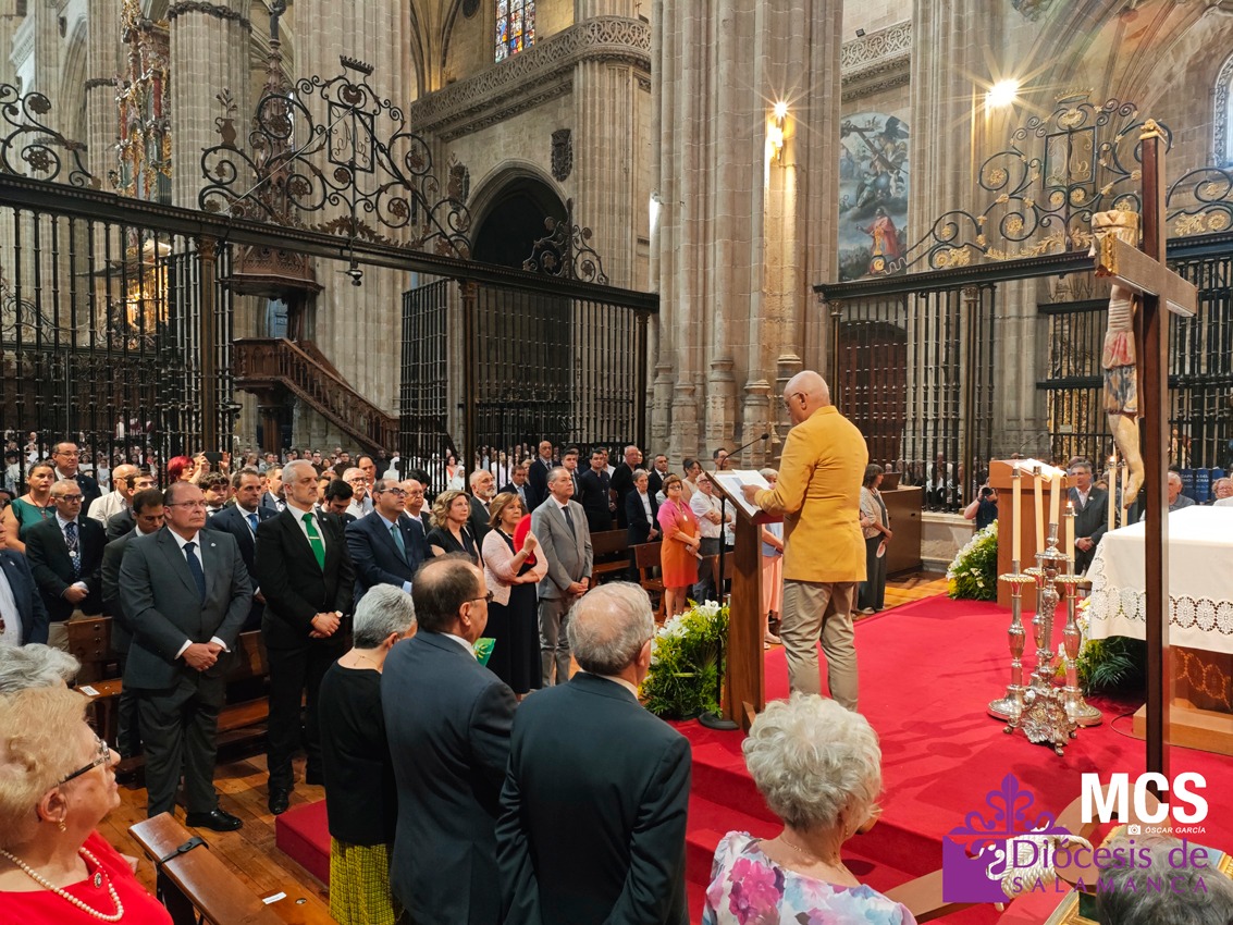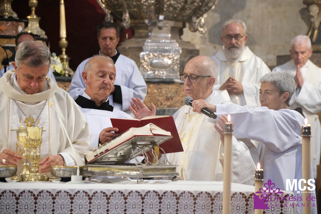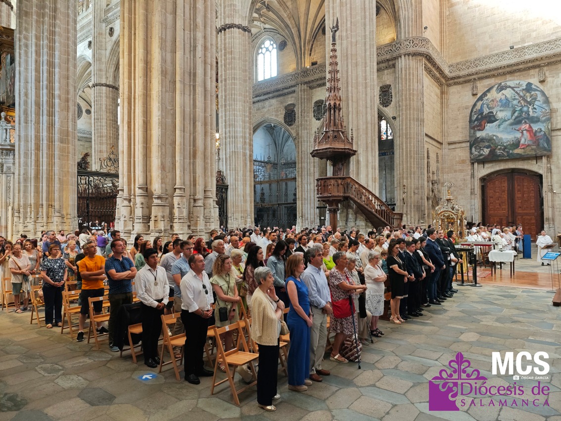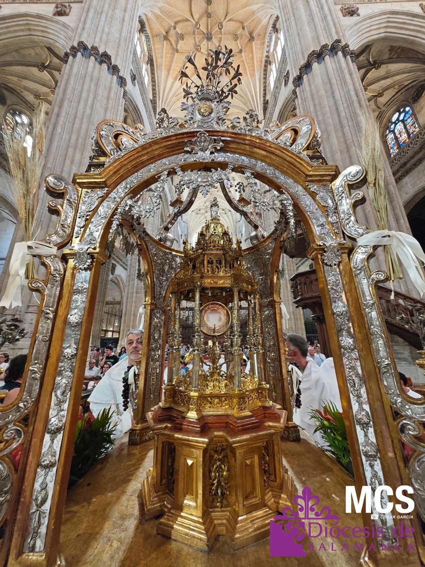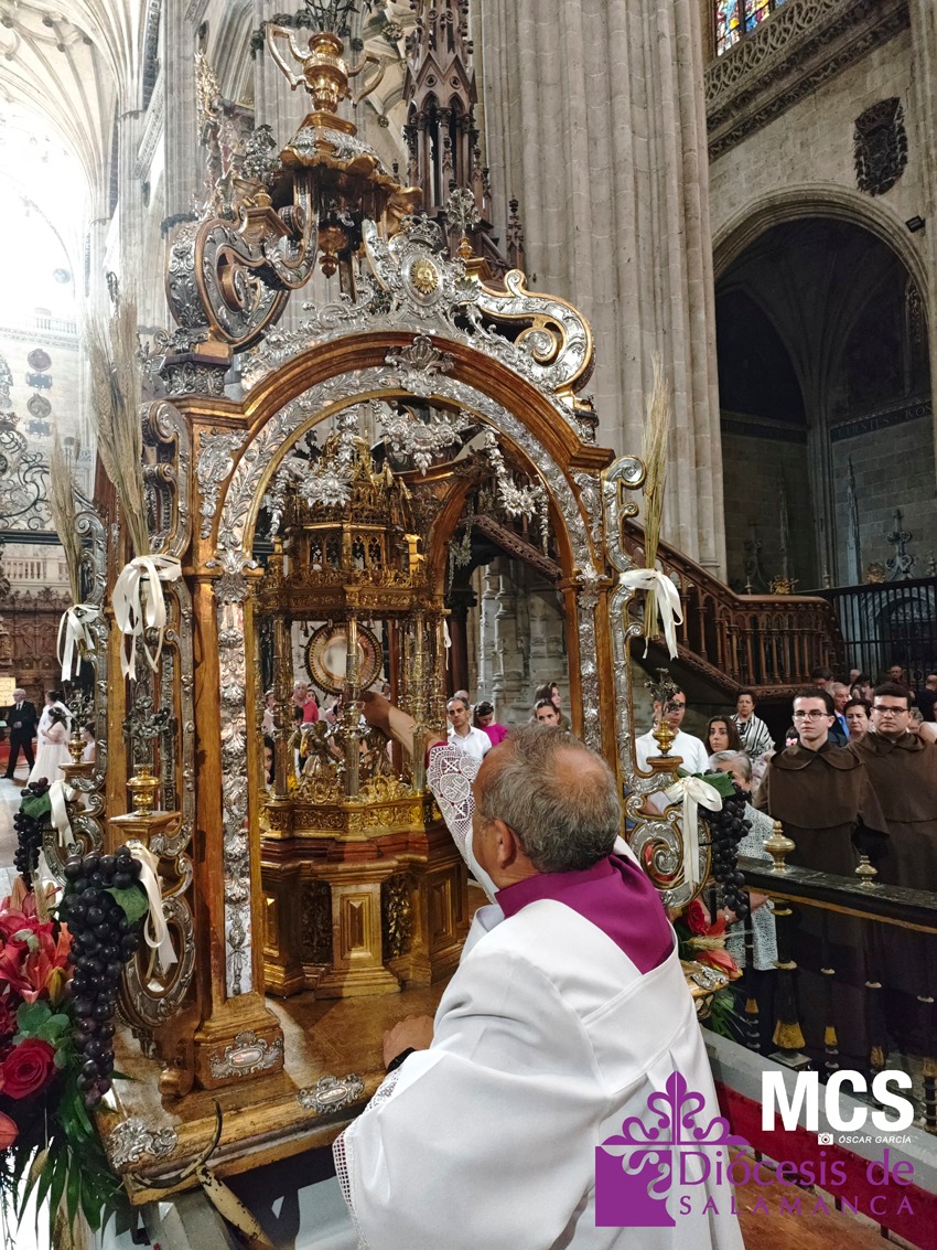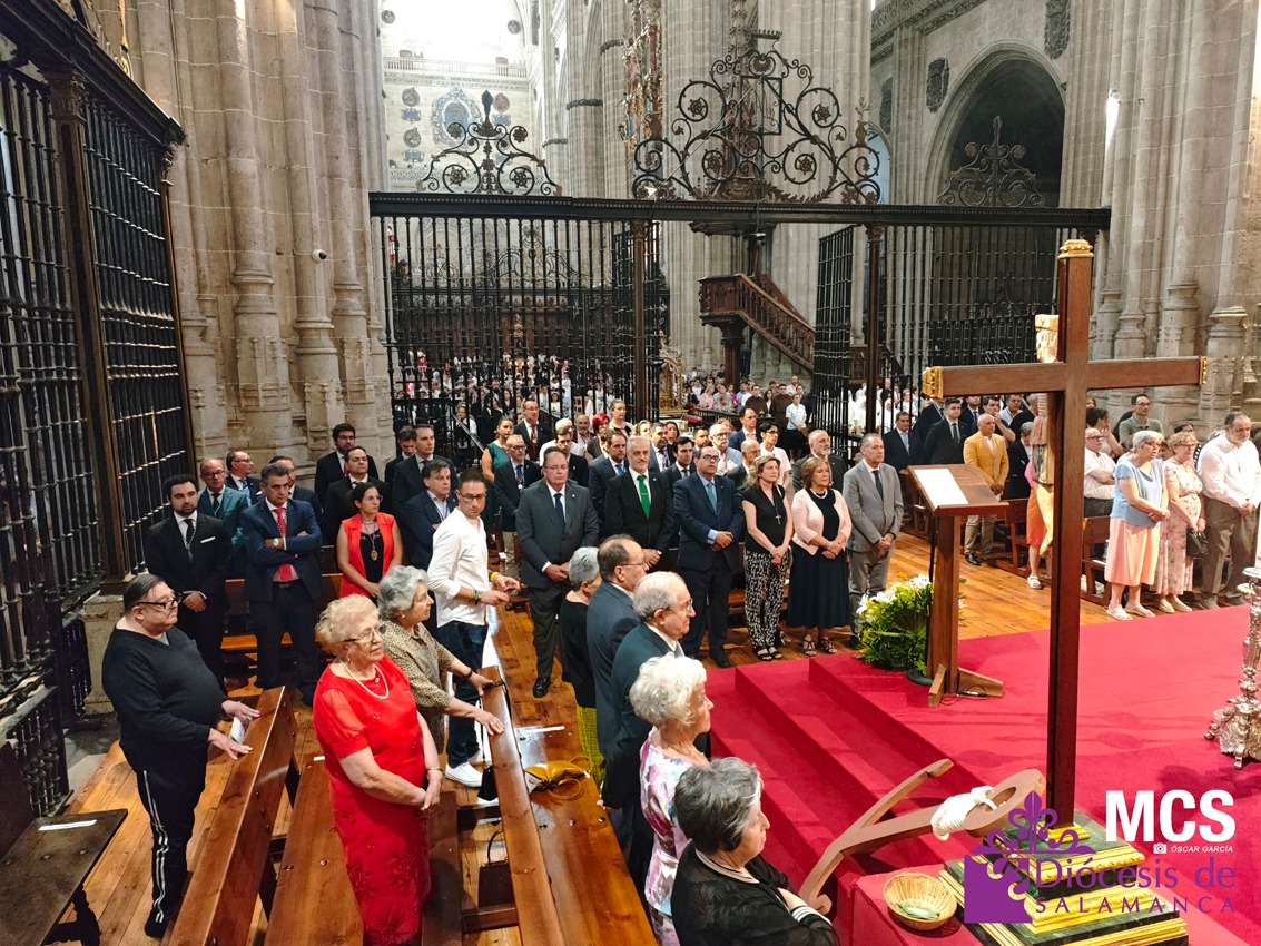 La Eucaristía fue el centro de la solemnidad del Corpus Christi que se celebró este domingo en la Catedral Nueva, presidida por el obispo de Salamanca, Mons. José Luis Retana, y concelebrada por el obispo emérito de Riobamba, Mons. Julio Parrilla, así como sacerdotes y religiosos diocesanos. En esta jornada también se conmemoraba el Día de la Caridad, con la presencia destacada de Cáritas diocesana de Salamanca. Una celebración que, como expresó el obispo de la diócesis, nos sitúa en el centro de la vida cristiana y nos hace testigos de la compasión de Dios, llamados a ser “la caricia de Dios para el prójimo herido”.