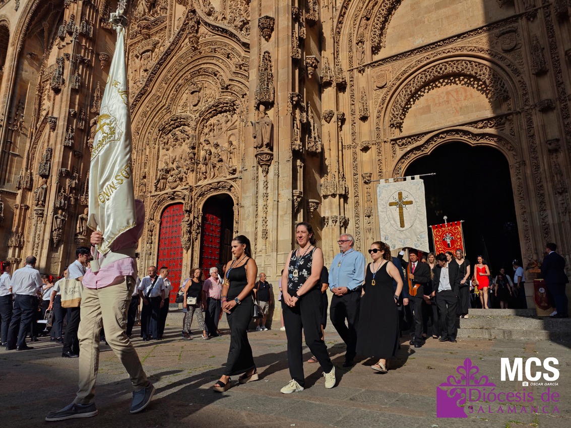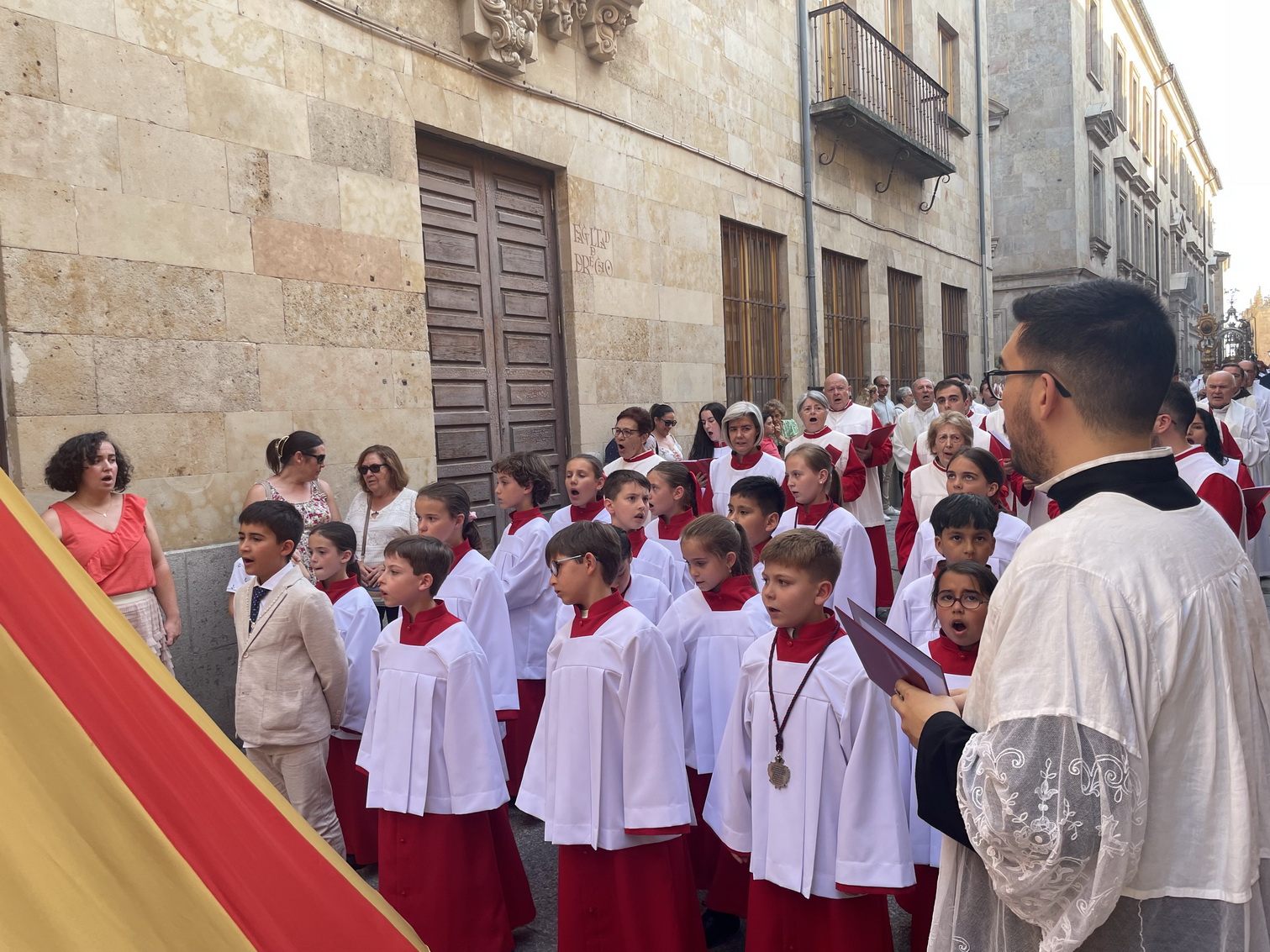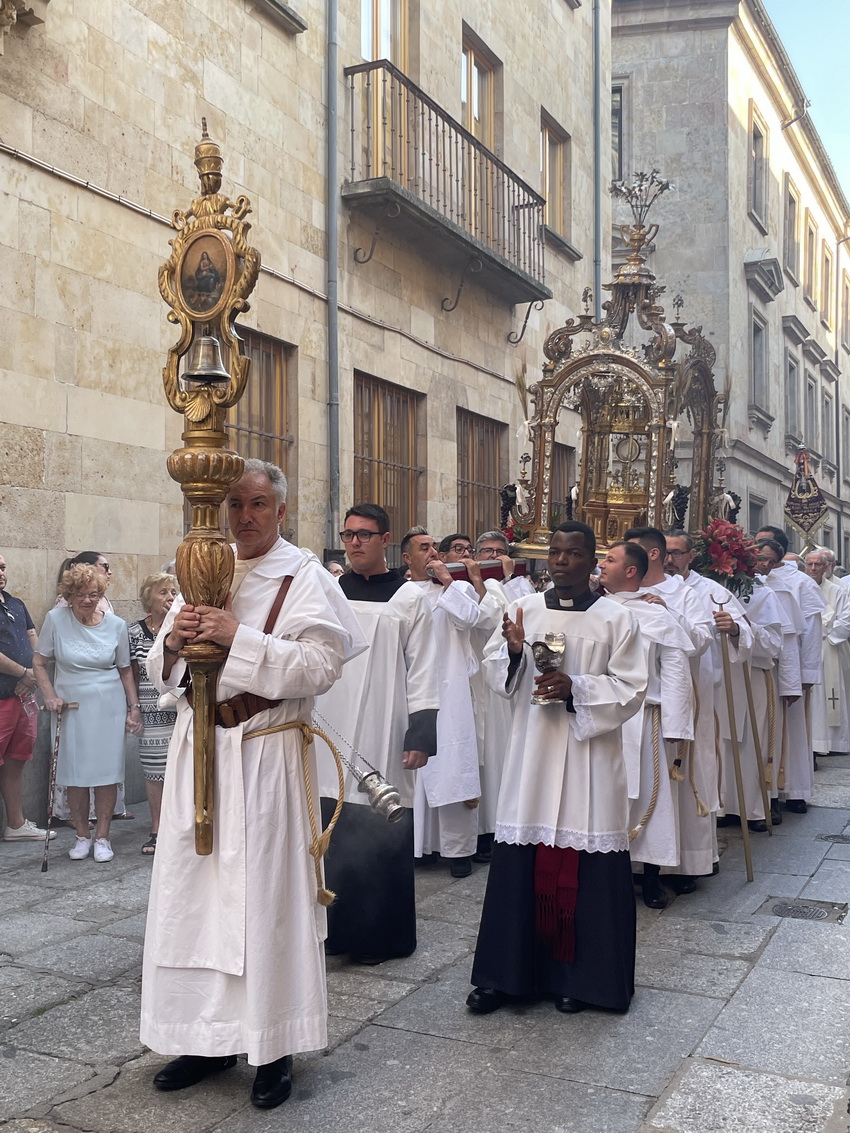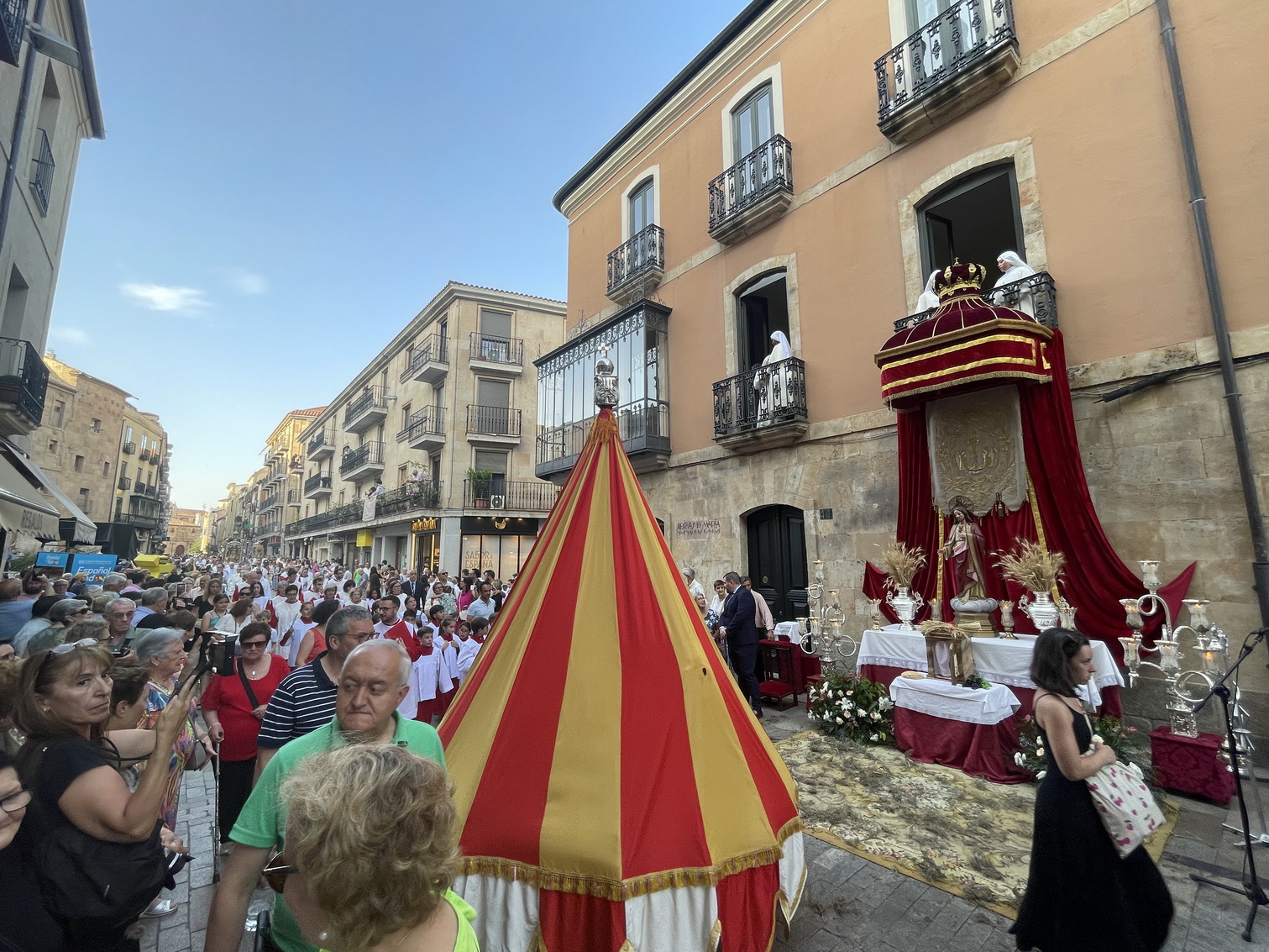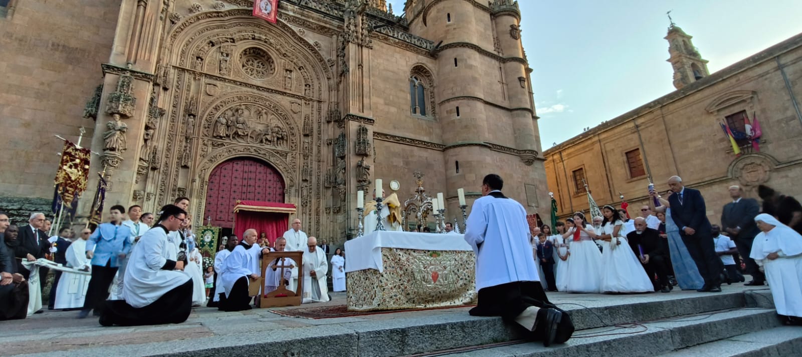 La procesión que siguió a la misa fue un testimonio silencioso de la fe del pueblo salmantino. “No fue un desfile ni un espectáculo, sino una peregrinación tras las huellas del Pan de Vida“, apuntaron antes de su inicio, con un orden marcado por la tradición: la cruz y los ciriales, los fieles de las parroquias, los dinamismos pastorales, cofradías y hermandades, la adoración nocturna, los religiosos, el símbolo basilical, los niños de comunión, y la campana sonaba desde el tintinábulo antes del paso de la custodia por los tres altares montados en diferentes puntos por cofradías, hermandades y congregaciones penitenciales.