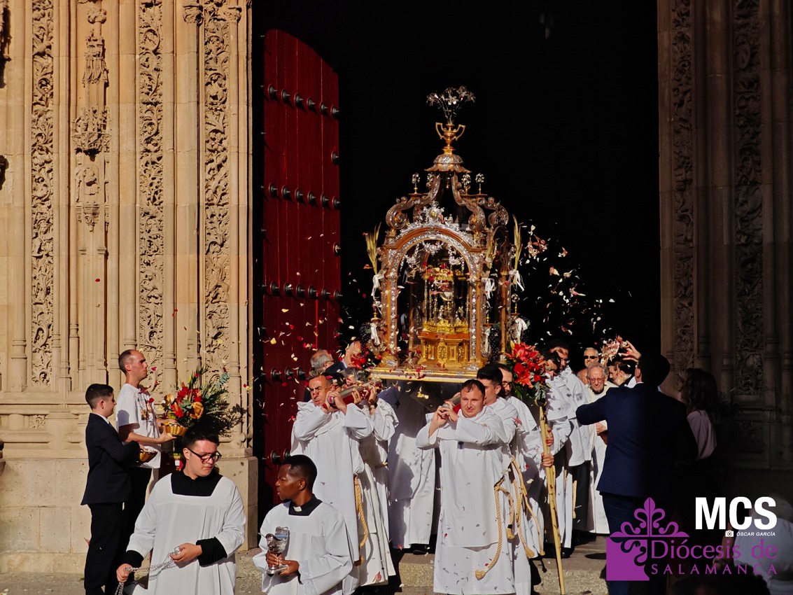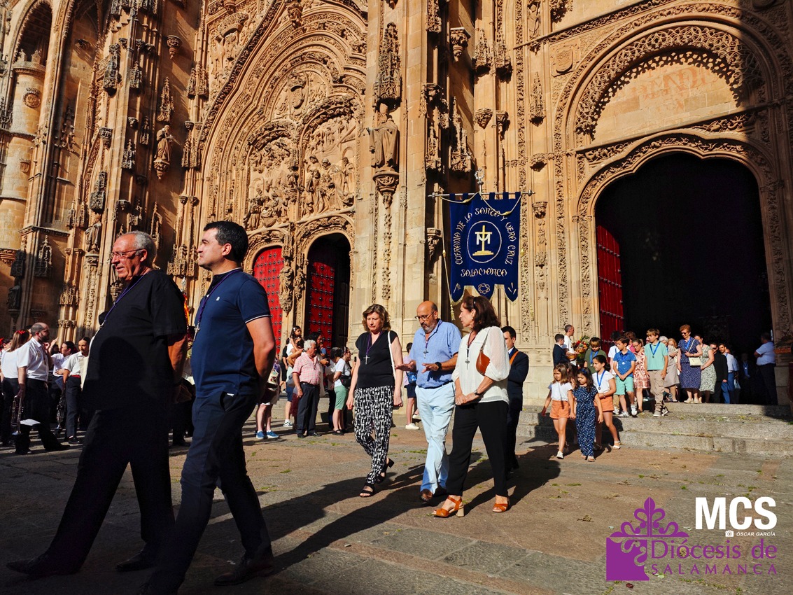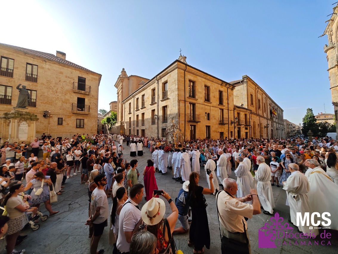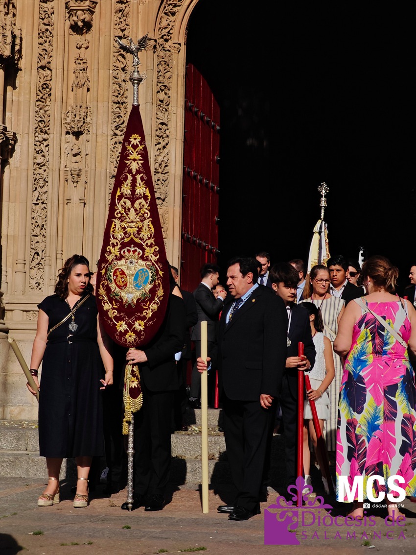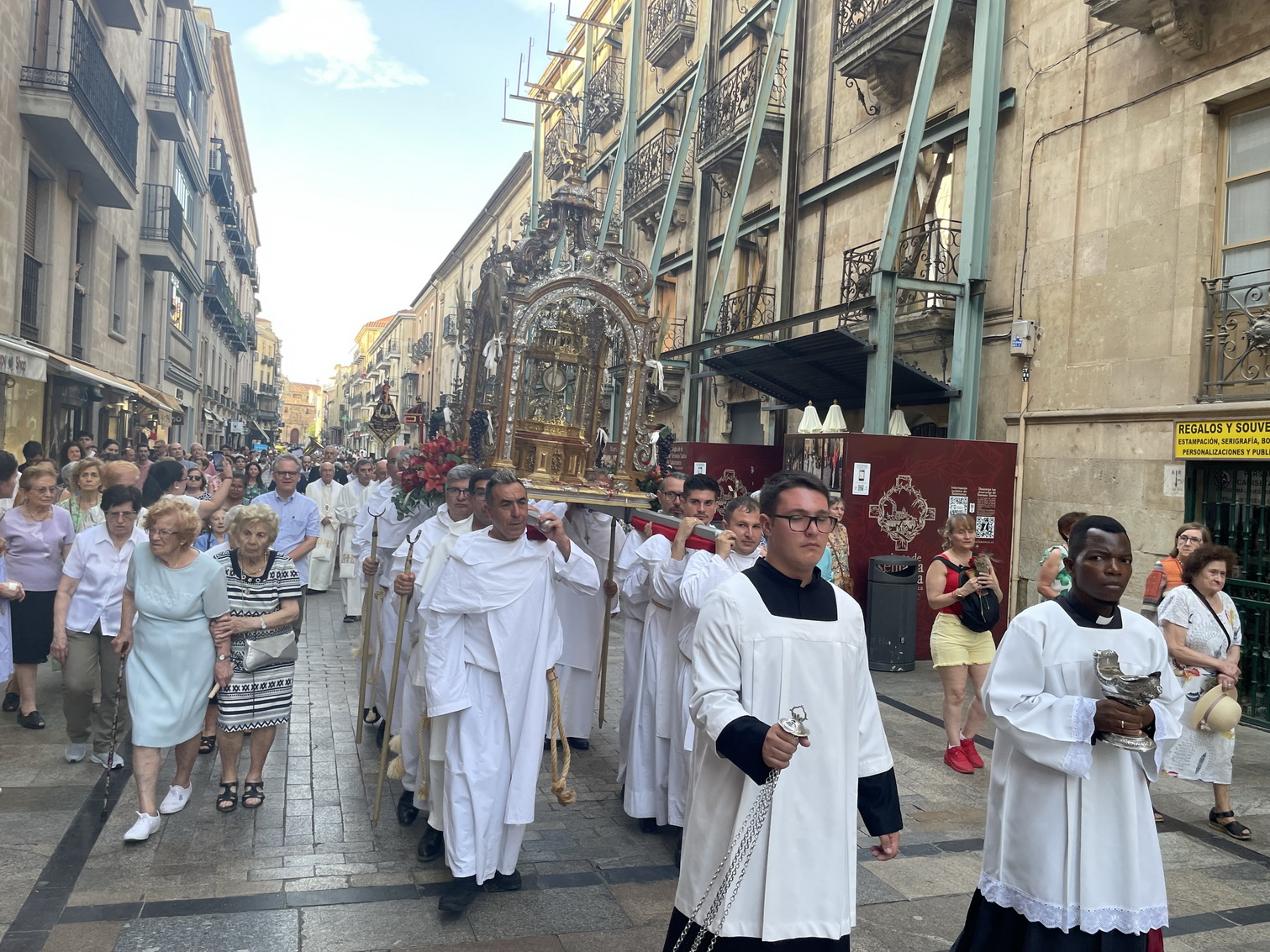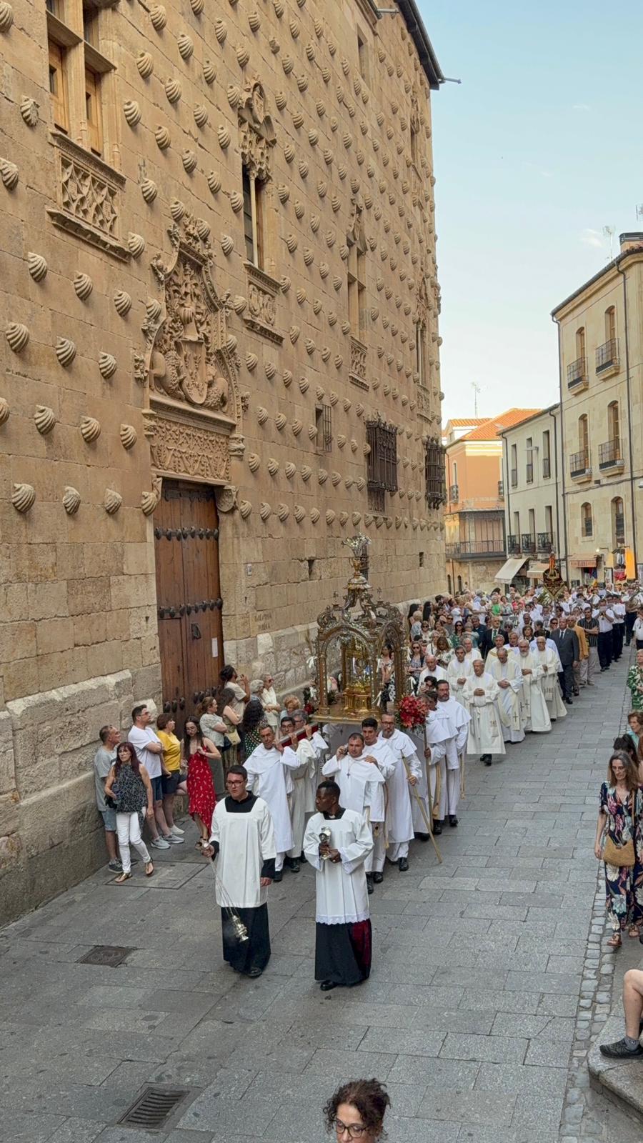 La procesión que siguió a la misa fue un testimonio silencioso de la fe del pueblo salmantino. “No fue un desfile ni un espectáculo, sino una peregrinación tras las huellas del Pan de Vida“, apuntaron antes de su inicio, con un orden marcado por la tradición: la cruz y los ciriales, los fieles de las parroquias, los dinamismos pastorales, cofradías y hermandades, la adoración nocturna, los religiosos, el símbolo basilical, los niños de comunión, y la campana sonaba desde el tintinábulo antes del paso de la custodia por los tres altares montados en diferentes puntos por cofradías, hermandades y congregaciones penitenciales.