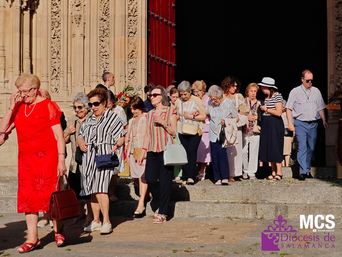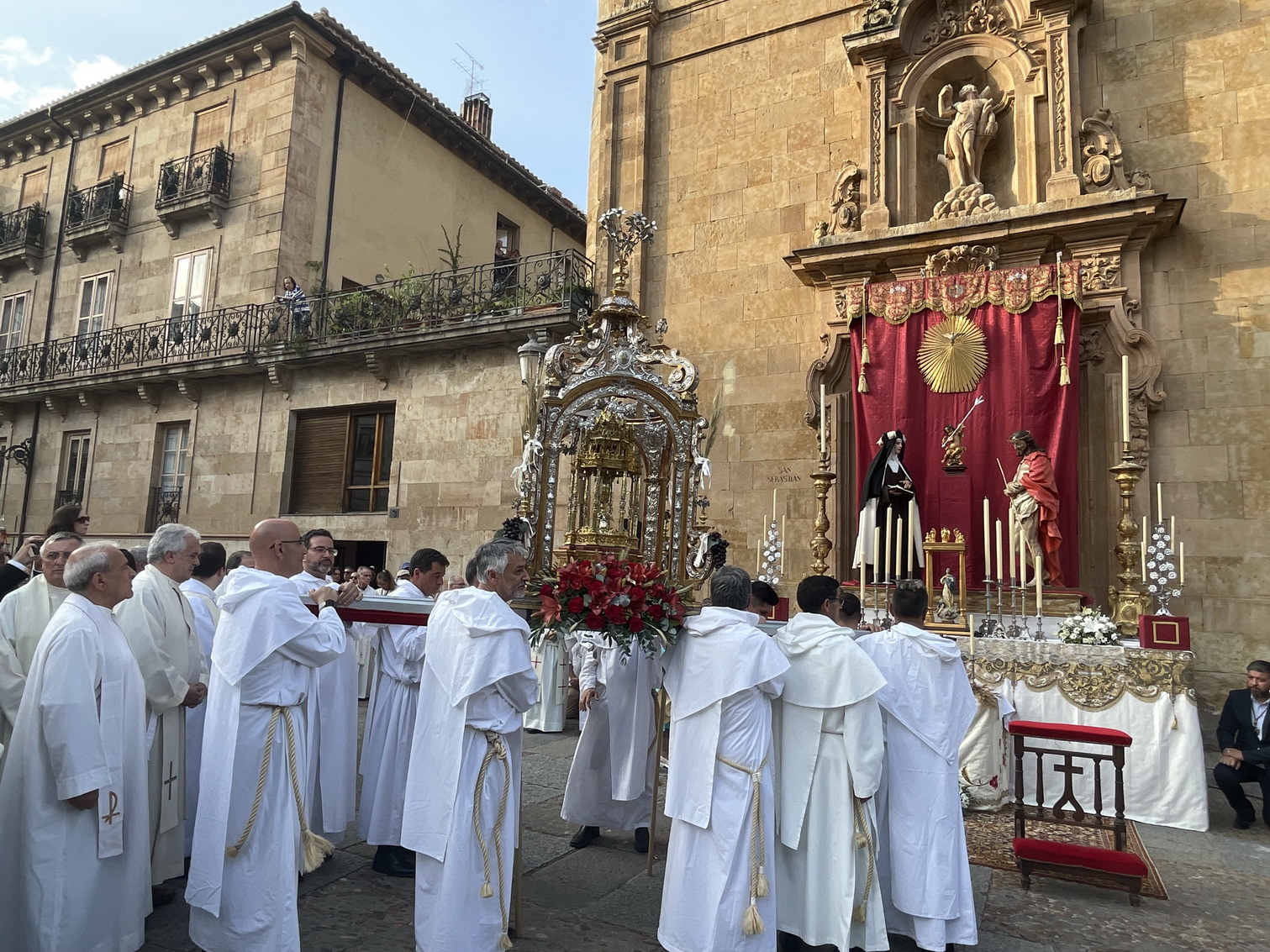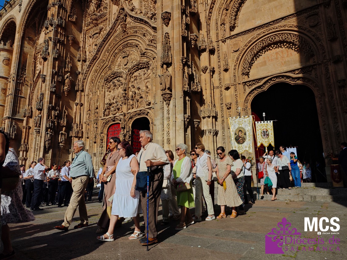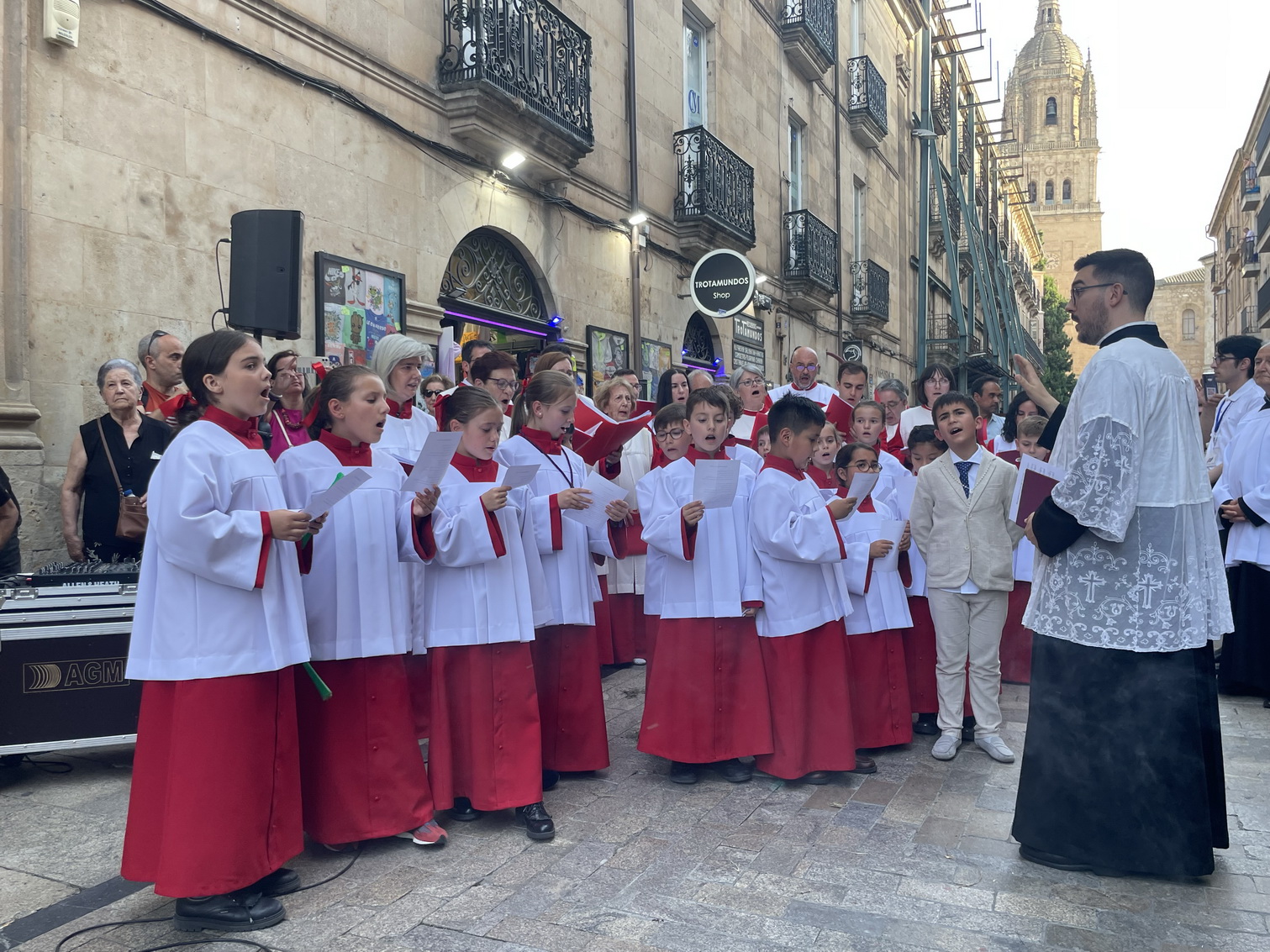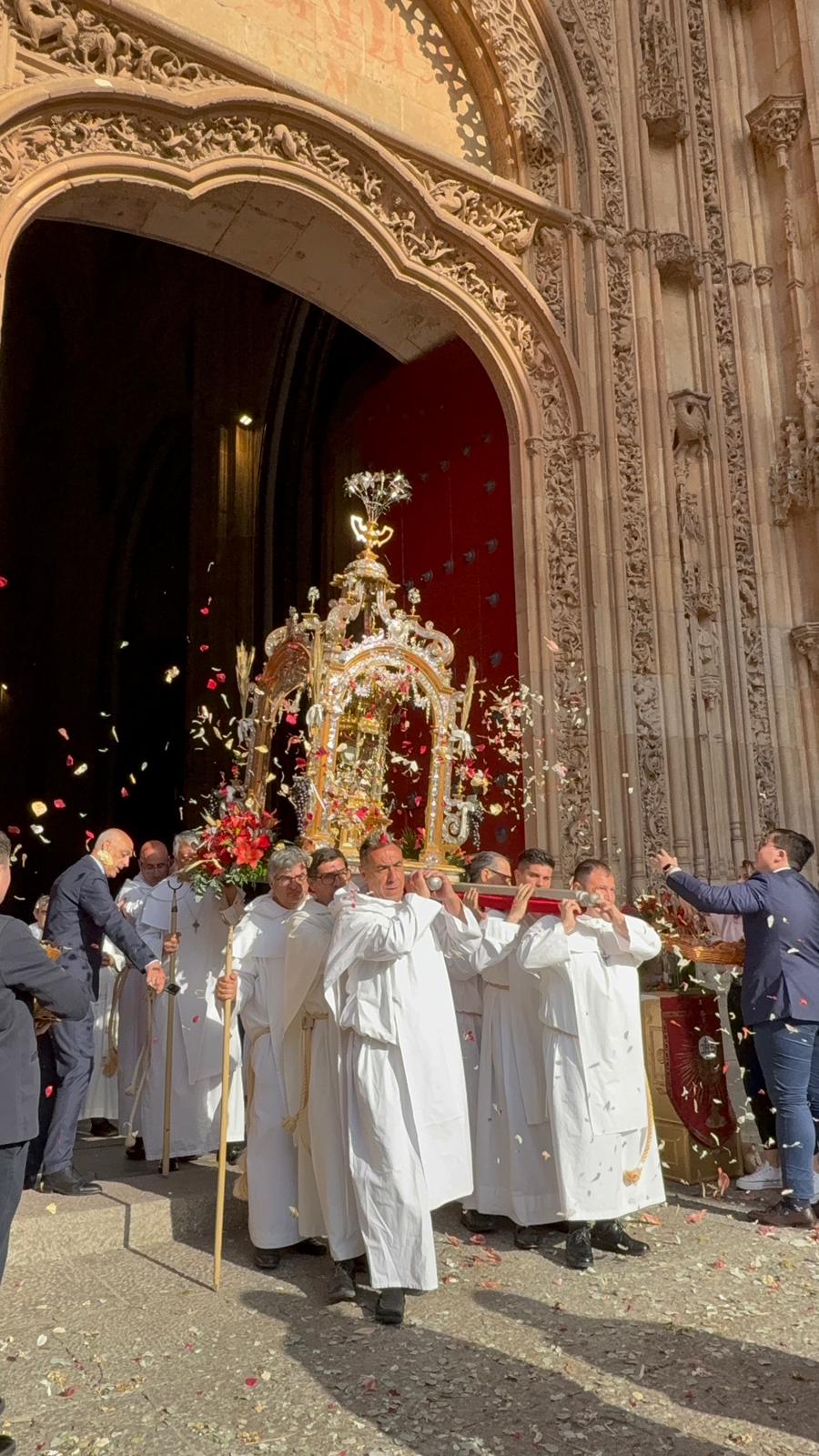 La procesión que siguió a la misa fue un testimonio silencioso de la fe del pueblo salmantino. “No fue un desfile ni un espectáculo, sino una peregrinación tras las huellas del Pan de Vida“, apuntaron antes de su inicio, con un orden marcado por la tradición: la cruz y los ciriales, los fieles de las parroquias, los dinamismos pastorales, cofradías y hermandades, la adoración nocturna, los religiosos, el símbolo basilical, los niños de comunión, y la campana sonaba desde el tintinábulo antes del paso de la custodia por los tres altares montados en diferentes puntos por cofradías, hermandades y congregaciones penitenciales.