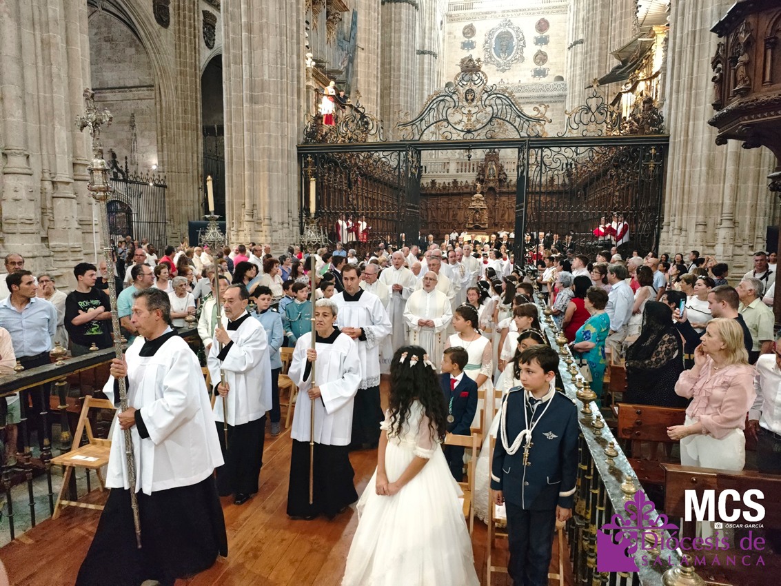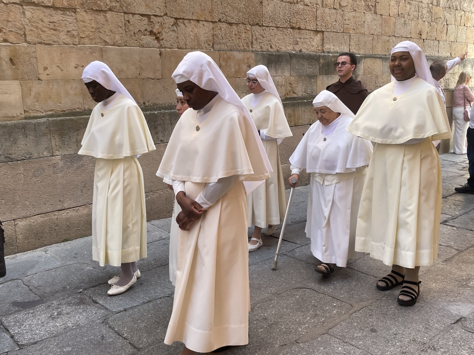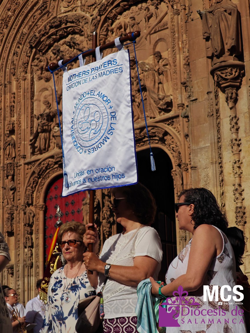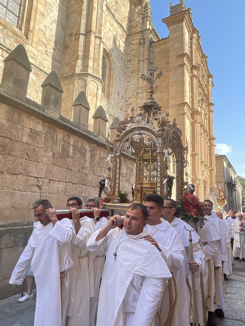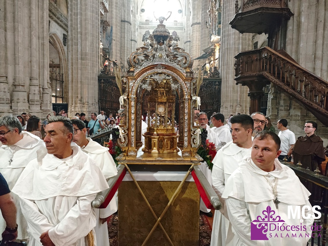 La procesión que siguió a la misa fue un testimonio silencioso de la fe del pueblo salmantino. “No fue un desfile ni un espectáculo, sino una peregrinación tras las huellas del Pan de Vida“, apuntaron antes de su inicio, con un orden marcado por la tradición: la cruz y los ciriales, los fieles de las parroquias, los dinamismos pastorales, cofradías y hermandades, la adoración nocturna, los religiosos, el símbolo basilical, los niños de comunión, y la campana sonaba desde el tintinábulo antes del paso de la custodia por los tres altares montados en diferentes puntos por cofradías, hermandades y congregaciones penitenciales.