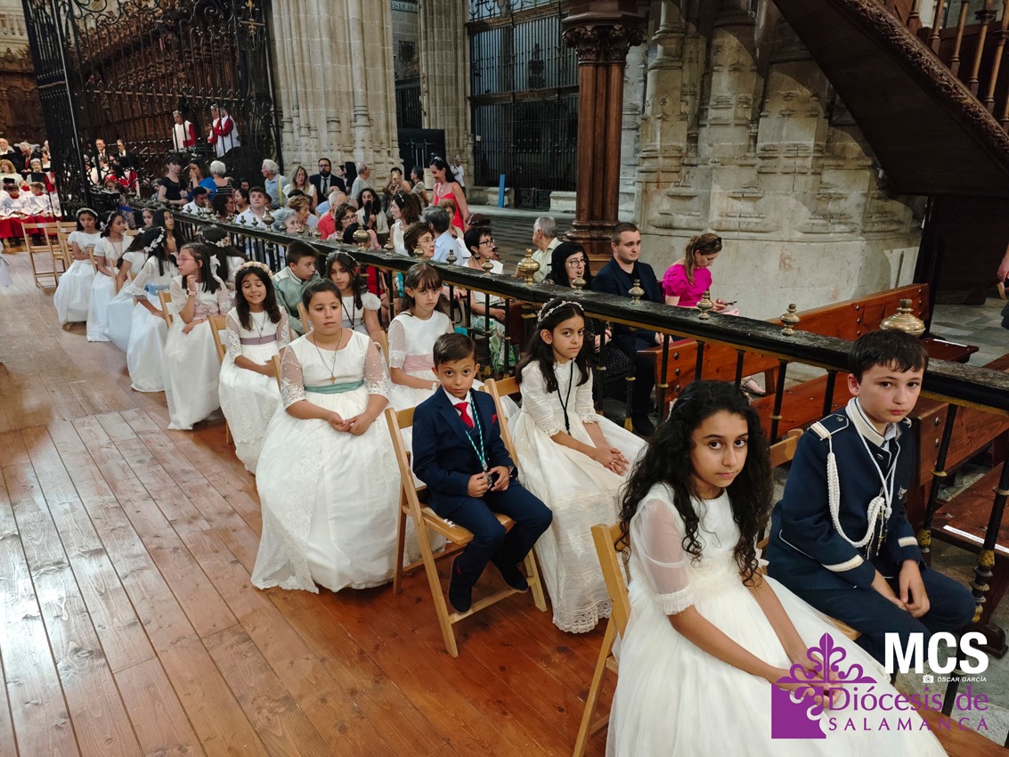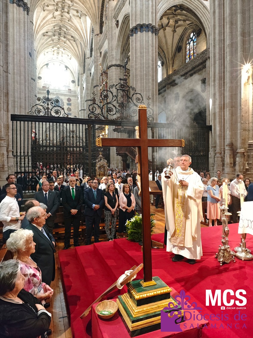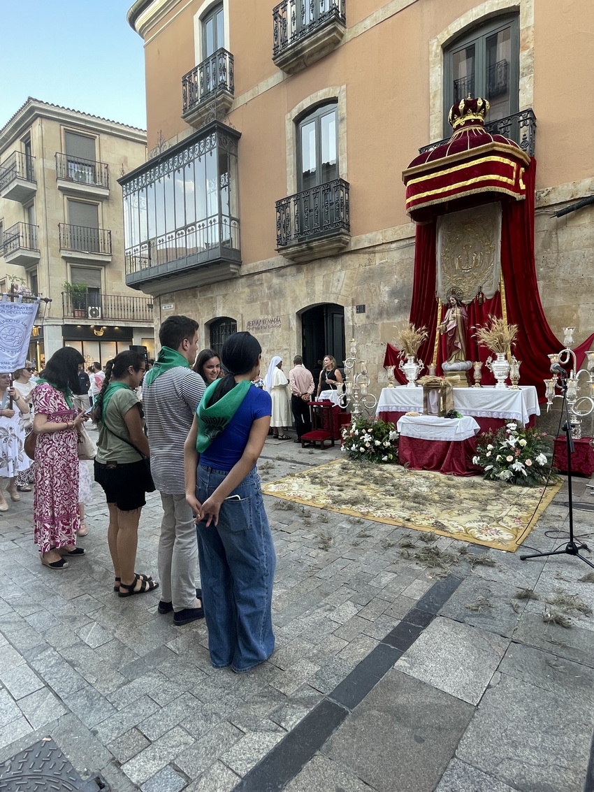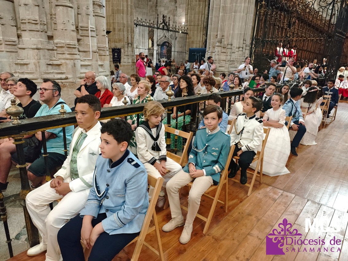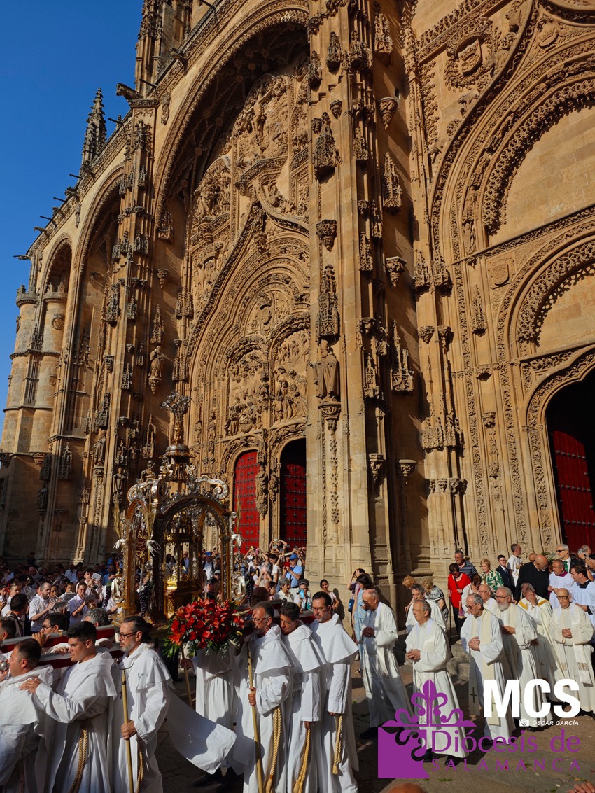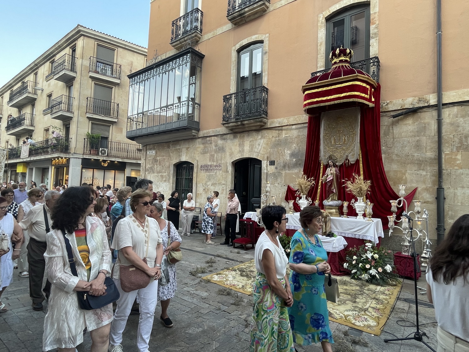 La procesión que siguió a la misa fue un testimonio silencioso de la fe del pueblo salmantino. “No fue un desfile ni un espectáculo, sino una peregrinación tras las huellas del Pan de Vida“, apuntaron antes de su inicio, con un orden marcado por la tradición: la cruz y los ciriales, los fieles de las parroquias, los dinamismos pastorales, cofradías y hermandades, la adoración nocturna, los religiosos, el símbolo basilical, los niños de comunión, y la campana sonaba desde el tintinábulo antes del paso de la custodia por los tres altares montados en diferentes puntos por cofradías, hermandades y congregaciones penitenciales.