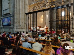 Las peticiones de la oración de los fieles fueron proclamadas por participantes del centro Ranquines que Cáritas coordina en los Padres Paúles, donde reflejaron esa realidad de sufrimiento y necesidad que interpela al corazón creyente: las guerras, las injusticias, los excluidos… Y con una súplica común: “Que, comulgando tu cuerpo y sangre, seamos testigos del amor comprometido”.