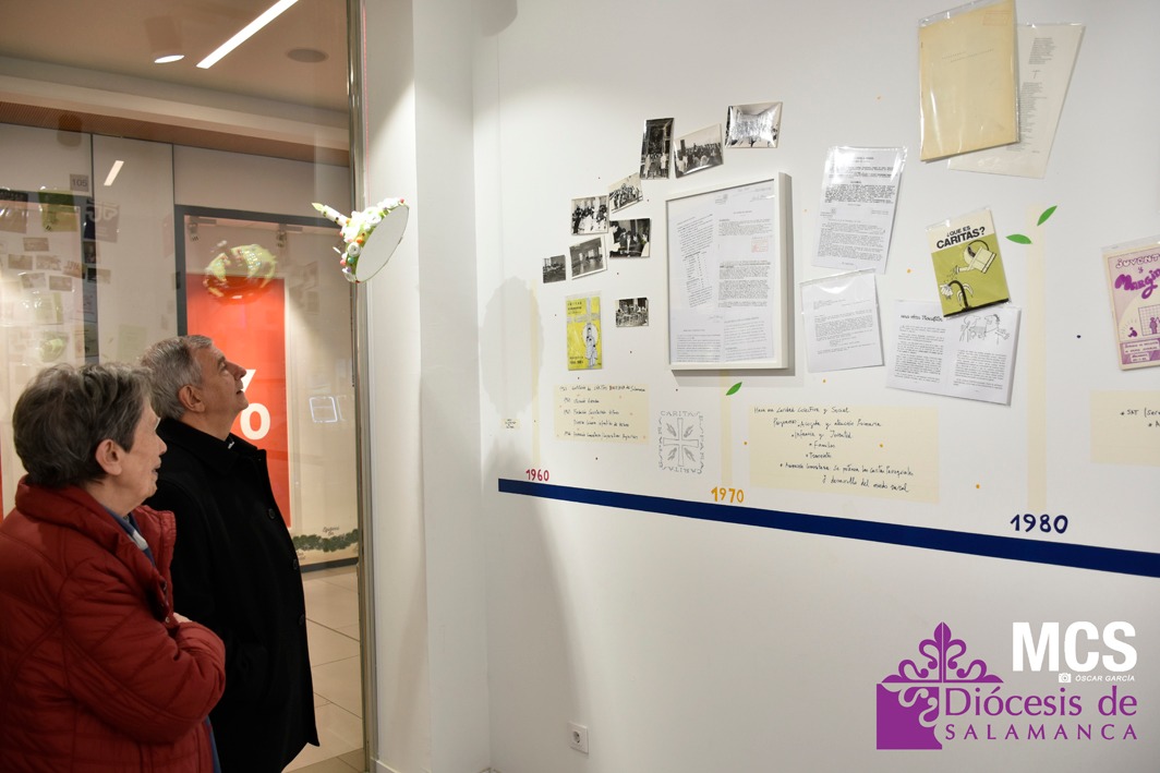 Acompañados por Cuca Gonzalo, gerente del centro comercial, María Palomino, directora técnica y Carmen Herrero, responsable de Marketing, se han dirigido a la primera planta para conocer la exposición de Cáritas Salamanca. A través de una línea del tiempo, la muestra repasa la historia y evolución de esta organización diocesana al servicio de los más vulnerables de Salamanca, desde su constitución en 1963 hasta la actualidad, a través de diferentes infografías, fotografías, revistas, folletos y memorias.