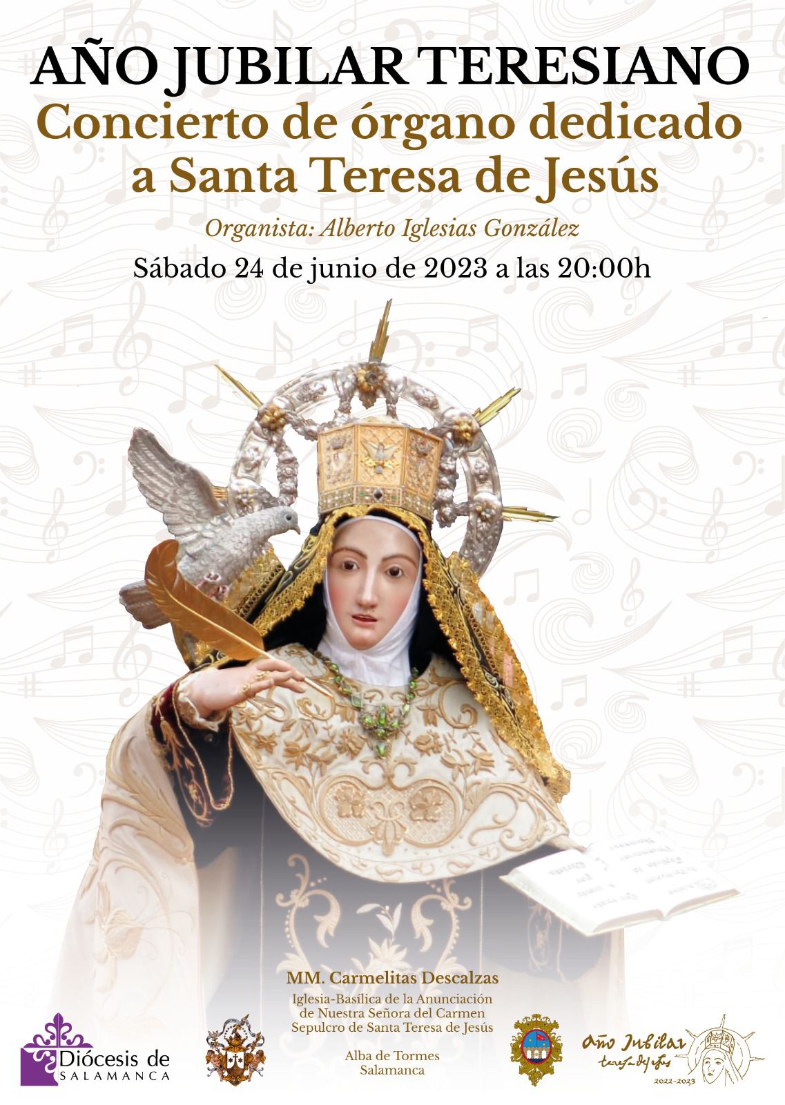 El organista litúrgico Alberto Iglesias González ofrecerá este sábado, 24 de junio, un recital dedicado a la patrona de la Diócesis de Salamanca, Santa Teresa de Jesús, enmarcado en el programa cultural del Año Jubilar Teresiano de Alba de Tormes. El concierto dará comienzo a las 20:00 horas, en la iglesia del Monasterio de la Anunciación de Nuestra Señora del Carmen, de las Carmelitas descalzas y uno de los dos templos jubilares de la villa ducal.