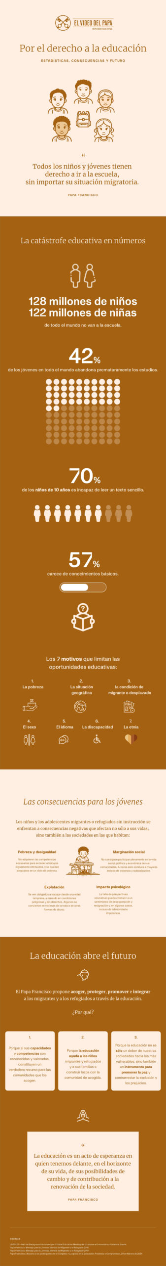 Francisco recalca que la educación no solo abre las puertas a un futuro mejor, sino que puede salvar a los menores migrantes y refugiados de la discriminación, las redes de delincuencia y la explotación. “No olvidemos nunca que quien acoge al forastero, acoge a Jesucristo“, añade.
