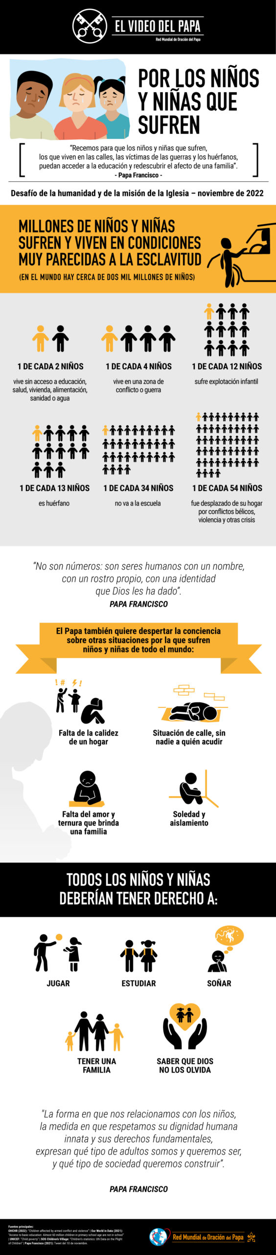 El mensaje de El Video del Papa clama por los derechos fundamentales de los niños, y pide rezar para que accedan a los servicios más básicos y al calor y amor de una familia: “No podemos permitir más que se sientan solos y abandonados; necesitan poder recibir una educación y sentir el amor de una familia para saber que Dios no los olvida”.