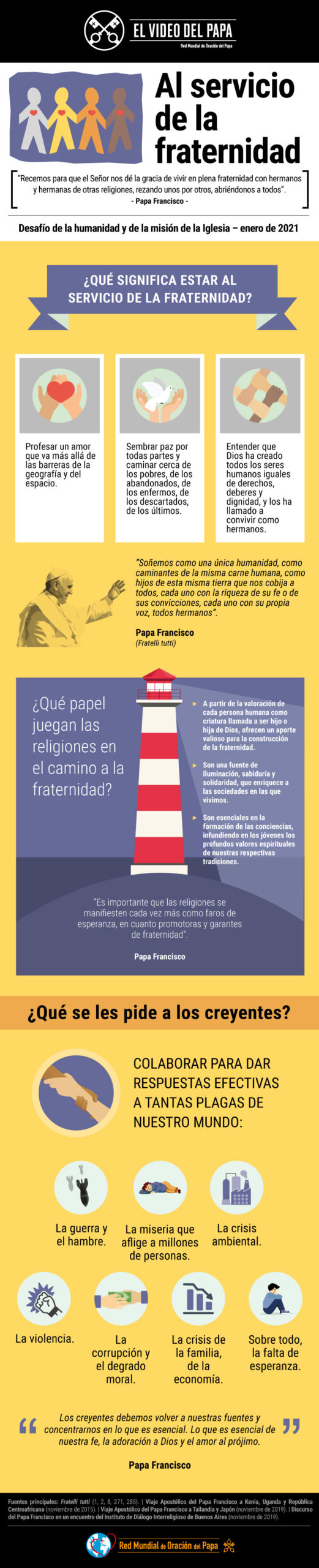 El jesuita P. Frédéric Fornos, director internacional de la Red Mundial de Oración del Papa, ha destacado la importancia de esta intención de oración que inaugura el 2021: “Después de un 2020 marcado por el impacto de la pandemia, tanto a nivel sanitario como a nivel socioeconómico, es especialmente importante que esta intención del Santo Padre nos ayude a vernos realmente más como hermanos y hermanas en el camino hacia la paz que se hace cada vez más necesario”. En este sentido, el P. Fornos recuerda que “para Francisco, el papel de las religiones en este propósito es fundamental, y dio un gran paso en este sentido cuando firmó el Documento sobre la Fraternidad Humana por la paz mundial y la convivencia común, junto al Gran Imán de Al-Azhar Ahmad Al-Tayyeb. Poco más de un año después, desarrolló más profundamente sus ideas en su última encíclica, Fratelli tutti, en especial en el capítulo 8: ‘Las distintas religiones, a partir de la valoración de cada persona humana como criatura llamada a ser hijo o hija de Dios, ofrecen un aporte valioso para la construcción de la fraternidad y para la defensa de la justicia en la sociedad’. Ojalá podamos, en el nombre de Dios que nos ha creado a todos iguales en derechos, deberes y dignidad, y que nos ha llamado a convivir como hermanos y hermanas, favorecer esta fraternidad para afrontar juntos los desafíos del mundo y de nuestra “casa común”. La fraternidad, que respeta y valora la diversidad, es el estilo del Reino de Dios”.