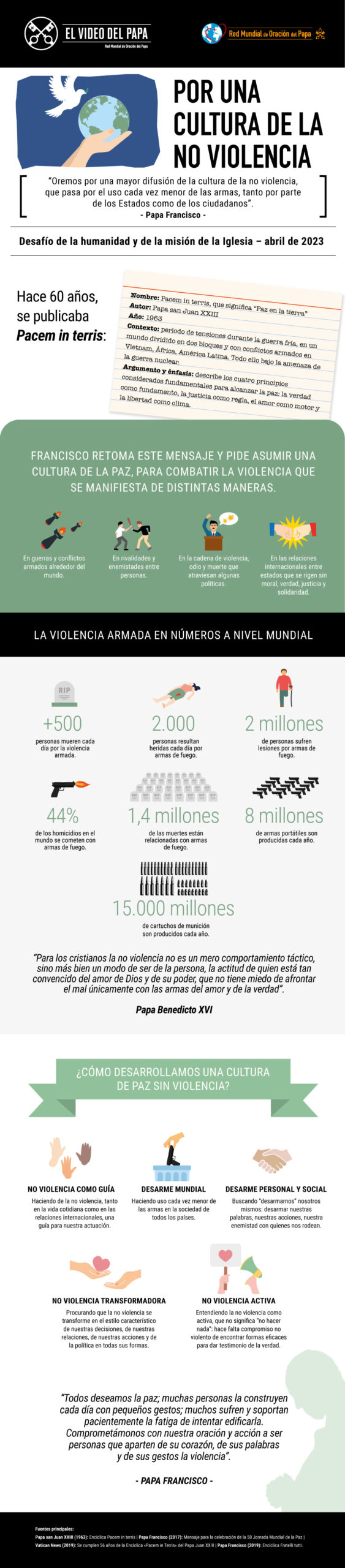 El vídeo concluye con una petición final de Francisco: “Hagamos de la no violencia, tanto en la vida cotidiana como en las relaciones internacionales, una guía para nuestra actuación”.