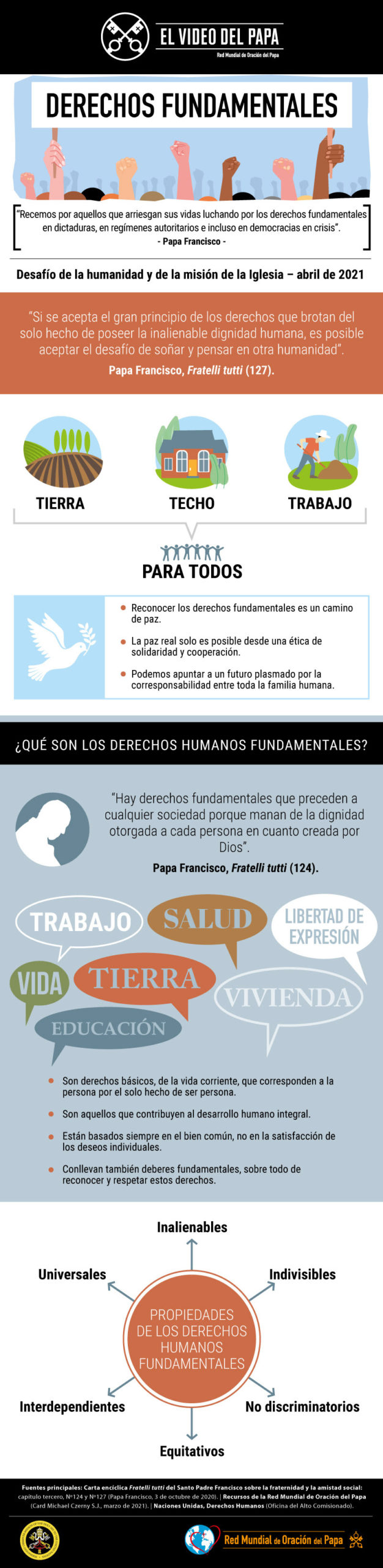 Por otro lado, el P. Frédéric Fornos S.J., Director Internacional de la Red Mundial de Oración del Papa, ha precisado que: “No es la primera vez que el Papa Francisco insiste en la importancia de los derechos fundamentales de las personas”. Y recuerda que en su última encíclica, Fratelli tutti, el Papa “denunciaba que ‘Mientras una parte de la humanidad vive en opulencia, otra parte ve su propia dignidad desconocida, despreciada o pisoteada y sus derechos fundamentales ignorados o violados’ (FT, 22)”.