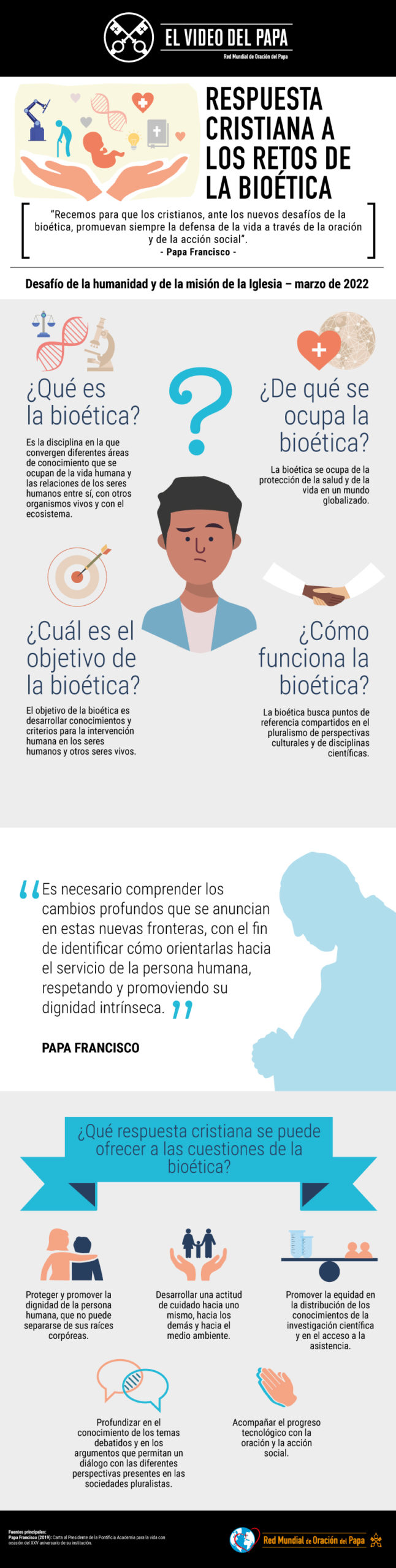 El Vídeo del Papa de marzo acaba de publicarse con la intención de oración que Francisco confía a toda la Iglesia Católica a través de la Red Mundial de Oración del Papa. Este mes el santo padre se centra en los retos de la bioética y plantea cómo responder a ellos desde la dignidad humana y la defensa de la vida. El vídeo se ha realizado con la colaboración de la Pontificia Academia para la Vida.