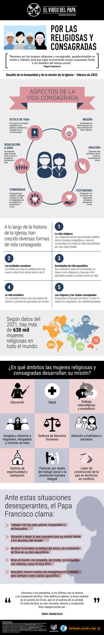 En su segunda intención de oración de 2022, el papa pide que recemos por ellas “para que puedan mostrar la belleza del amor y la compasión de Dios como catequistas, teólogas, acompañantes espirituales”. Asimismo, invita a luchar “cuando, en algunos casos, son injustamente tratadas, incluso dentro de la Iglesia; cuando su servicio que es tan grande se lo reduce a servidumbre”. Y prosigue, “no se desanimen. Sigan dando a conocer la bondad de Dios a través de las obras apostólicas que hacen. Pero sobre todo a través del testimonio de consagración”, recalca Francisco.