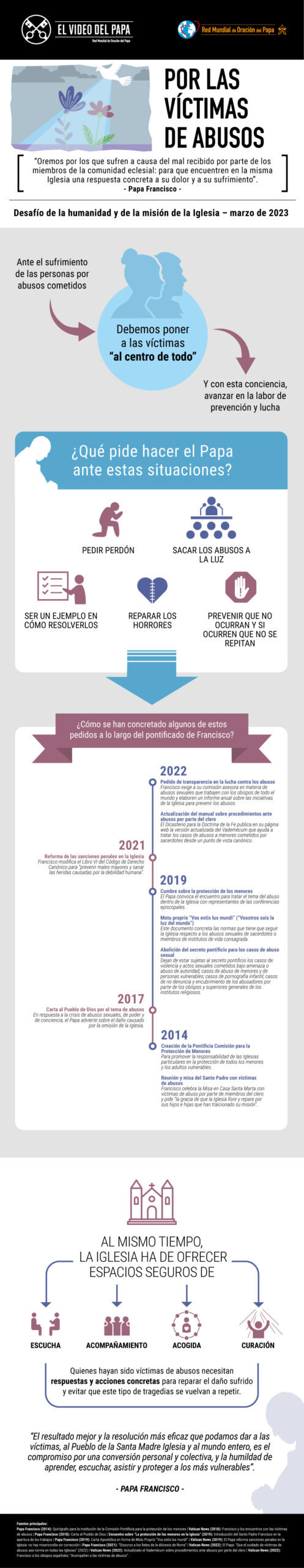 “Ante los abusos, especialmente cometidos por miembros de la Iglesia, no basta pedir perdón. Pedir perdón es necesario, pero no basta”, así de tajantes son las primeras palabras que pronuncia el papa Francisco al inicio del Video del Papa de marzo, en el que confía a toda la Iglesia católica su intención de oración para este mes.