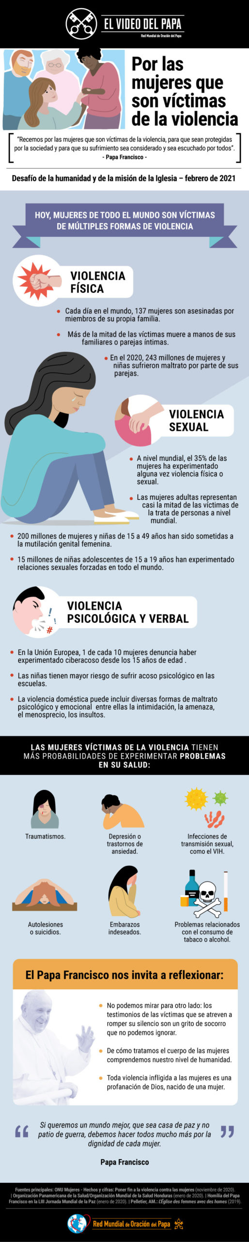 El P. Frédéric Fornos S.J., Director Internacional de la Red Mundial de Oración del Papa, hizo la siguiente observación sobre esta intención: “La llamada del Santo Padre es muy clara: ‘No podemos mirar para otro lado’. Es decir, no podemos quedar de brazos cruzados ante tantos casos de violencia contra las mujeres, que se manifiesta de múltiples formas, desde lo más visible e incalificable a lo más insidioso e inconsciente; en todos los casos, como producto de esquemas mentales y paradigmas culturales y sociales arraigados, que las desvalorizan”.