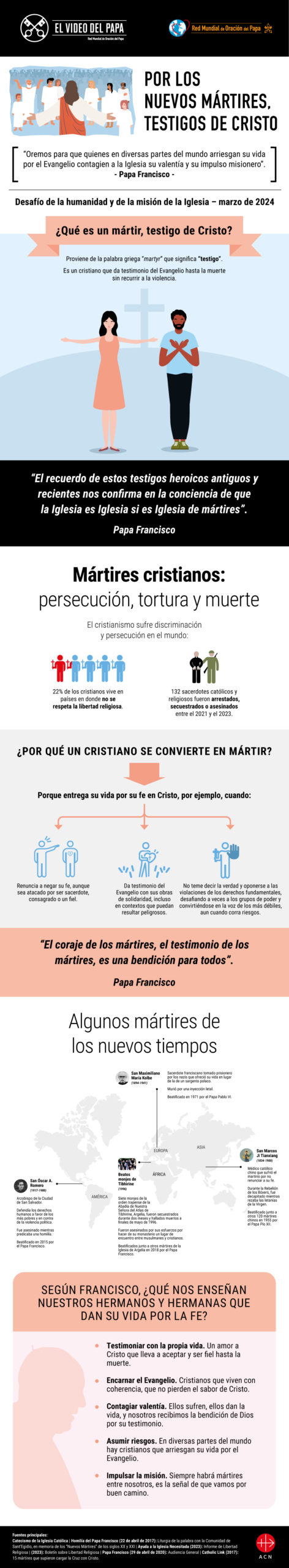 «El coraje de los mártires, el testimonio de los mártires, es una bendición para todos», asegura el papa Francisco en el nuevo Video del Papa de marzo, difundido por la Red Mundial de Oración por el Papa. El pontífice insta en él a a orar por los mártires contemporáneos que han sacrificado sus vidas por su fe. Este mes, la organización Ayuda a la Iglesia Necesitada respalda el mensaje, destacando la valentía de aquellos que han enfrentado persecuciones y violencia debido a su creencia.