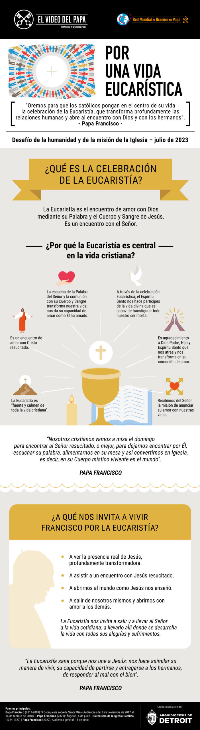 En este Video del Papa, Francisco explica “la lógica de la Eucaristía”, una que “nos da el valor de salir al encuentro, salir de nosotros mismos y abrirnos con amor a los demás”. Así también lo había indicado en un Ángelus de junio de 2021, cuando puso de manifiesto que Jesús, “en la culminación de su vida, no reparte pan en abundancia para alimentar a las multitudes, sino que se parte a sí mismo en la cena de la Pascua con los discípulos”. De alguna manera, siguió diciendo Francisco, Jesús nos muestra que “el objetivo de la vida es el donarse, que lo más grande es servir”. Por eso nos anima a encontrarnos con Él en la Eucaristía, porque allí se nos da la capacidad de amar a los demás, de dejarnos transformar por ella.