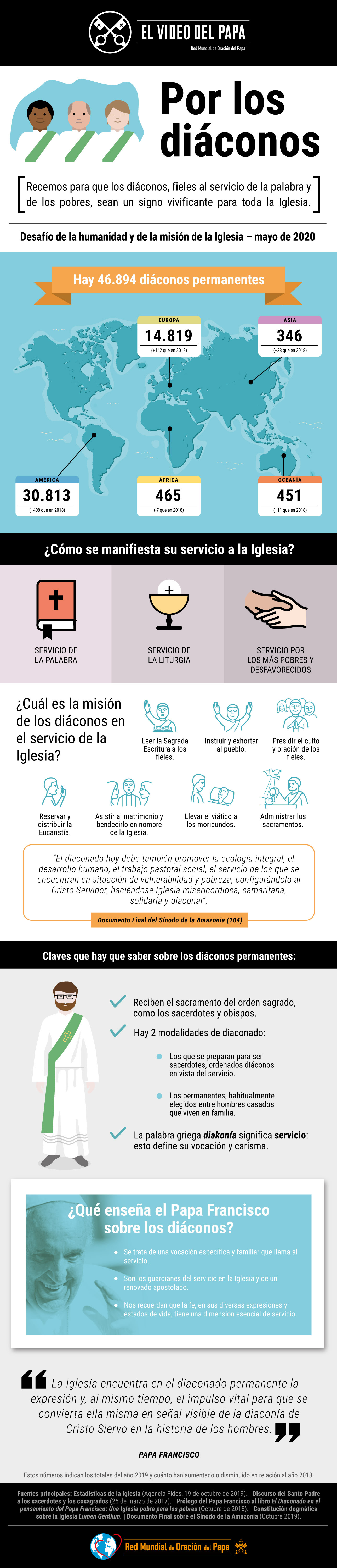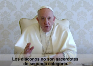 El nuevo vídeo se hizo público ayer, martes 5 de mayo. El pontífice señala en él que “los diáconos no son sacerdotes de segunda categoría. Forman parte del clero y viven su vocación en familia y con la familia. Están dedicados al servicio de los pobres que llevan en sí mismos el rostro de Cristo sufriente. Son los guardianes del servicio en la Iglesia”. Y solicita que “recemos para que los diáconos, fieles al servicio de la palabra y de los pobres, sean un signo vivificante para toda la Iglesia”.