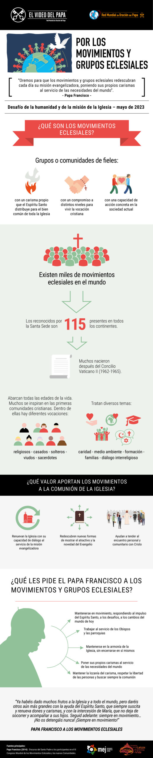 Los movimientos eclesiales “son la riqueza de la Iglesia”: hablan “lenguajes diferentes” y “parecen diferentes, pero es la creatividad que crea estas diferencias”. Así comienza Francisco El Video del Papa de mayo, que comparte la nueva intención de oración que se confía a toda la Iglesia Católica a través de la Red Mundial de Oración del Papa. La reflexión del Santo Padre de este mes está dedicada a los movimientos y grupos eclesiales, que “renuevan la Iglesia con su capacidad de diálogo al servicio de la misión evangelizadora”.