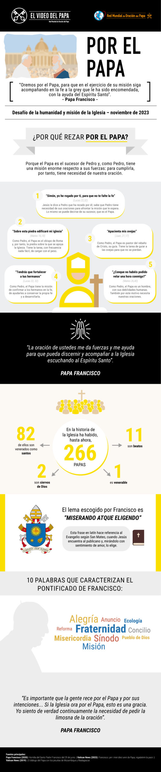 Desde el inicio, Francisco ha dado una gran importancia a la oración, pidiendo rezar por él, pero también por los desafíos de la humanidad y de la misión de la Iglesia. Es Francisco quien ha impulsado la recreación del Apostolado de la Oración como Red Mundial de Oración del Papa, haciendo de ella una Obra Pontificia, Fundación Vaticana. Es también el Santo Padre quien, desde 2016, ha realizado cada mes El Vídeo del Papa para hablar a los corazones de tantos e invitar a rezar.