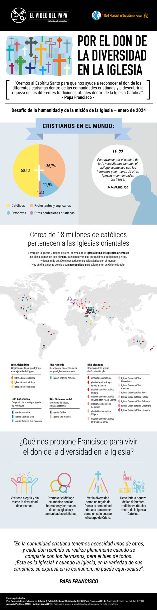 “No hay que tenerle miedo a la diversidad de carismas en la Iglesia.” La diversidad de carismas, de tradiciones teológicas y rituales, es algo positivo. Nunca debe ser causa de división. Al contrario, “hay que alegrarse de vivir esta diversidad”, explica el Papa en el mensaje con el que comenta la intención de oración que propone para el mes de enero de 2024.