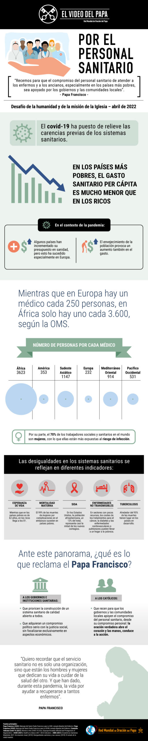 El contexto de la pandemia ha mostrado las carencias de los sistemas sanitarios y la desigualdad en el acceso a los tratamientos adecuados. En su mensaje para la intención de oración de abril, el papa Francisco ha señalado: “Esta pandemia también ha puesto en evidencia que no todos tienen acceso a un buen sistema sanitario público. Los países más pobres, los países más vulnerables, no pueden acceder a los tratamientos, necesarios para atender tantas y tantas enfermedades que siguen sufriendo”. Según el reporte “Panorama de la salud 2021” de la Organización para la Cooperación y el Desarrollo Económicos (OCDE), la mala situación del sistema sanitario ha impactado en la atención que reciben los enfermos. Entre los diferentes factores, la falta de personal sanitario ha sido más limitante que el número de camas de hospital o el equipamiento técnico.