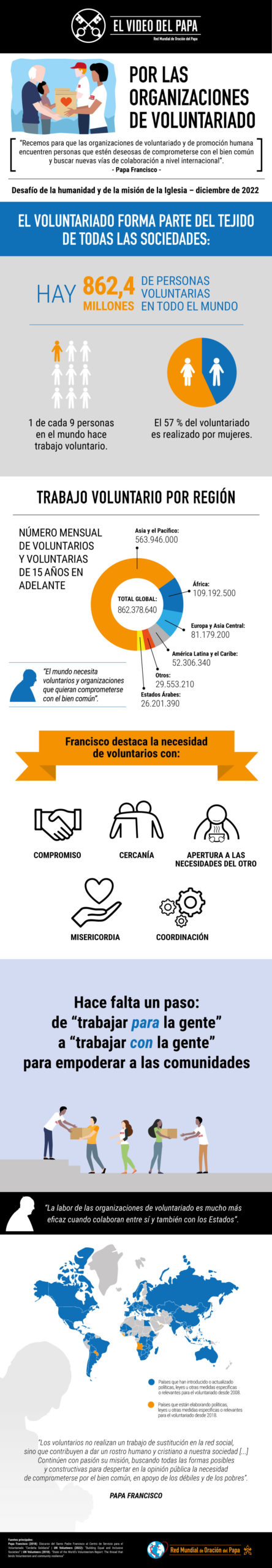 Este llamado que hace el santo padre destaca la labor de millones de organizaciones y asociaciones de voluntariado en el mundo, la mayoría de ellas muchas veces sin visibilidad o sin estar bajo alguna figura jurídica.