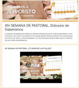 Bajo el título “Anunciar a Jesucristo, ayer, hoy y siempre ( hb 13,8). La dulce y confortadora alegría de evangelizar”, la Diócesis de Salamanca celebrará del 19 al 25 de septiembre la XIV edición de su Semana de Pastoral. Como es habitual, se han diseñado diversas propuestas a lo largo de esos días, algunas de ellas que requieren la participación más activa de la comunidad diocesana, como el caso de los talleres, denominados en esta ocasión, “comunicaciones pastorales”.