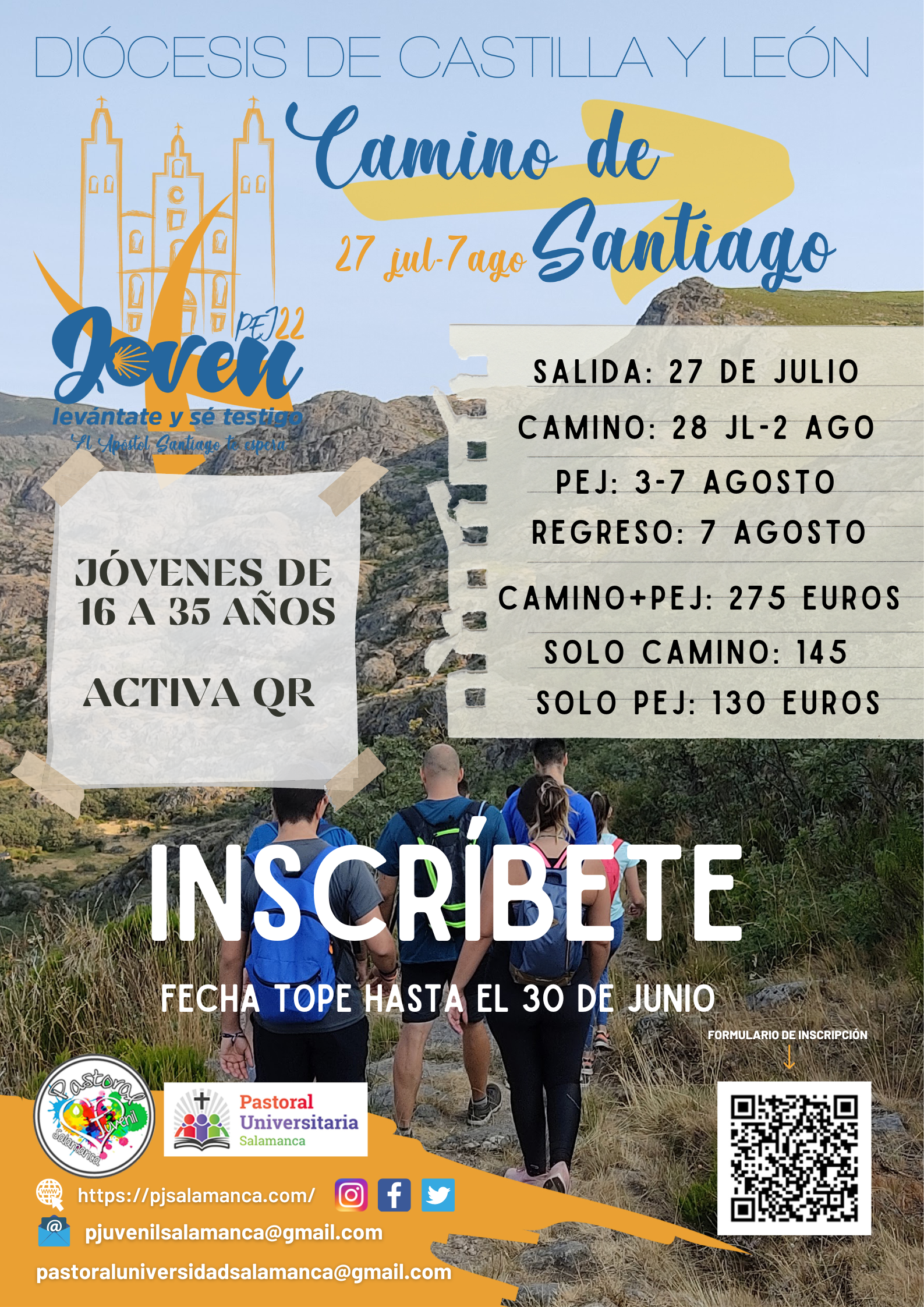 Como prólogo de la Peregrinación Europea de Jóvenes (PEJ), las diócesis de Castilla y León y Santander, a través de las delegaciones de Pastoral Juvenil, organizan el Camino de Santiago Joven, que se celebrará del 28 de julio al 2 de agosto, con cinco etapas entre Vigo y Santiago de Compostela. El plazo de inscripción finaliza el 30 de junio y se puede realizar a través de un formulario en este enlace.