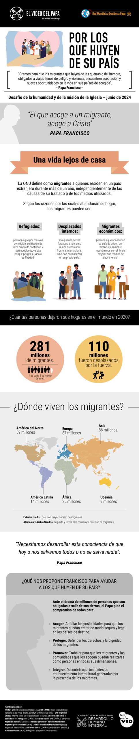 En los últimos años, el número de desplazados ha superado el de la Segunda Guerra Mundial. Según el Alto Comisionado de las Naciones Unidas para los Refugiados (ACNUR), durante el 2023 unos 110 millones de personas fueron desplazadas por la fuerza en todo el mundo. En este contexto, Francisco pide que a los migrantes se los acompañe, promueva e integre.