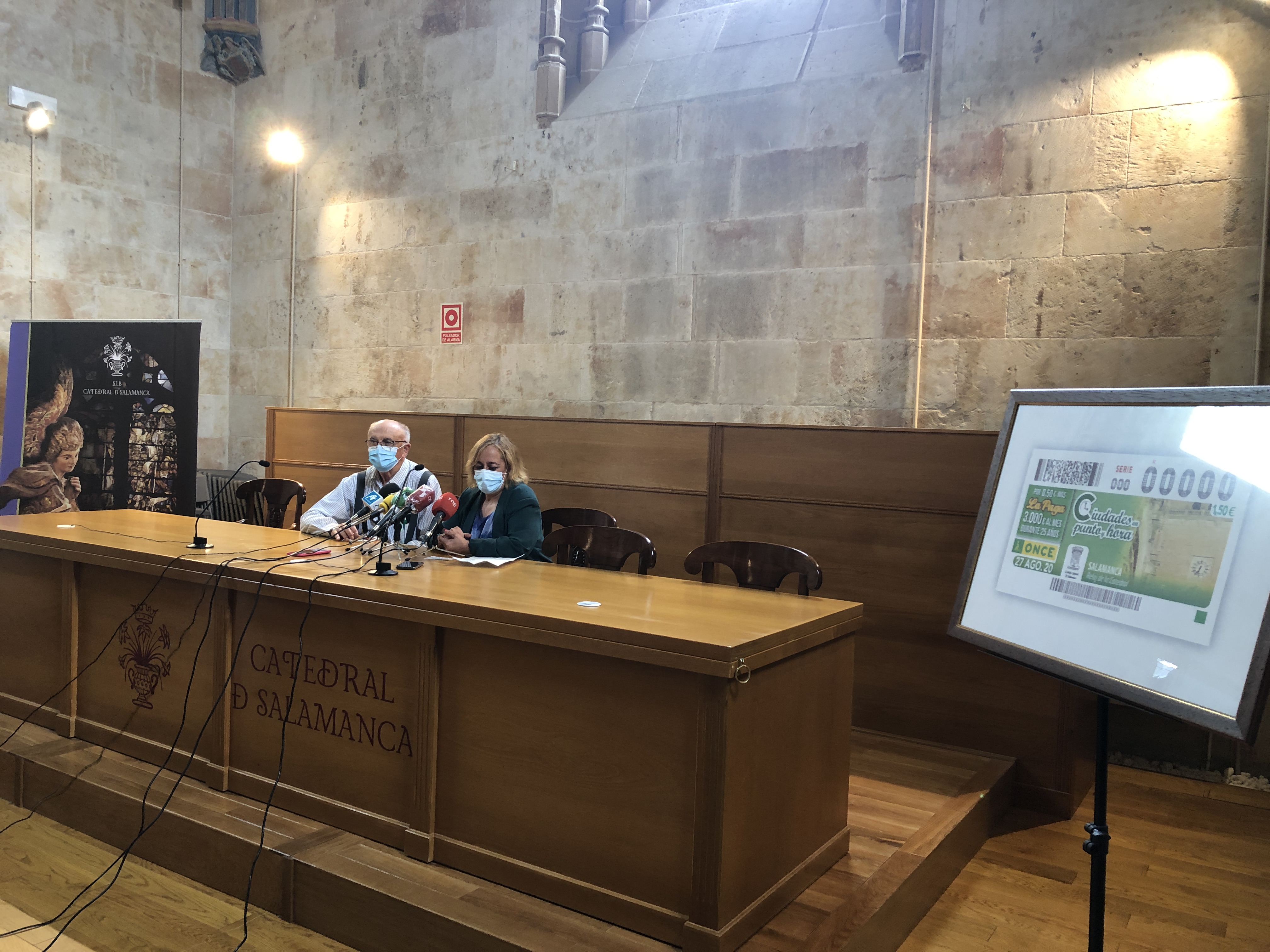 El reloj de la torre de la Catedral Nueva será la imagen del cupón de la ONCE del sorteo del próximo 27 de agosto, dentro de la serie ‘Ciudades en Punto y Hora’. La directora de la ONCE en Salamanca, María Ángeles Ruano, y el canónigo de la Catedral, Antonio Matilla, han presentado el cupón en la capilla de Santa Catalina.