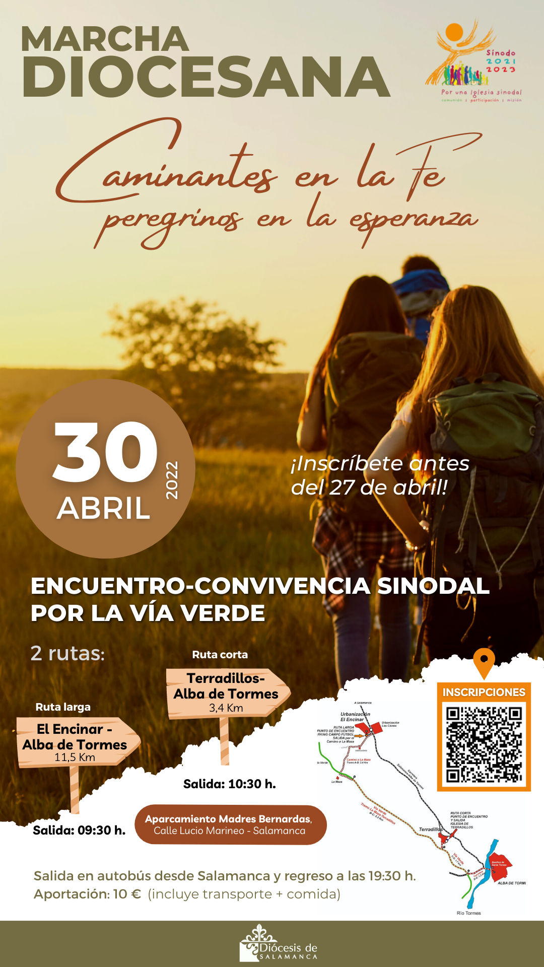 Este presbítero insiste en la oportunidad de vivir “una jornada preciosa en la fe”, en la esperanza de peregrinar y caminar juntos. El plazo de inscripción está abierto y finaliza el 27 de abril. Se puede formalizar a través de un formulario, en este enlace, o en la consejería de la Casa de la Iglesia (C/ Rosario, 18), o en el teléfono 923 12 89 00. El coste es de 10 euros, que incluye el desplazamiento en autobús y la comida en Alba de Tormes. El pago se realiza al número de cuenta de la Diócesis de Salamanca: ES79 0075 5701 260600078261.
